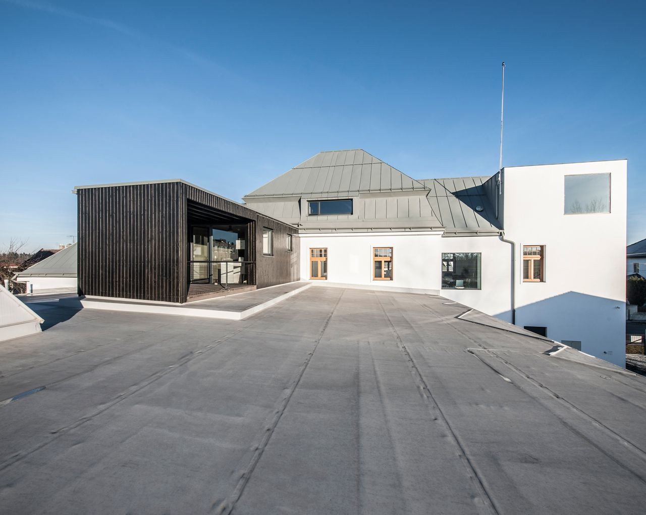 Mjölk architekti, Palmovka Jihlava / Rekonstrukce části průmyslového areálu Jihlavan, pohled na dřevěnou přístavbu kuchyňky, toalet a terasy – foto