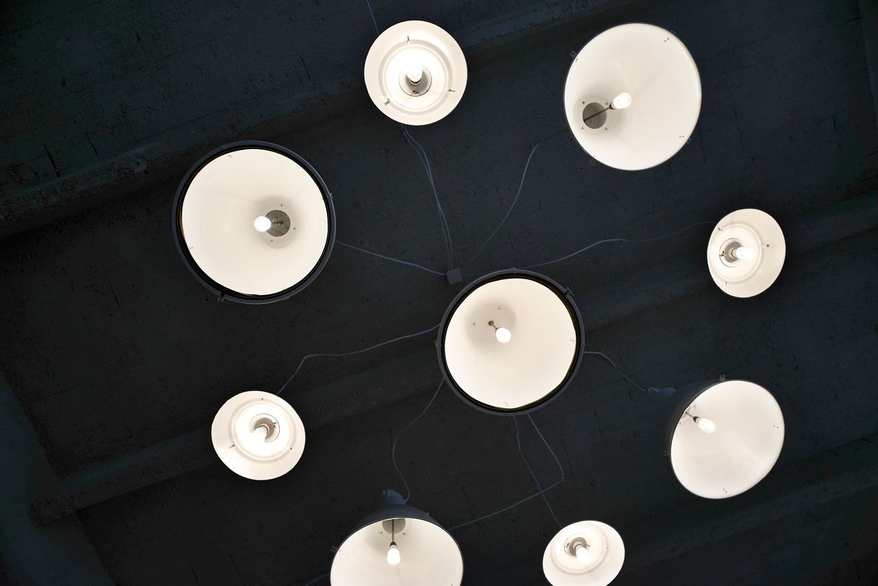 Mjölk architekti, Palmovka Jihlava / Rekonstrukce části průmyslového areálu Jihlavan, lustr vyrobený z repasovaných industriálních lamp – foto