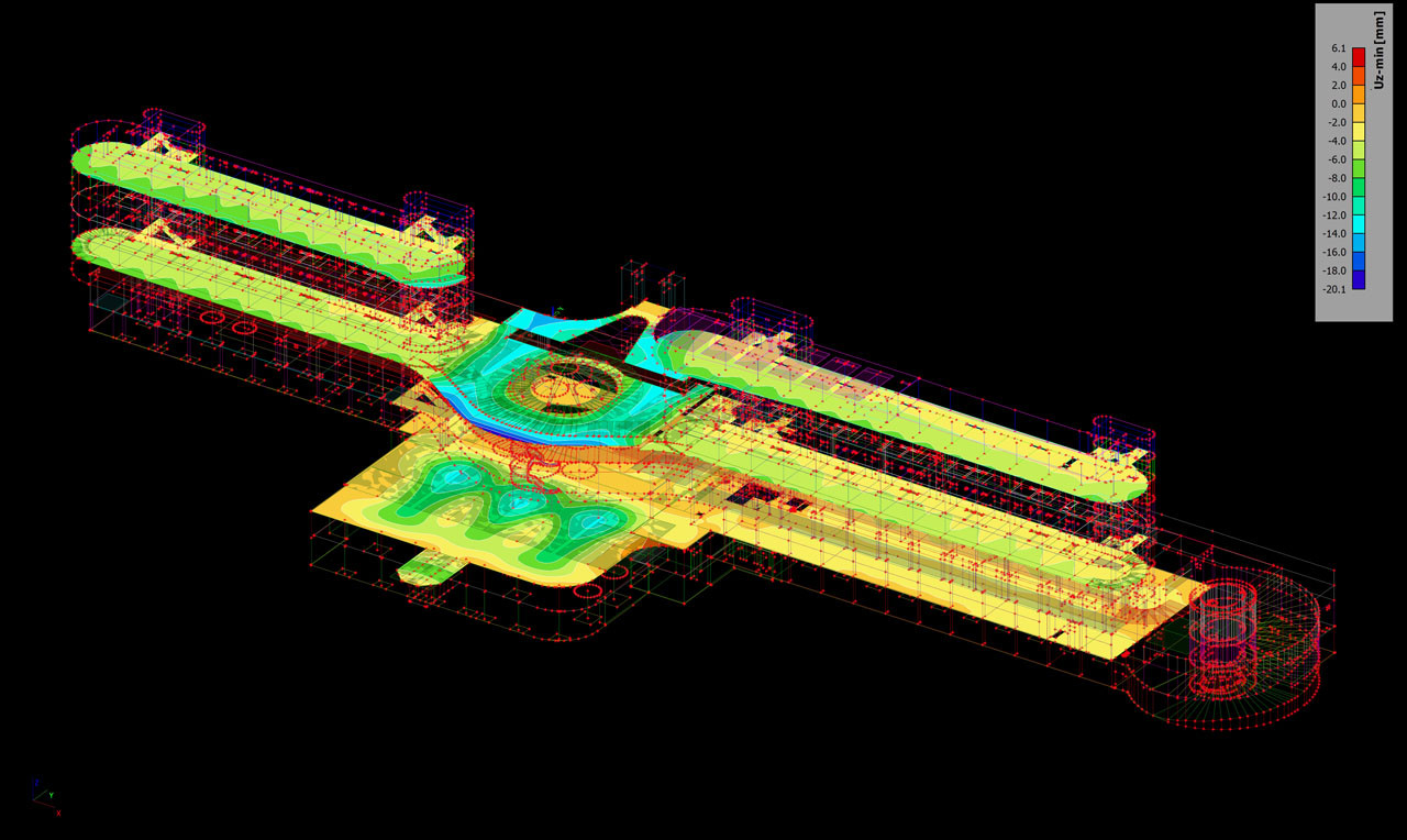 Konstrukční část projektu včetně statické části řešila Statika – Jihočeská stavebně konstrukční kancelář s.r.o. První oříšek pro projektový tým představovalo vyřešení založení stavby ve složitých základových podmínkách, které spočívalo v návrhu základů jednotlivých objektů na skalním a poloskalním podloží s různým stupněm zvětrání. Při výpočtech a modelech bylo rovněž nutné zohlednit seismicitu v lokalitě stavby. K dokonalé simulaci dané situaci sloužily projektovému týmu navíc pomocné výpočty na pružném podloží s modulem Soilin.