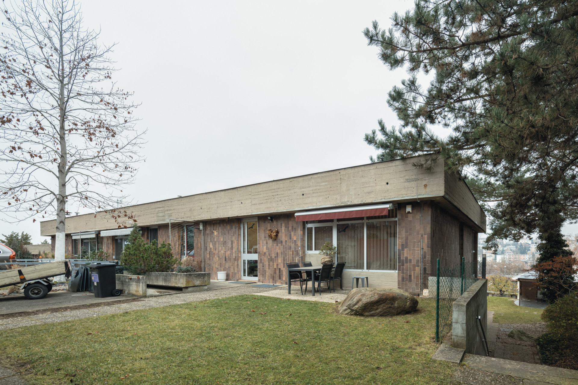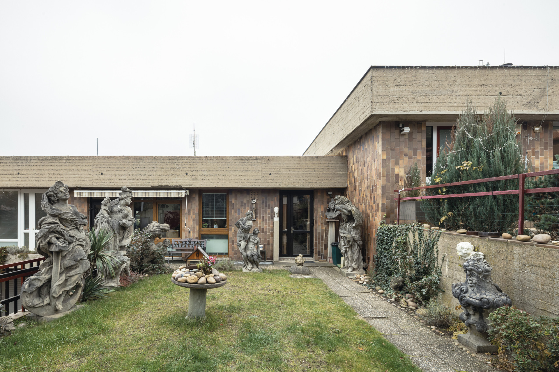 Soubor nezapře dobu svého vzniku na přelomu 60. a 70. let a rukopis svého tvůrce. Najdeme tu obnažené betony i obklad hnědým kabřincem.
