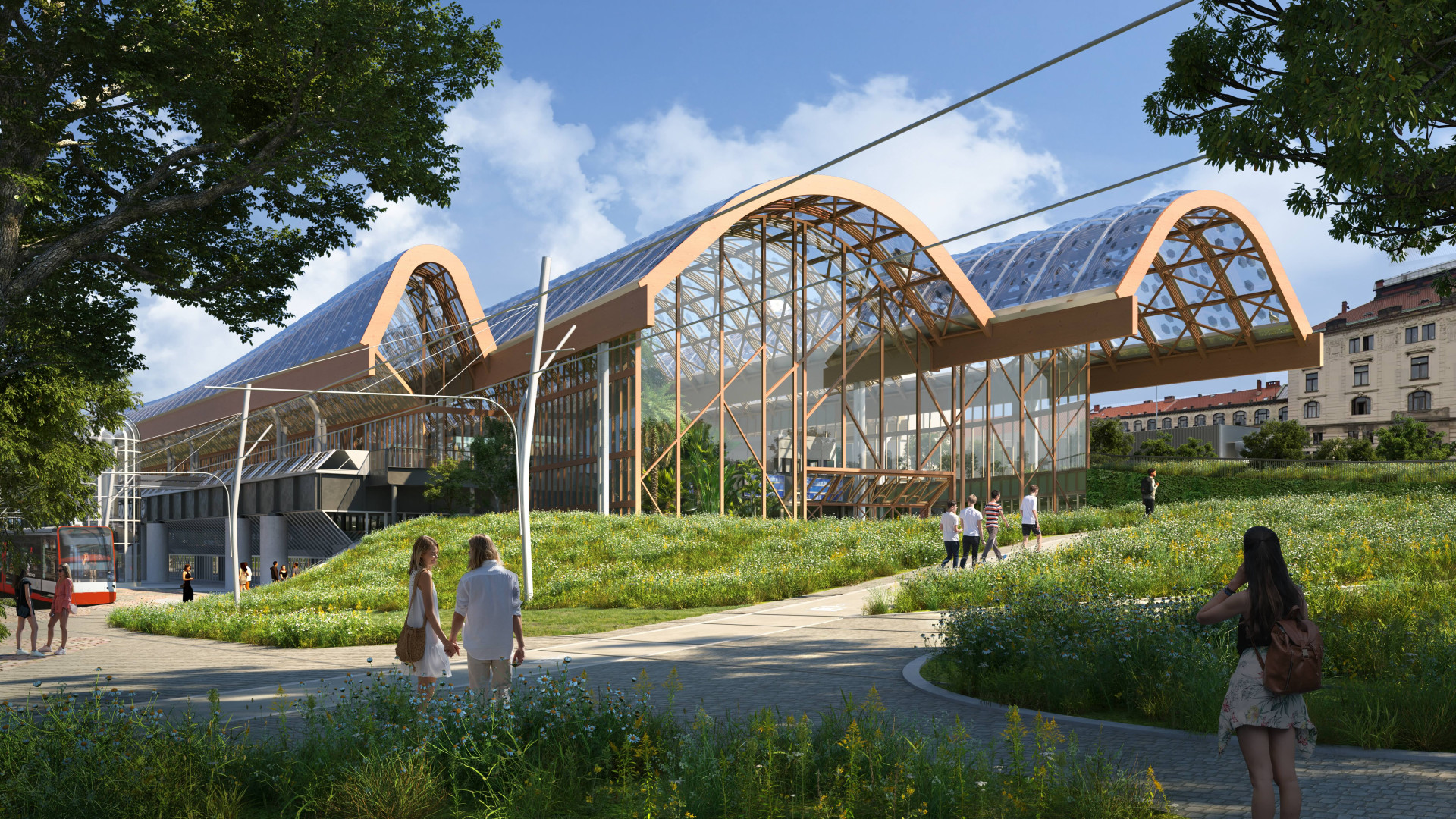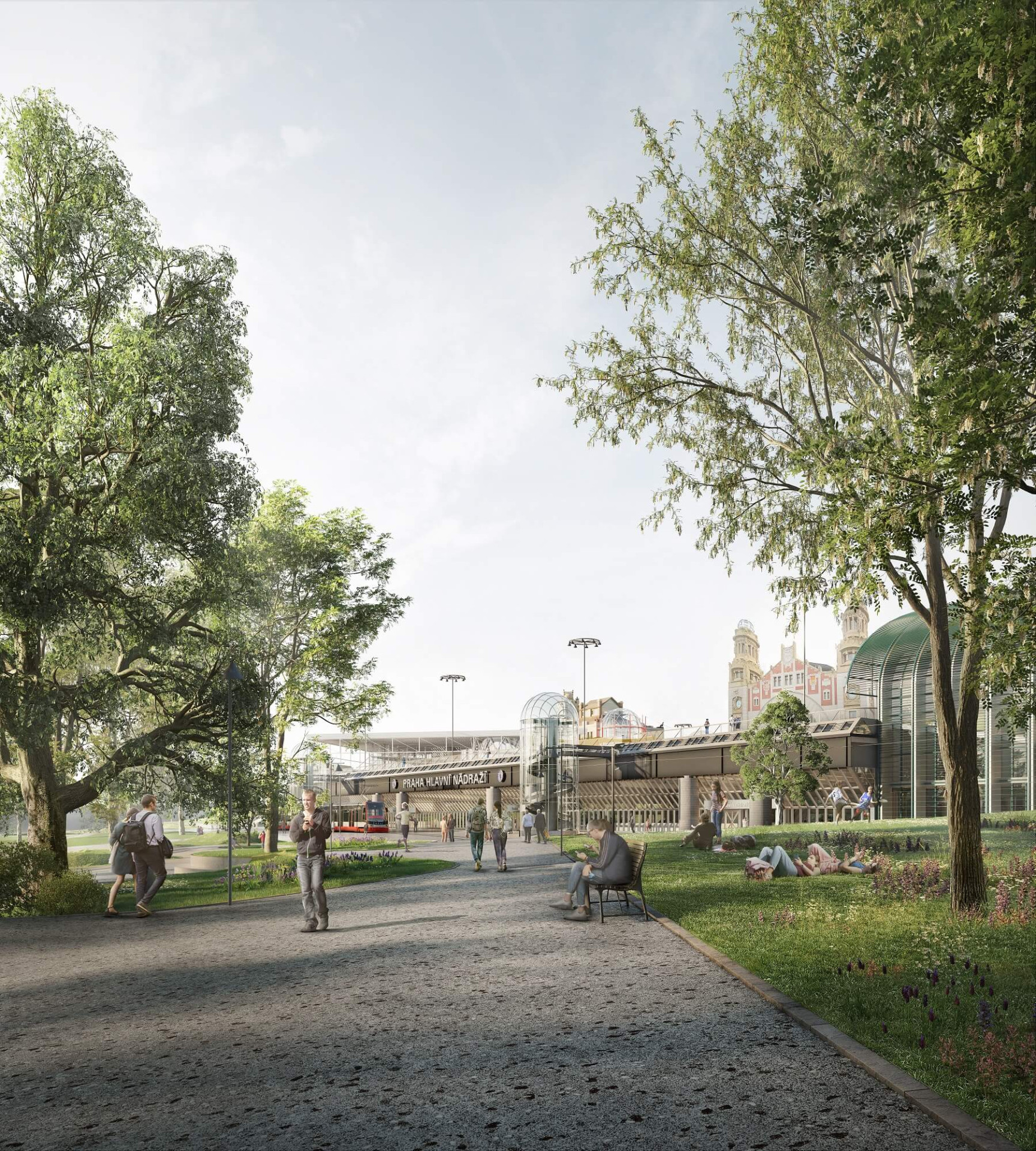Řešení tramvajové trati nevytváří bariéry v prostupnosti a stává se přirozenou součástí místa. Zastávky jsou součástí krytého veřejného prostoru odbavovací haly a toto řešení tak podporuje přestupní vazby. Tramvajová trať a zastávky tak nejsou „vedle” nádraží, jsou jeho přirozenou součástí, a i součástí parku.