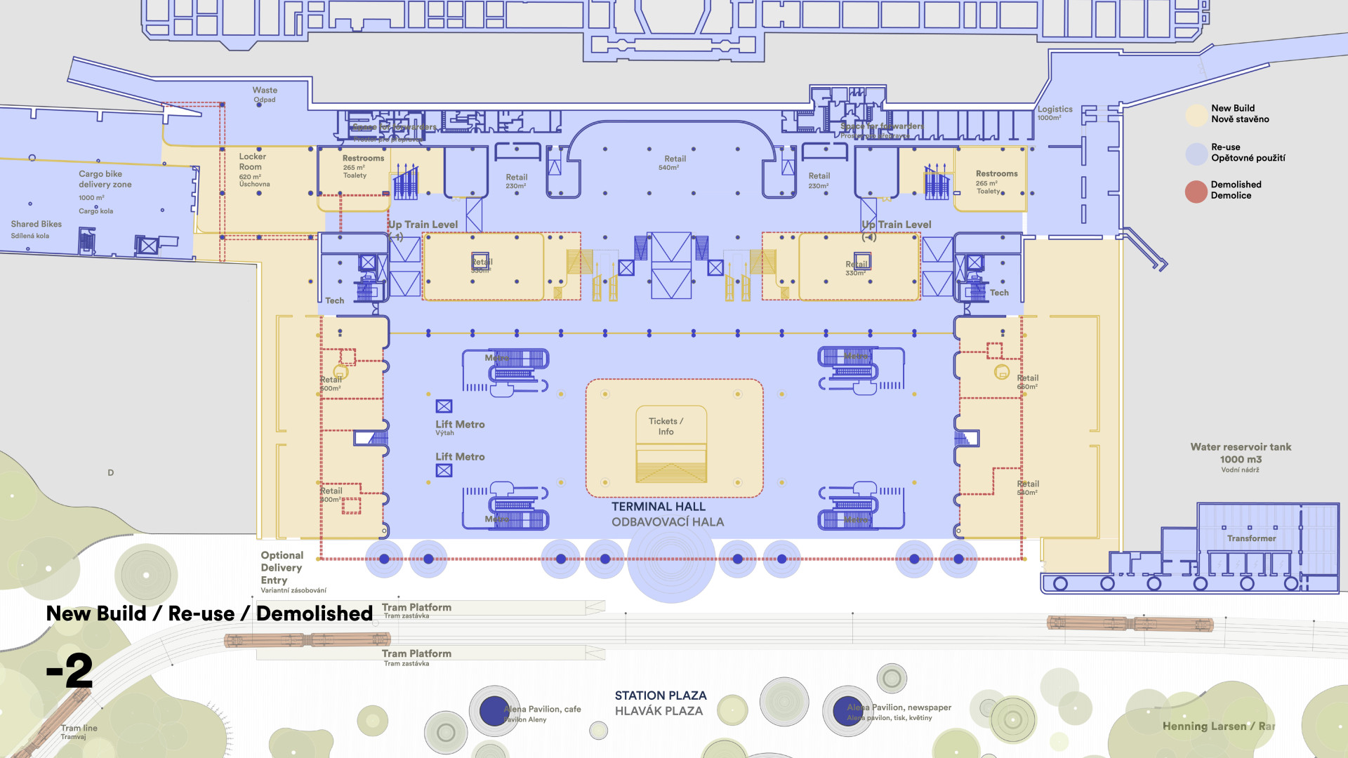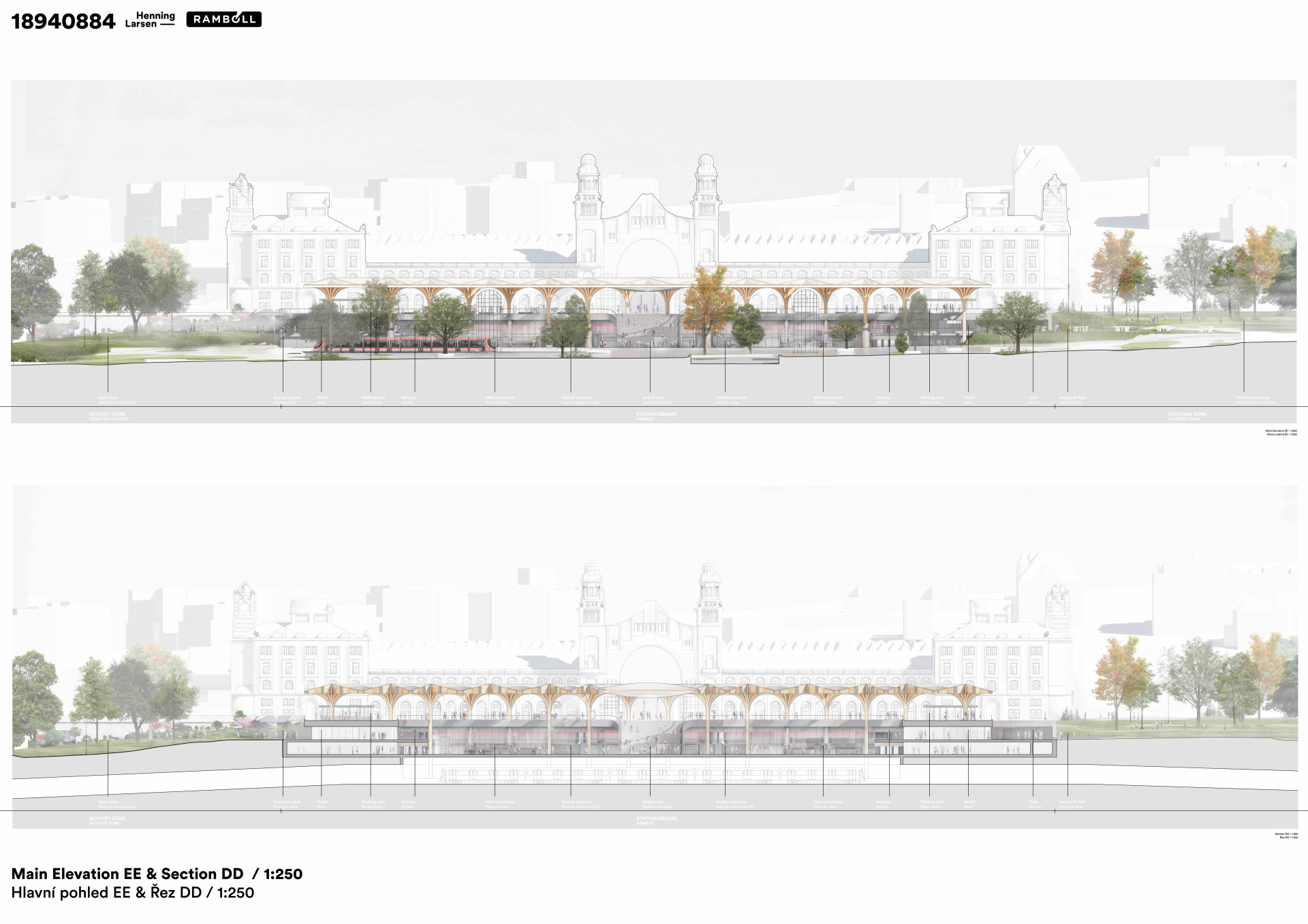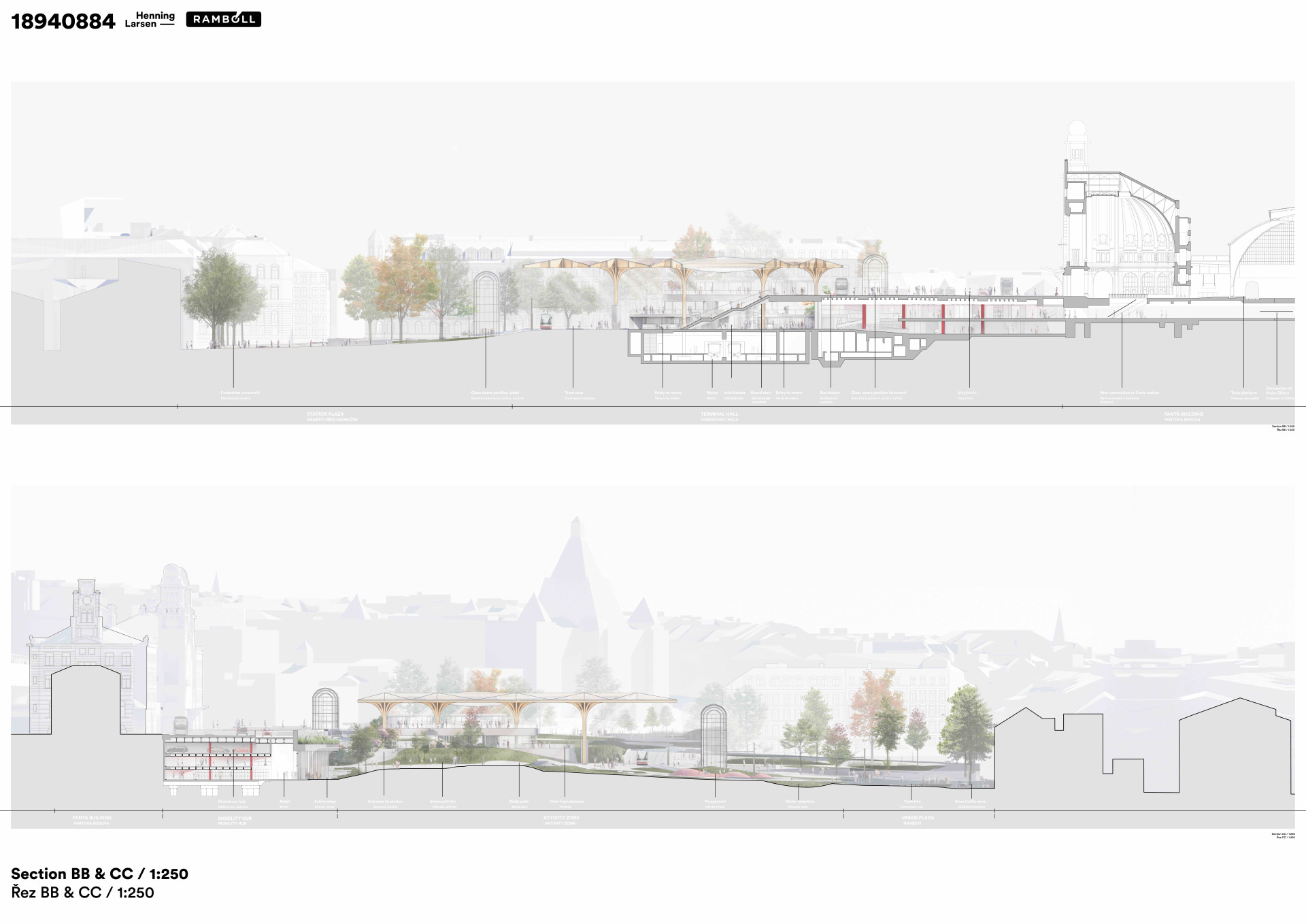 Princip vyzvednutí střechy a vytvoření zastřešeného veřejného prostoru, který na jedné straně plynule přechází do parku a na druhé do interiérové části haly s přístupem k vlakům, eliminuje jednotlivé bariéry a podporuje orientaci a přehlednost v území. Pozornost návštěvníků, cestujících, ale především obyvatel, tak směřuje do plynulého veřejného prostoru. Není roztříštěno mezi různé, problematicky propojitelné, stávající úrovně. Vzniká tak opravdový dopravní hub, který je natolik variabilní, že v budoucnu umožní bezproblémovou adaptaci Metra S a Metra D.