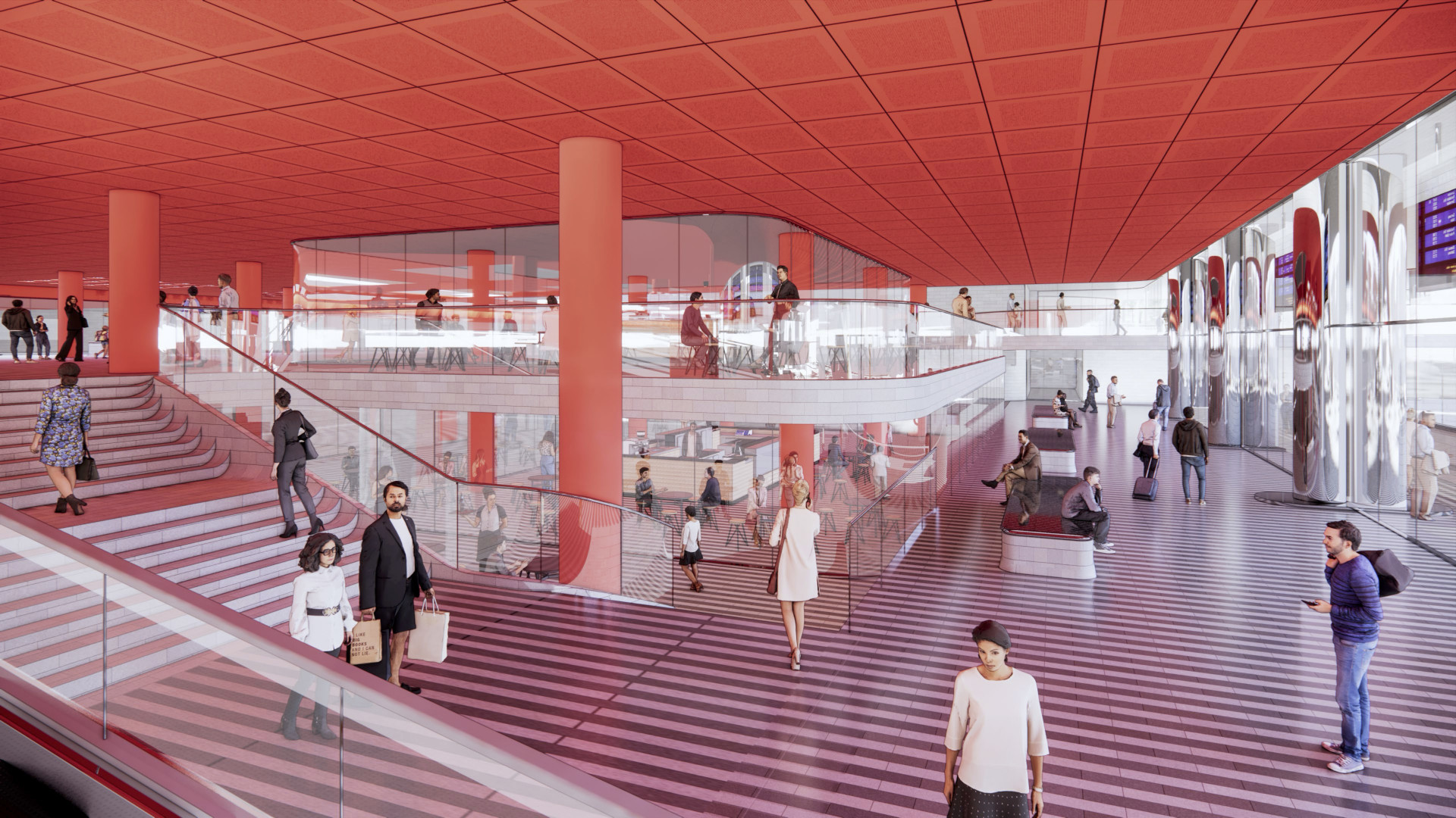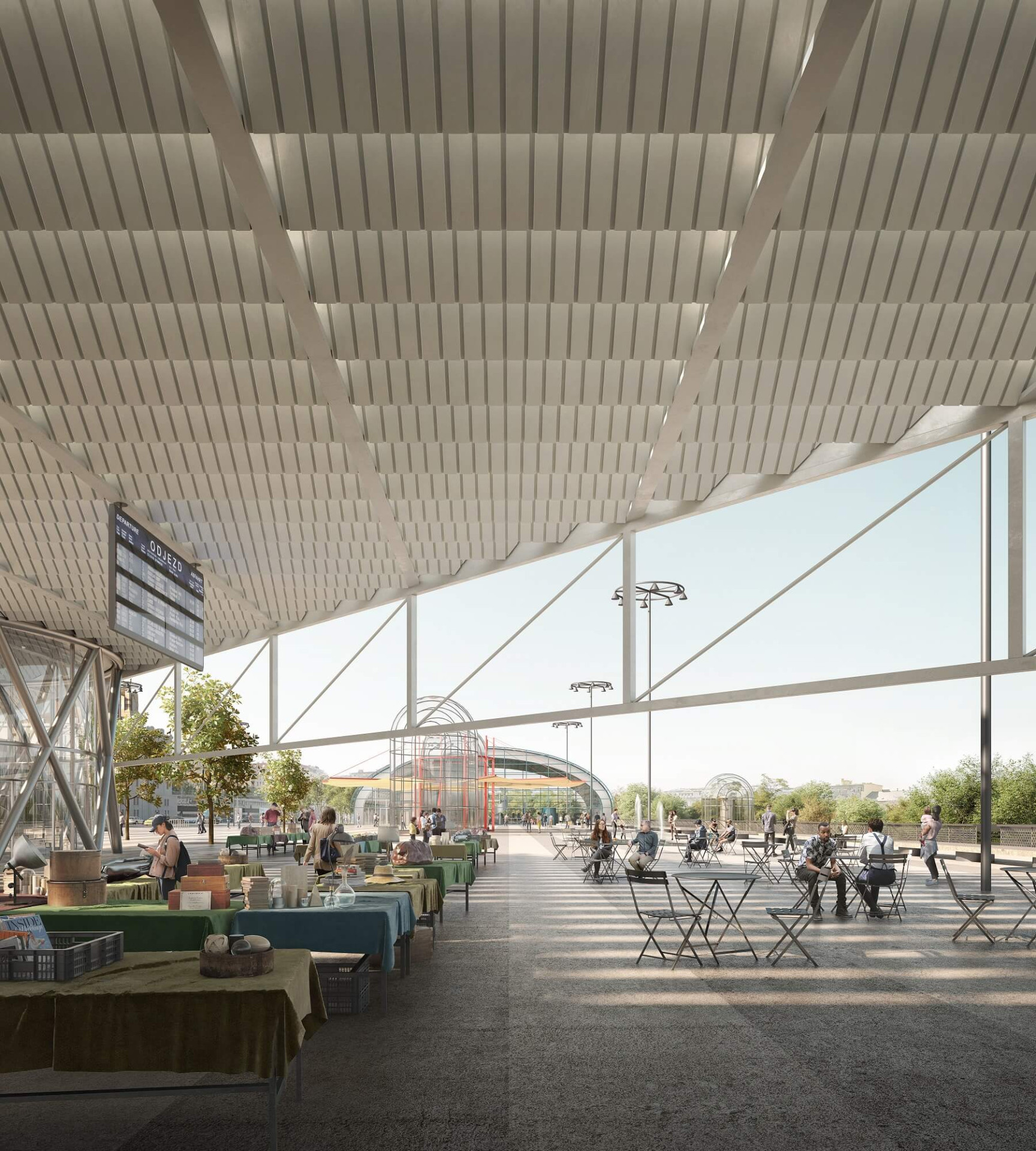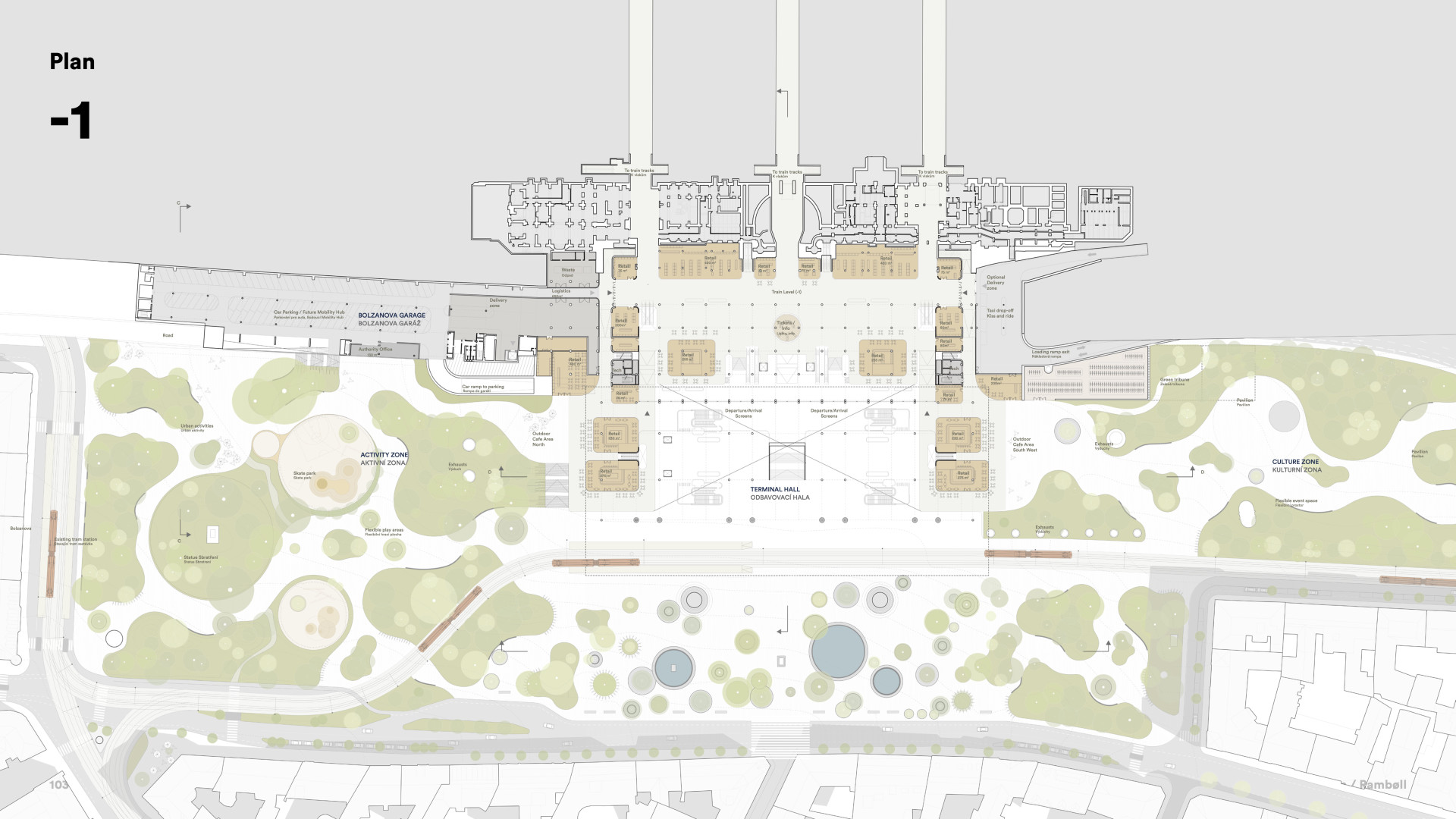 Princip vyzvednutí střechy a vytvoření zastřešeného veřejného prostoru, který na jedné straně plynule přechází do parku a na druhé do interiérové části haly s přístupem k vlakům, eliminuje jednotlivé bariéry a podporuje orientaci a přehlednost v území. Pozornost návštěvníků, cestujících, ale především obyvatel, tak směřuje do plynulého veřejného prostoru. Není roztříštěno mezi různé, problematicky propojitelné, stávající úrovně. Vzniká tak opravdový dopravní hub, který je natolik variabilní, že v budoucnu umožní bezproblémovou adaptaci Metra S a Metra D.