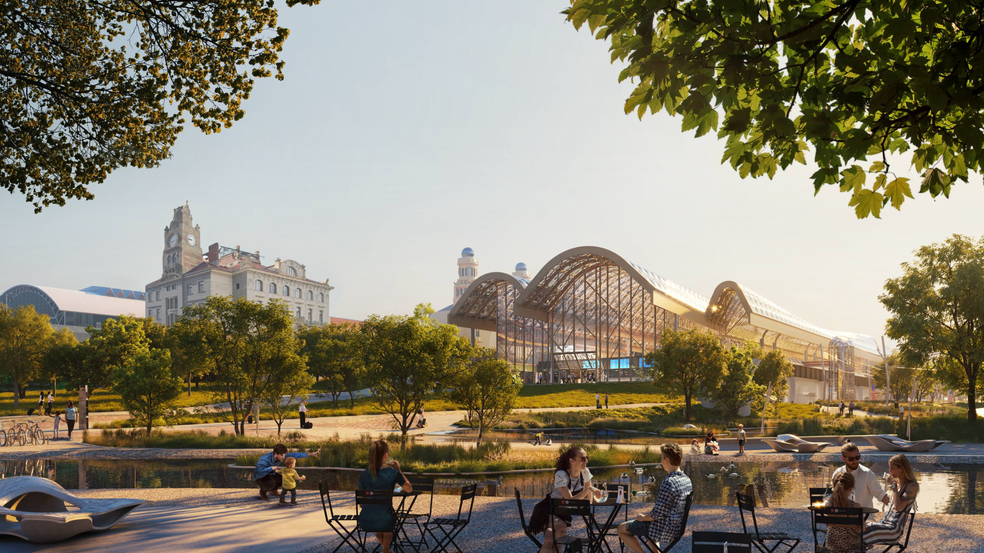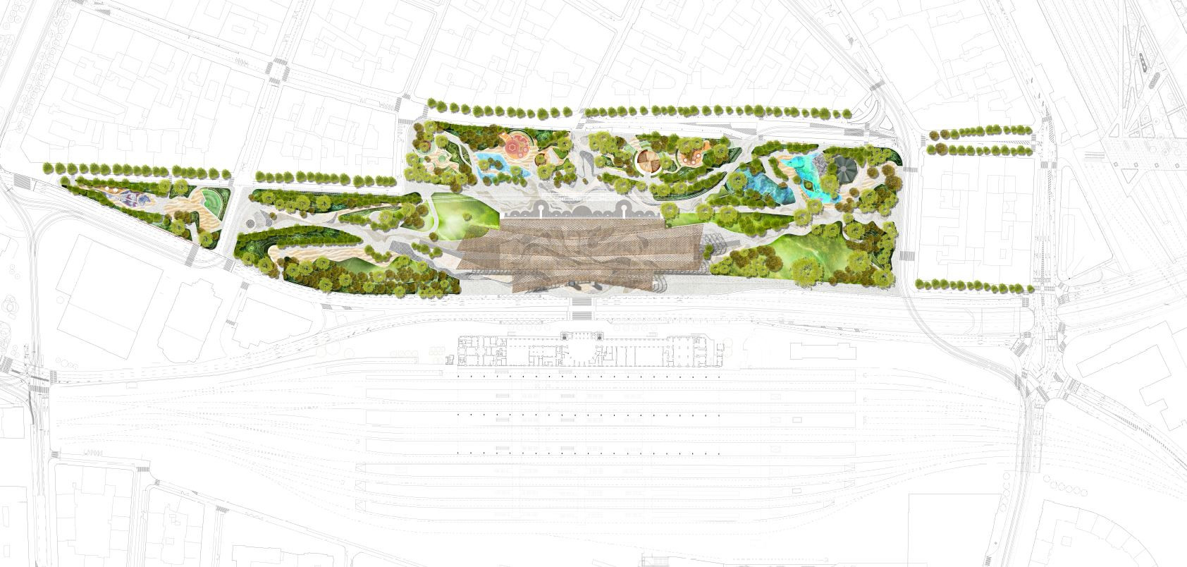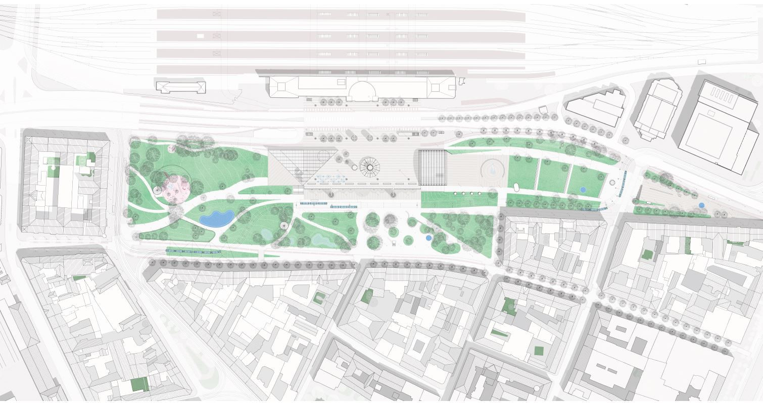 Otevřený přístup v případě řešení odbavovací haly se o to výrazněji projevuje v řešení parku. Ten se proměňuje ve veřejný městský prostor s dominantním podílem zeleně. Pracuje s hodnotnými stávajícími dřevinami, které vhodně doplňuje o novou výsadbu.