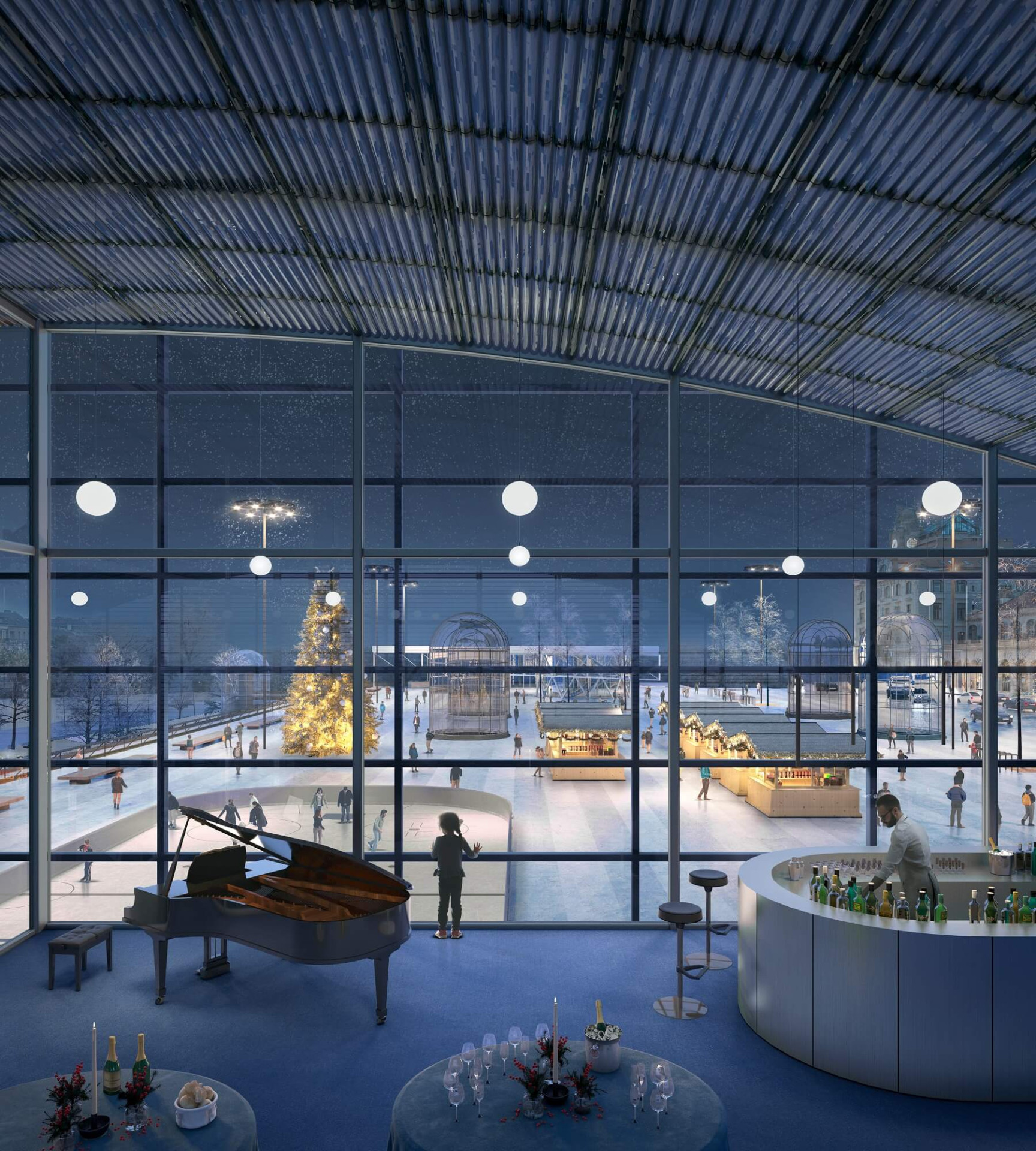 Tento přístup sice rozvíjí předprostor Fantovy budovy, nicméně stále zůstává výrazně odtržený od okolního parku a města a návštěvník tam musí jít téměř cíleně. Komise tento veřejný prostor vnímala problematicky především z pohledu nakolik je daný prostor nutné aktivně moderovat a zda je řešení dlouhodobě udržitelné, problém plochy střechy tak nebyl přesvědčivě vyřešen. Vnitřek haly přináší nově přidané plochy komerce, ale současně snižuje přirozenou orientaci v množství nových průchodů.