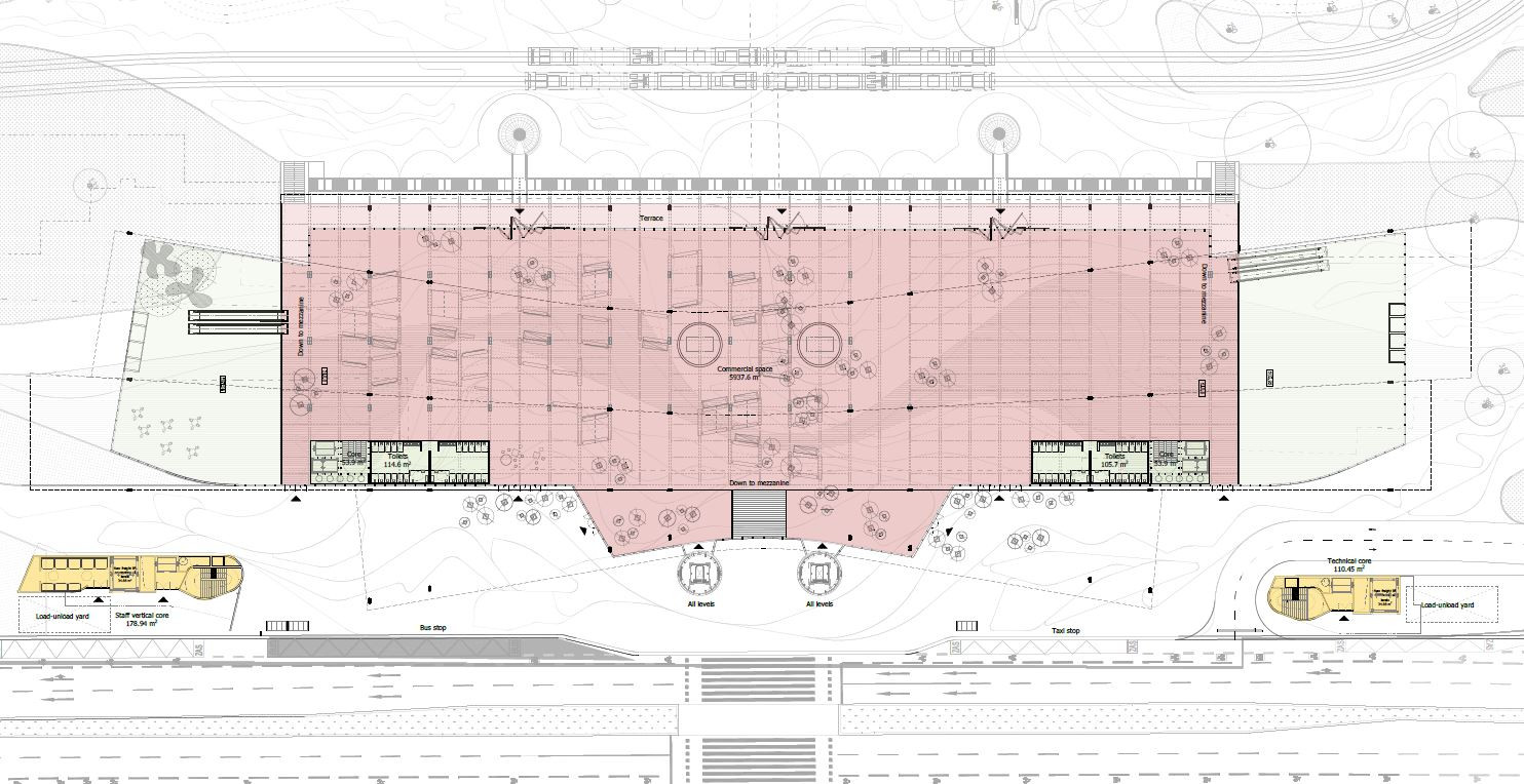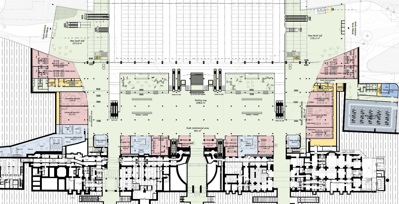 Návrh přináší výstavbu dvou nových objektů po stranách odbavovací haly, které nahrazují současné zásobovací rampy. Tyto objekty nejenom přinášejí nové vstupy do haly, ale obsahují nové funkce a náplně, a především díky svému převýšení nad stávající střechu haly mají podporovat její nové využití. V úrovni ulice Wilsonova tak společně s Fantovou budovou vzniká nově vymezené náměstí, na které jsou v návrhu primárně soustředěné nové venkovní aktivity a náplně, ať už trvalé nebo jen sezónní.