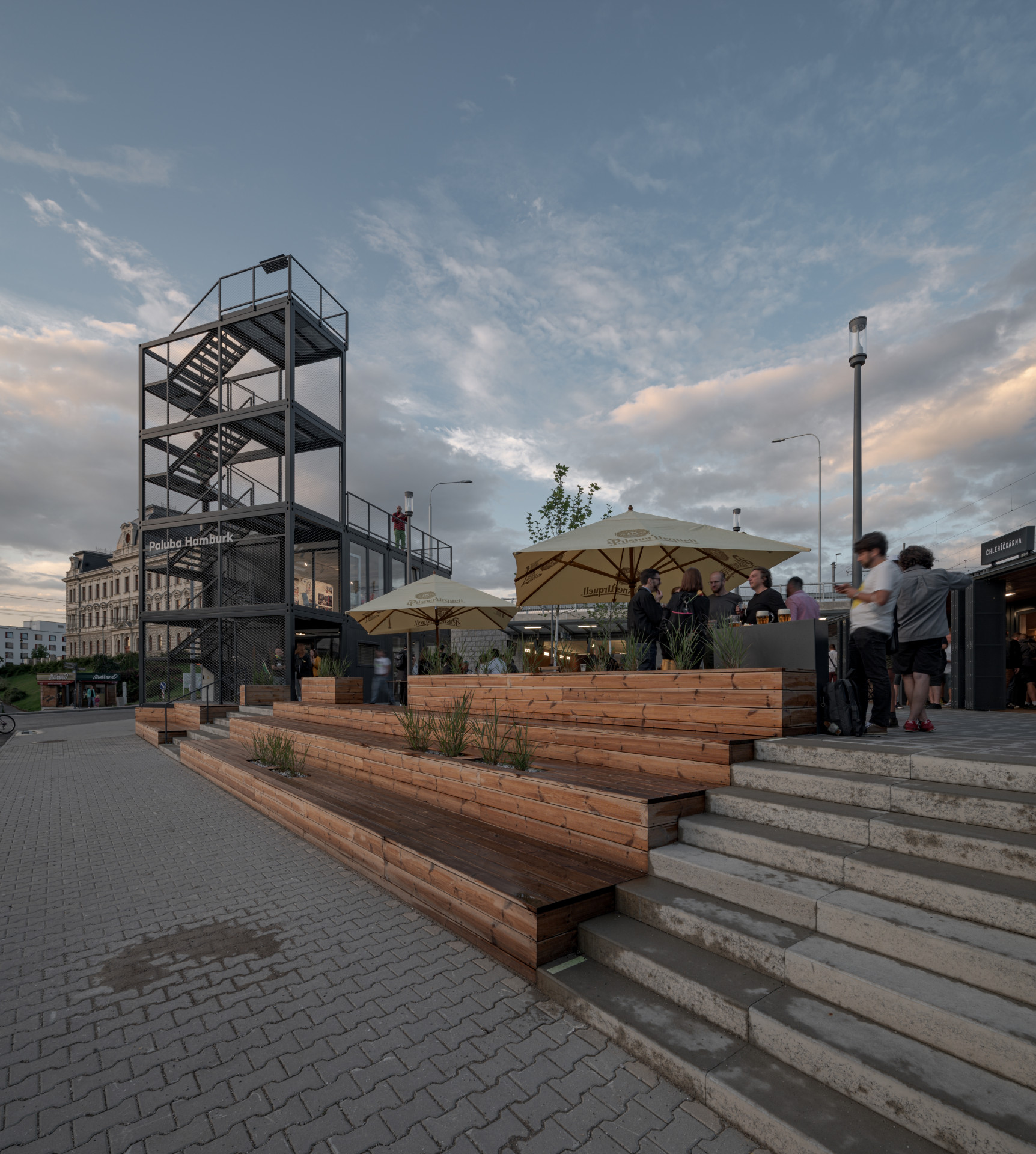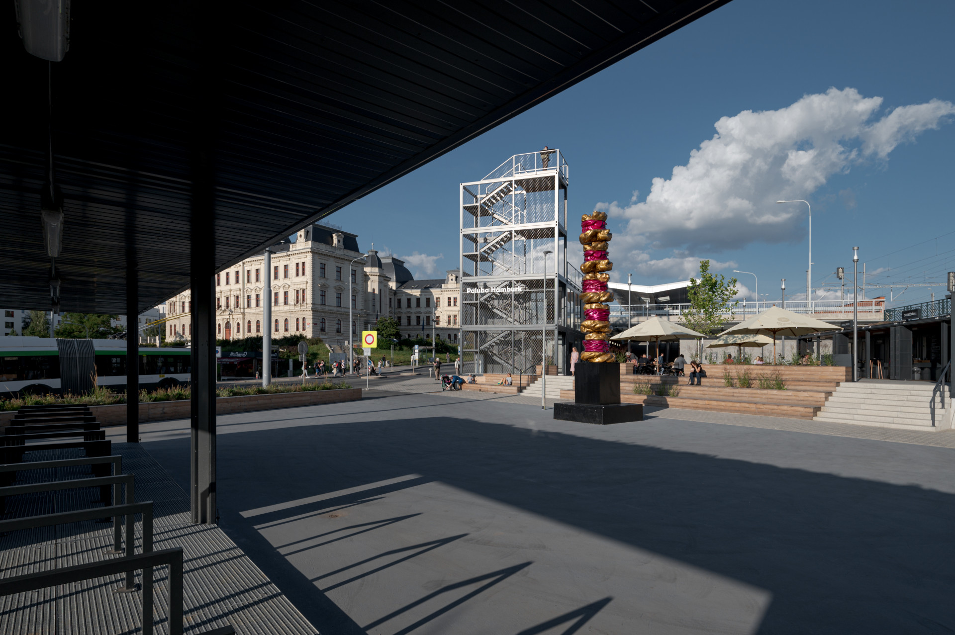 Projekt plzeňského Projectstudia8 dostal název Paluba Hamburk, stojí totiž v lokalitě, které se historicky říká „na Hamburku“. „Paluba Hamburk představuje dočasné řešení před dokončením dalších etap terminálu, a tak kromě obecného zlepšení kvality prostředí zajišťuje i základní zázemí pro cestující, návštěvníky ale i místní,“ vysvětlují autoři.