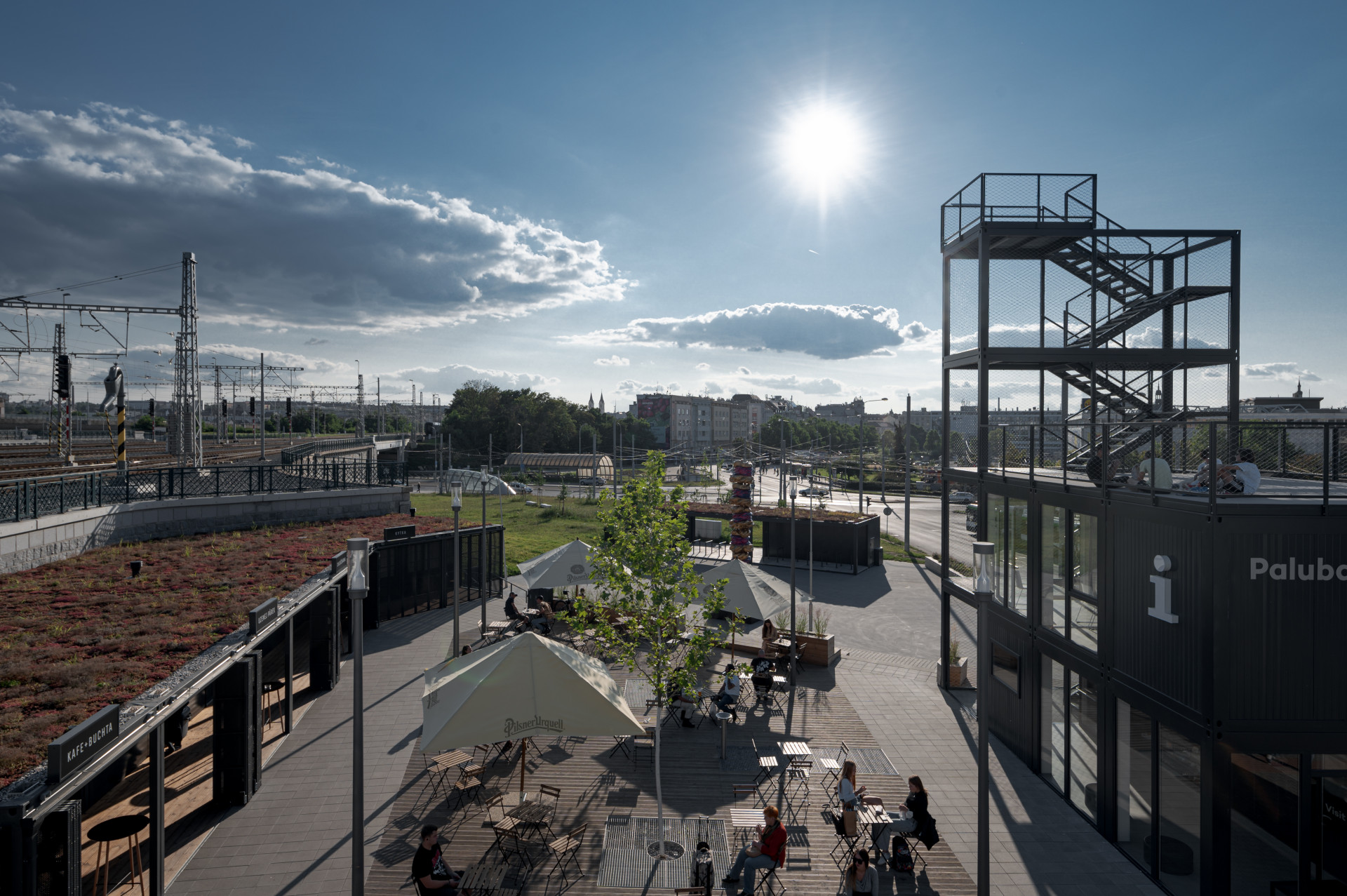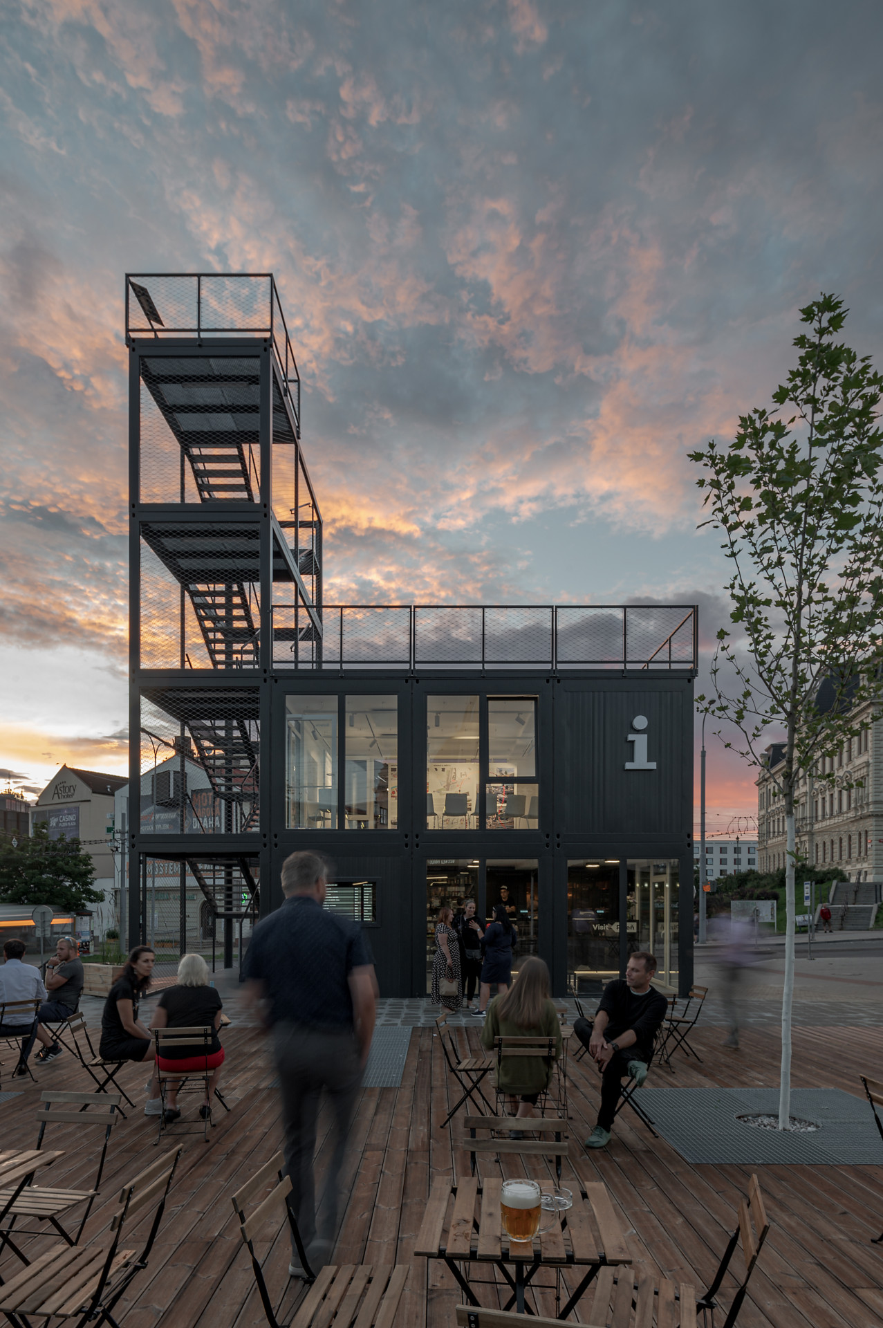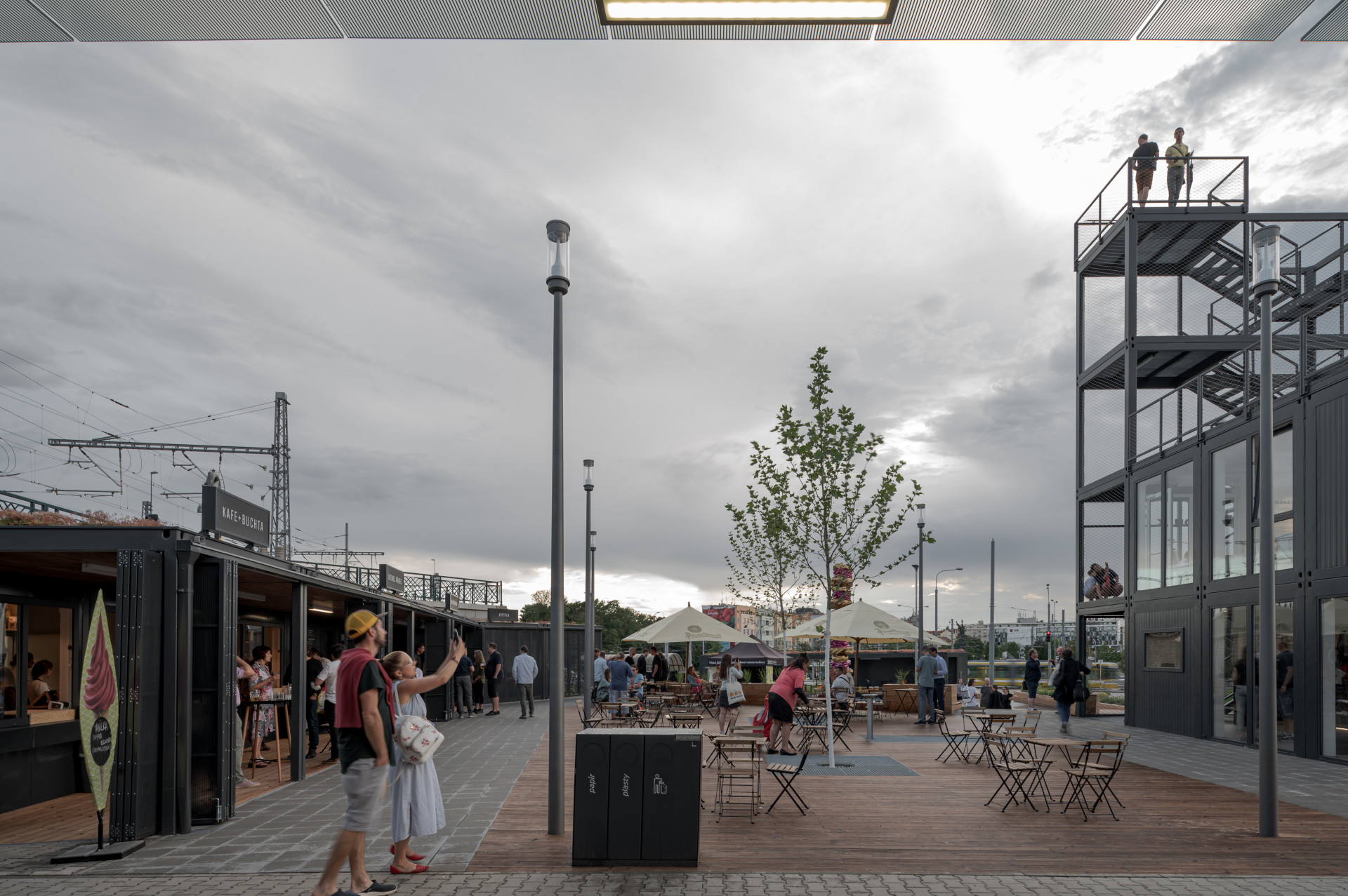 Informační centrum a objekt pro gastronomické podniky propojuje vyvýšená dřevěná „paluba“. Další velká pobytová plocha se pak nachází před kontejnery se zázemím. „Terasu jsme zakončili pobytovými schody a směrem k cyklobloku na ni navázali univerzálním prostranstvím, o něž se hlavní plocha může příležitostně rozšířit a které hostí pravidelně obměňované umělecké instalace,“ říká tým architektů a projektantů Projectstudia8.
