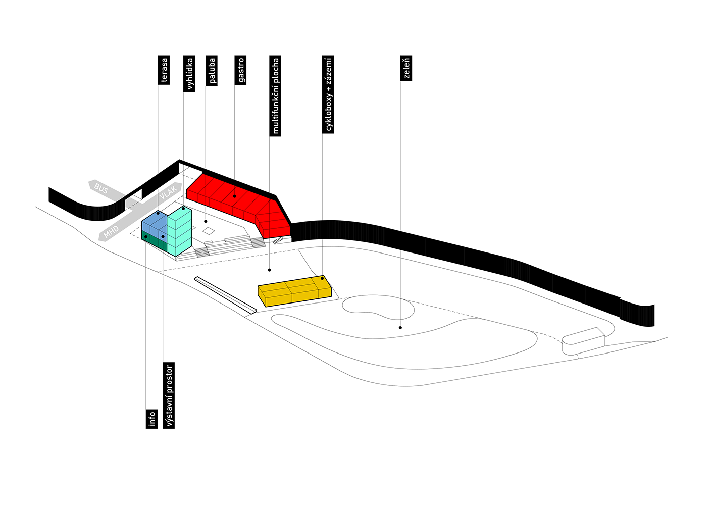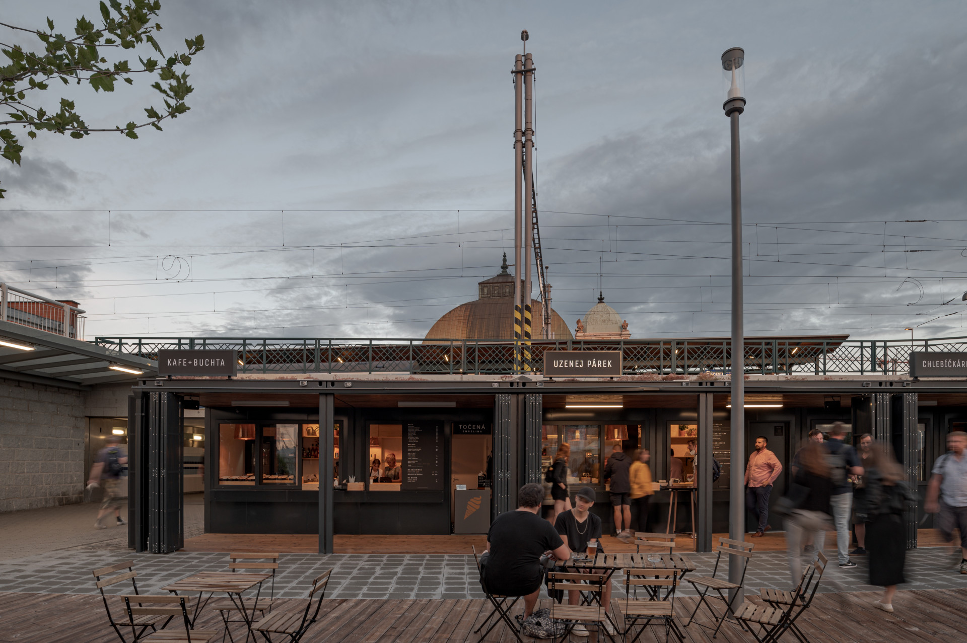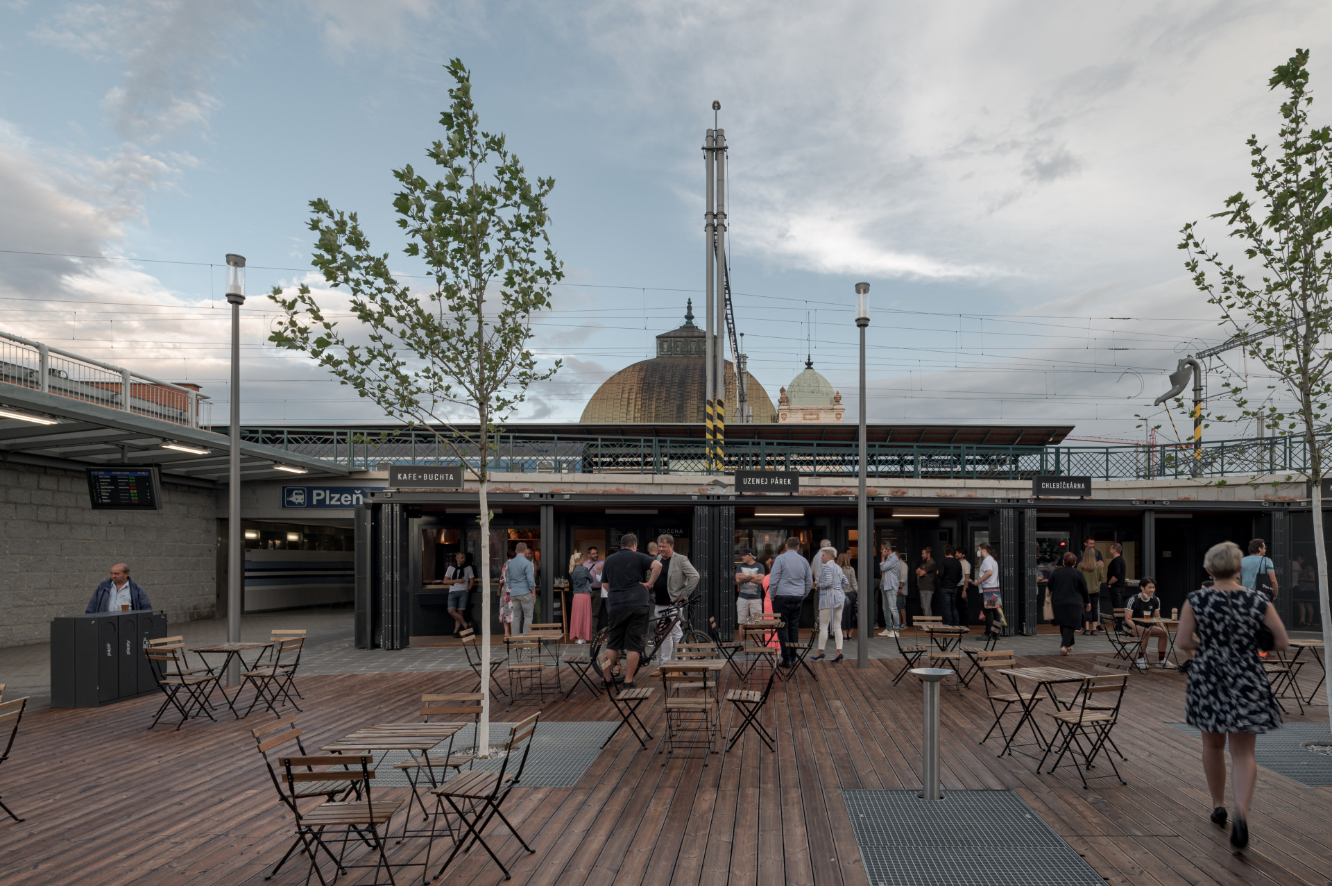 Informační centrum a objekt pro gastronomické podniky propojuje vyvýšená dřevěná „paluba“. Další velká pobytová plocha se pak nachází před kontejnery se zázemím. „Terasu jsme zakončili pobytovými schody a směrem k cyklobloku na ni navázali univerzálním prostranstvím, o něž se hlavní plocha může příležitostně rozšířit a které hostí pravidelně obměňované umělecké instalace,“ říká tým architektů a projektantů Projectstudia8.