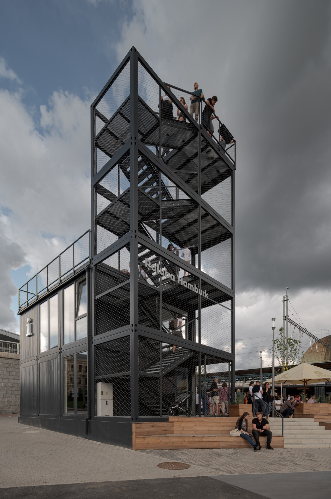Na místě se dnes nachází celkem tři blokové sestavy z kontejnerů. Jedna funguje jako zázemí pro čtyři gastronomické podniky, druhá jako městské informační centrum, v poslední je pak prostor pro uložení kol, sklad, WC a mnoho dalšího. Objekt informačního centra je záměrně nejvýraznější – má svou vlastní terasu a věž, která naplňuje funkci orientačního bodu. Pop-up stavby se nacházejí na velmi exponovaném místě, ústí sem jak podchod z vlakového nádraží, tak výstup z autobusového terminálu.