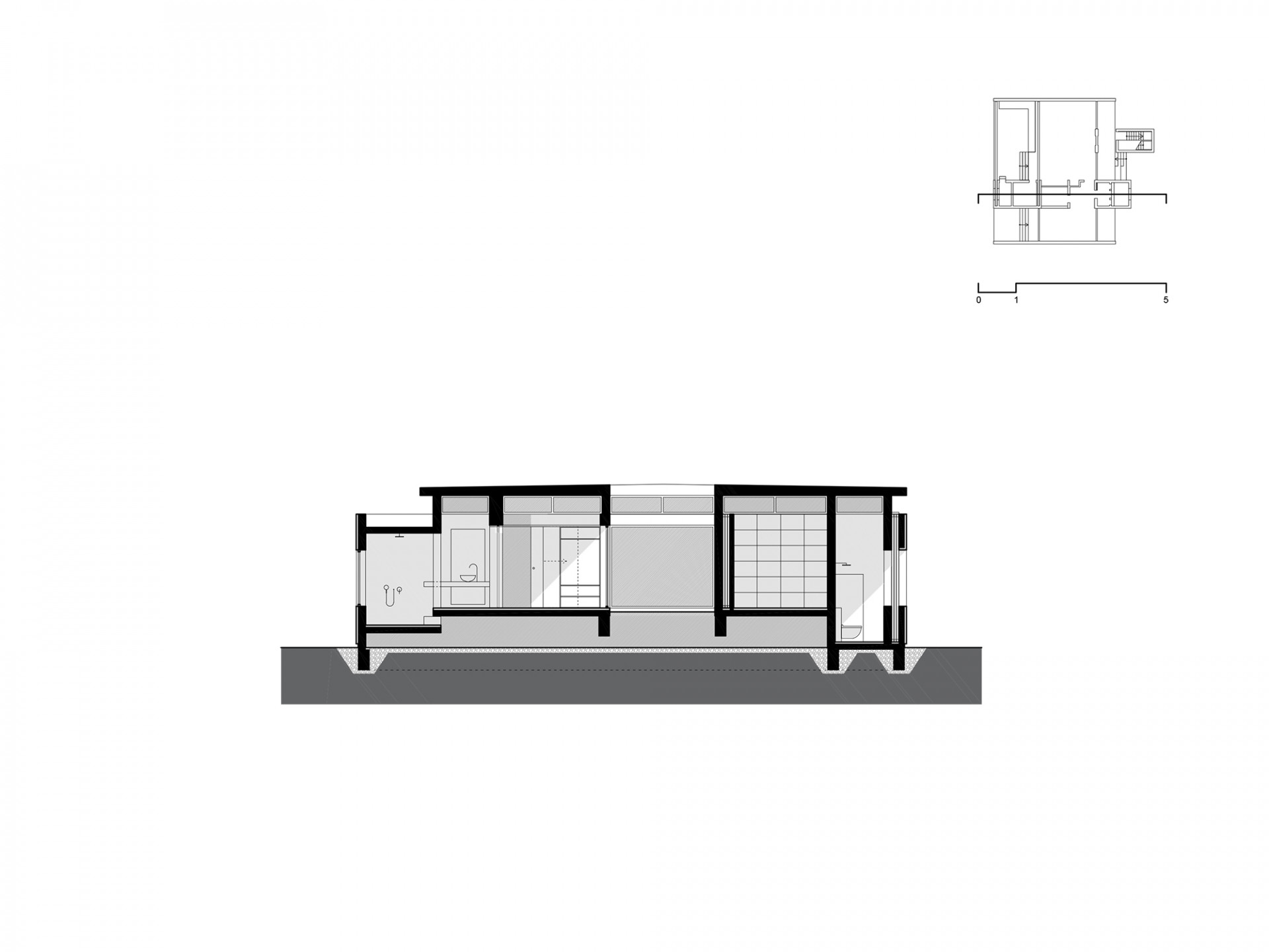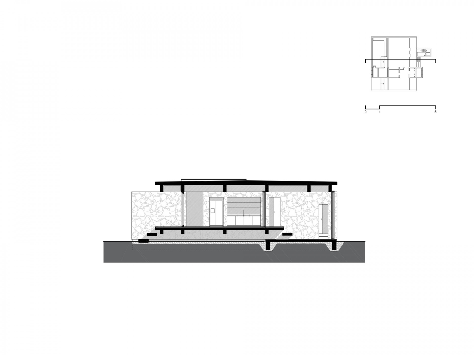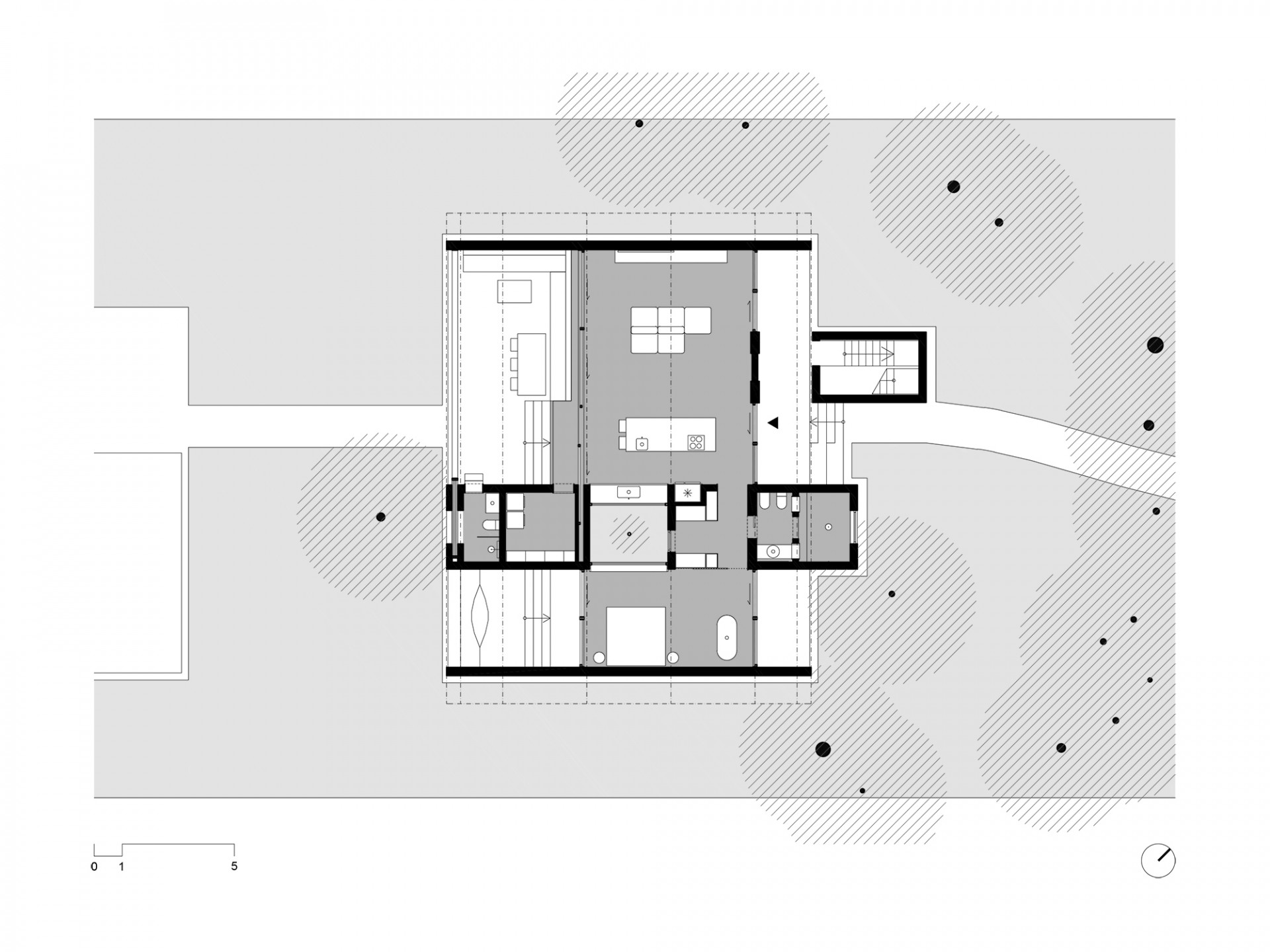 Uvnitř vily na obývací pokoj a kuchyň navazuje krytá terasa, kterou sami architekti označují za „exteriérovou obytnou místnost“. Díky posuvným skleněným stěnám a sítím je možné ji uzavřít a využívat tak za téměř jakéhokoliv počasí. Ložnici od obytného prostoru odděluje příčný trakt, který se v exteriéru projevuje jako vložený zděný úsek. Oproti proskleným volnočasovým místnostem v sobě skrývá koupelny nebo šatnu.