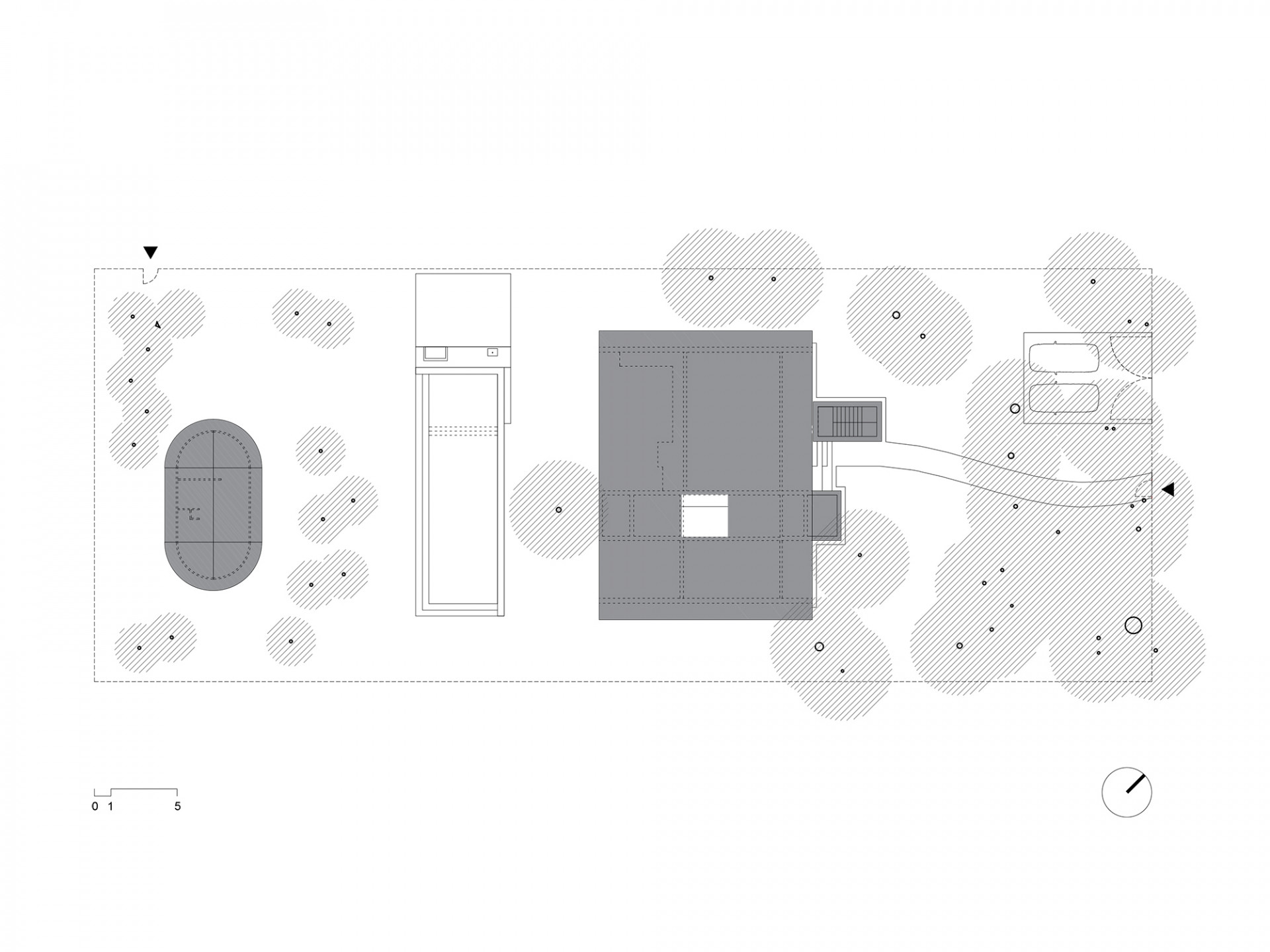 Vila je nepochybně zajímavá i tím, jak se pracuje s vegetací daného pozemku. „Ten je samotným objektem předělen na dvě části – před vilou se nachází zóna lesů a za ní zóna nižšího, ovšem také pro oblast přirozeného porostu – karibské zahrady,“ říkají architekti. Nedílnou součástí zahrady je i bazén, který se nachází jen pár kroků od obytných pokojů.