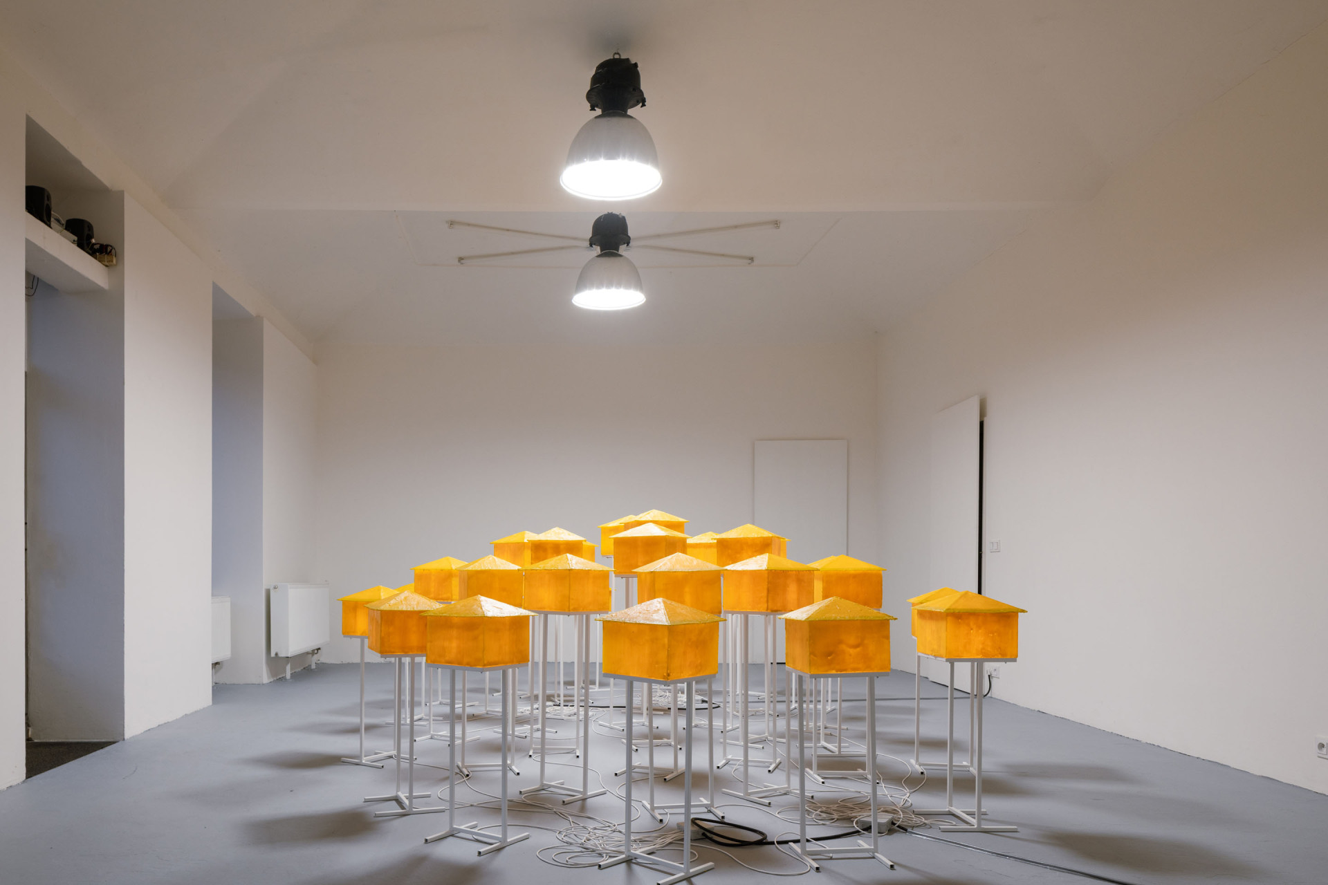 Vystavili tu malé domečky z vosku a plexiskla, které by mohly být příbytky svatojánských broučků, anebo tradiční vesnicí. V nepravidelném rytmu malebná skupinka, vonící včelím voskem, dostane zásah světlem ze stropního reflektoru. „Hluk, moderní záře, a rychlost, nahradí tichou tmu,“ píše se v popisu. A tím se zničí také světelné námluvy světlušek.