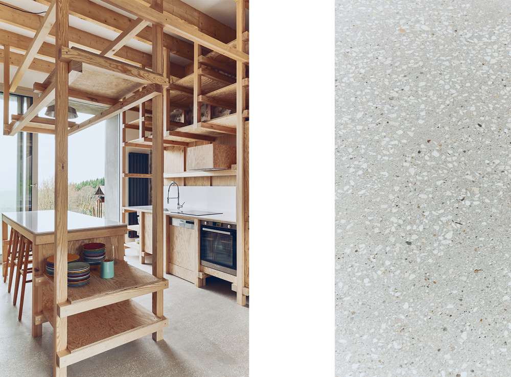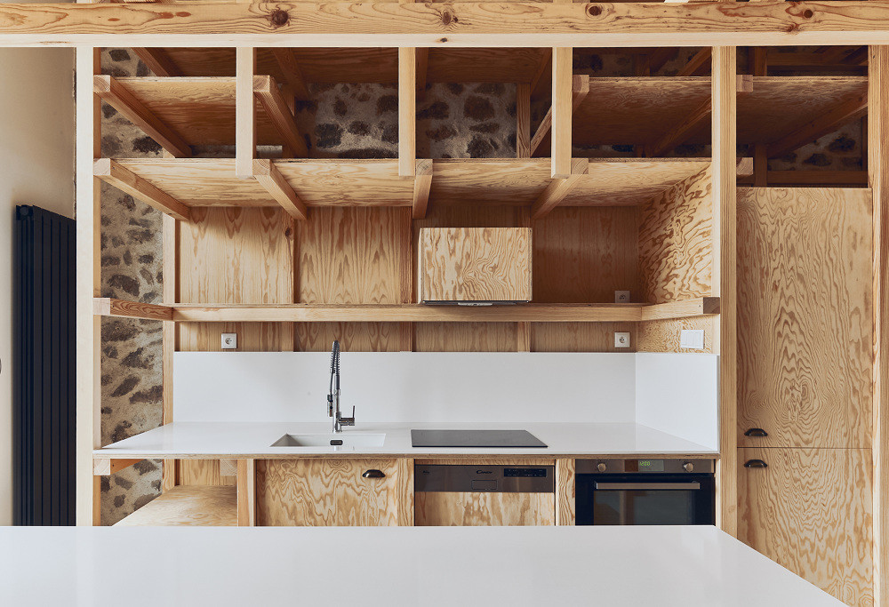 Minnaërt navrhnul velkou kuchyň v kompletně dřevěném provedení, kde nechybí ani úložný prostor pro skladování místních plodin zdůrazňující zemědělský charakter původní stavby. Přímo z kuchyně se nabízí přístup do zahrady skrze francouzské dveře orámované betonem. Právě kuchyň představuje nejdůležitější a zároveň nejvýraznější prostor z celého domu. Dřevěnou kuchyňskou linku včleněnou do schodiště tu doplňuje geometrická mřížka z hranolů.