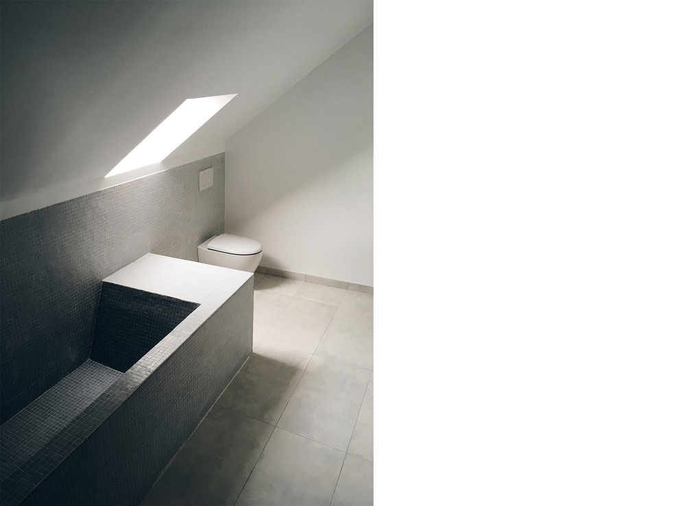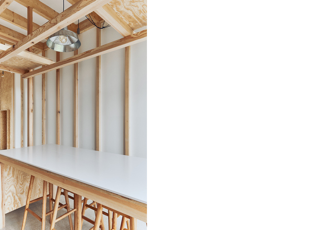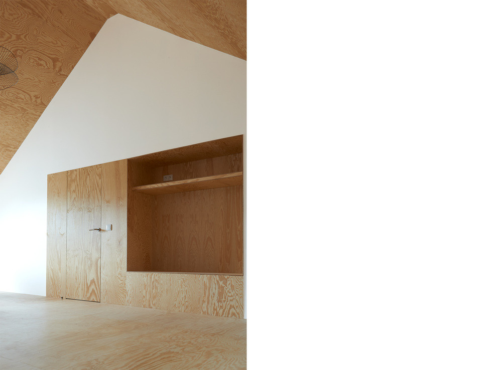 Celému interiéru dominuje dřevo sloužící jako sjednocující prvek všech místností. Jinak tomu není ani v ložnici, která je obložená dřevěnou překližkou plynule propojující podlahu, stěny i strop. Kontinuitu mezi přízemím a mezipatrem udržují schůdky s rampou a zábradlím z nylonu. Z překližky je zařízený také obývací pokoj, kde se v prostorném výklenku ukrývá domácí kino s relaxační zónou. Koupelně vévodí na míru vyrobená vana obložená keramickými kachličkami.