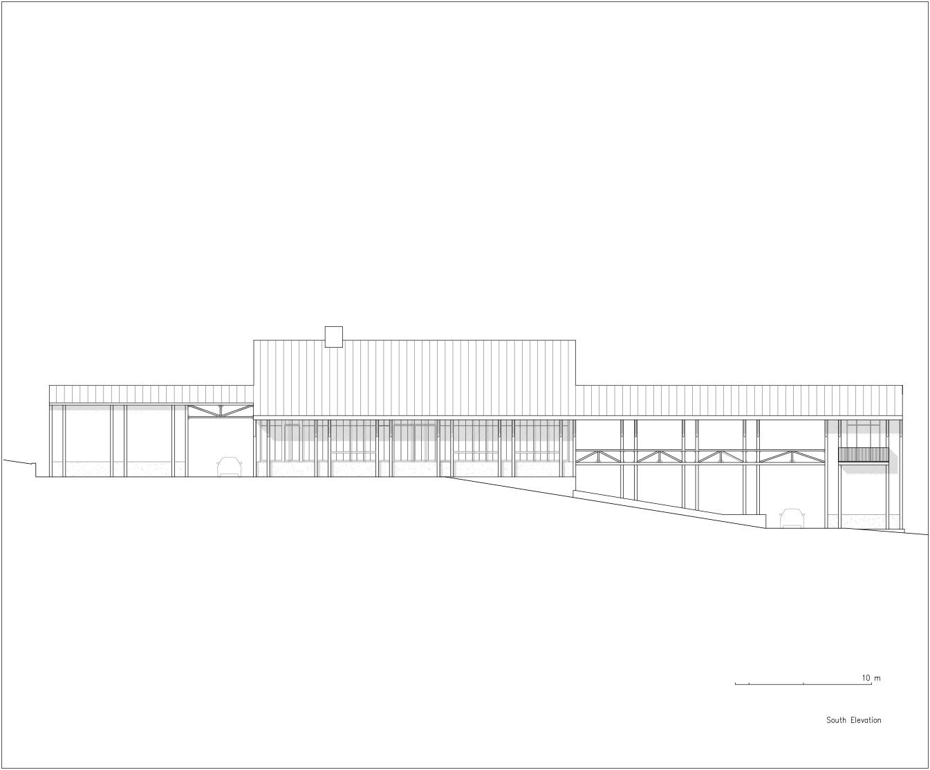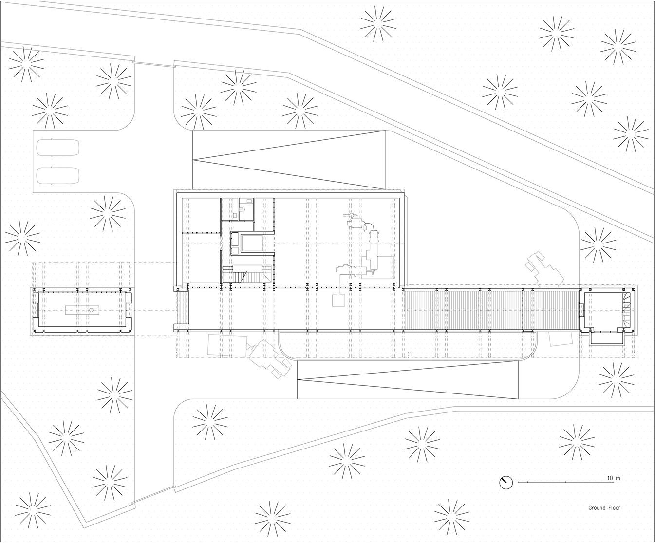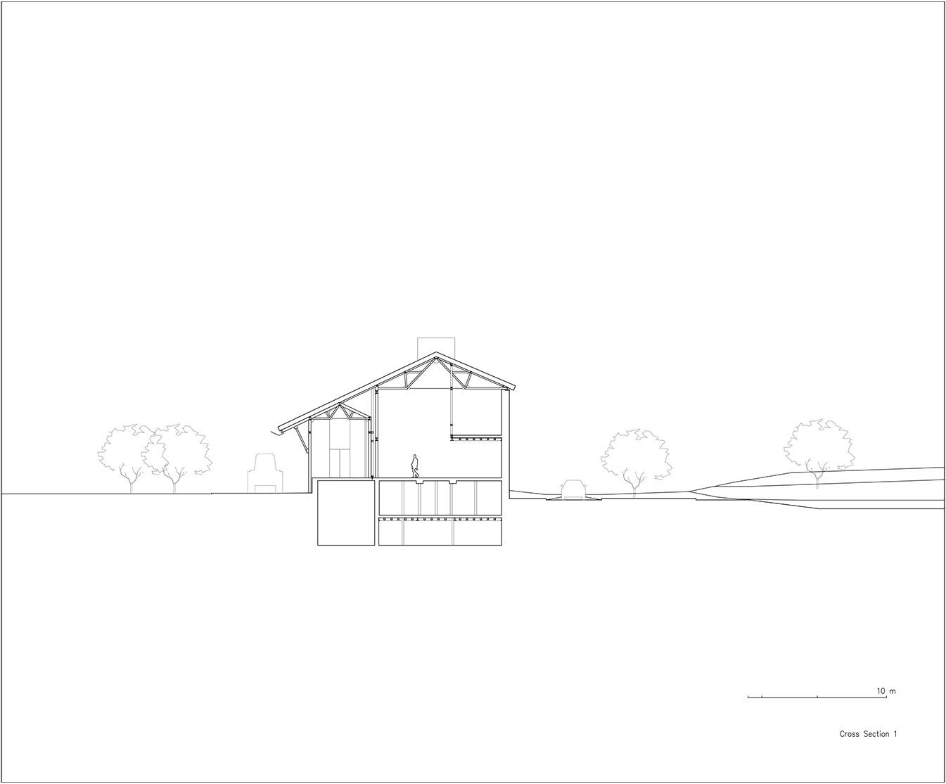 Při projektování dispozic jsme chtěli vytvořit schéma, v němž by veřejné postupně přerůstalo v soukromé a naopak. Součástí komplexu je obchod jakožto zástupce „veřejného“ prostoru a dům pro hosty jako zástupce prostoru soukromého. Areál tvoří otevřené a polootevřené prostory, požadované stínění a klima je zajišťováno předsunutým, visutým zastřešením, jež celý prostor vizuálně sjednocuje. Střecha je pokryta mědí – ve výsledku tvoří nejvýraznější prvek celé stavby.