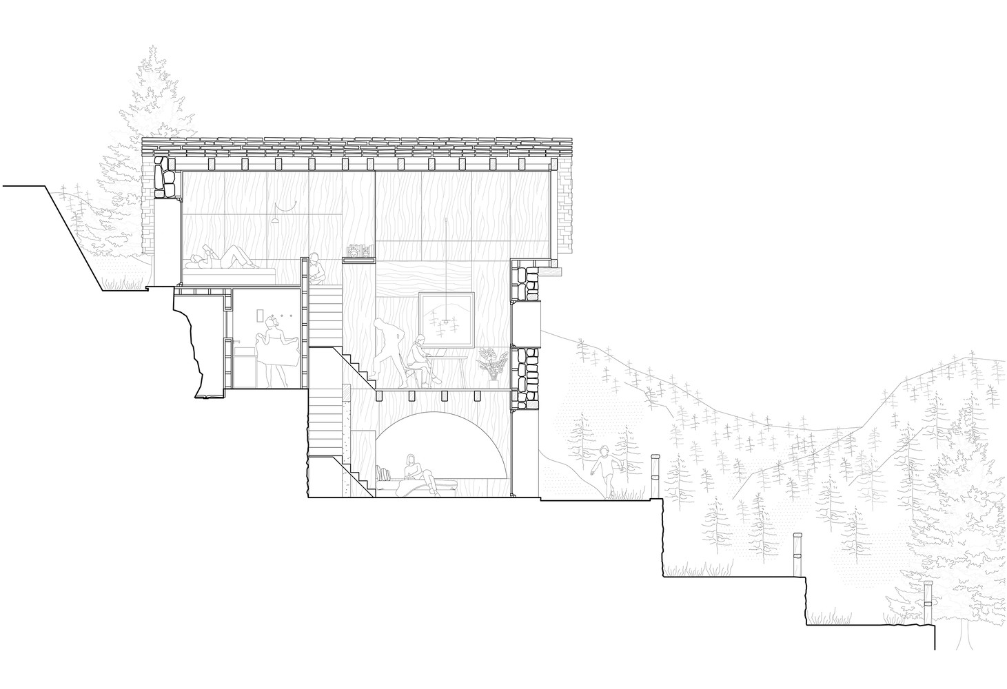 Umístění domu na horském hřebeni značně ovlivnilo celkovou podobu nejen exteriéru, ale také interiérového designu, jelikož se skála objevuje také v některých částech domu. Architekti se snažili využít maximum z původní ruiny. Lokálně těžené kameny proto našly své další využití v nových zdech i venkovní dlažbě. Staré podlahy a poškozené střešní trámy pak byly proměněny v nové dveřní a okenní překlady. Kde nebylo použito kamene ani dřeva, tam si architekti pomohli surovým pohledovým betonem. Jeho přítomnost autoři nijak nemaskovali a díky tomu navozuje nové dialogy s původními materiály domu.