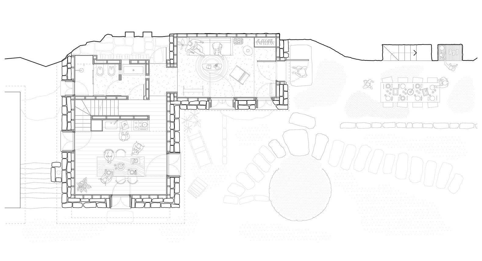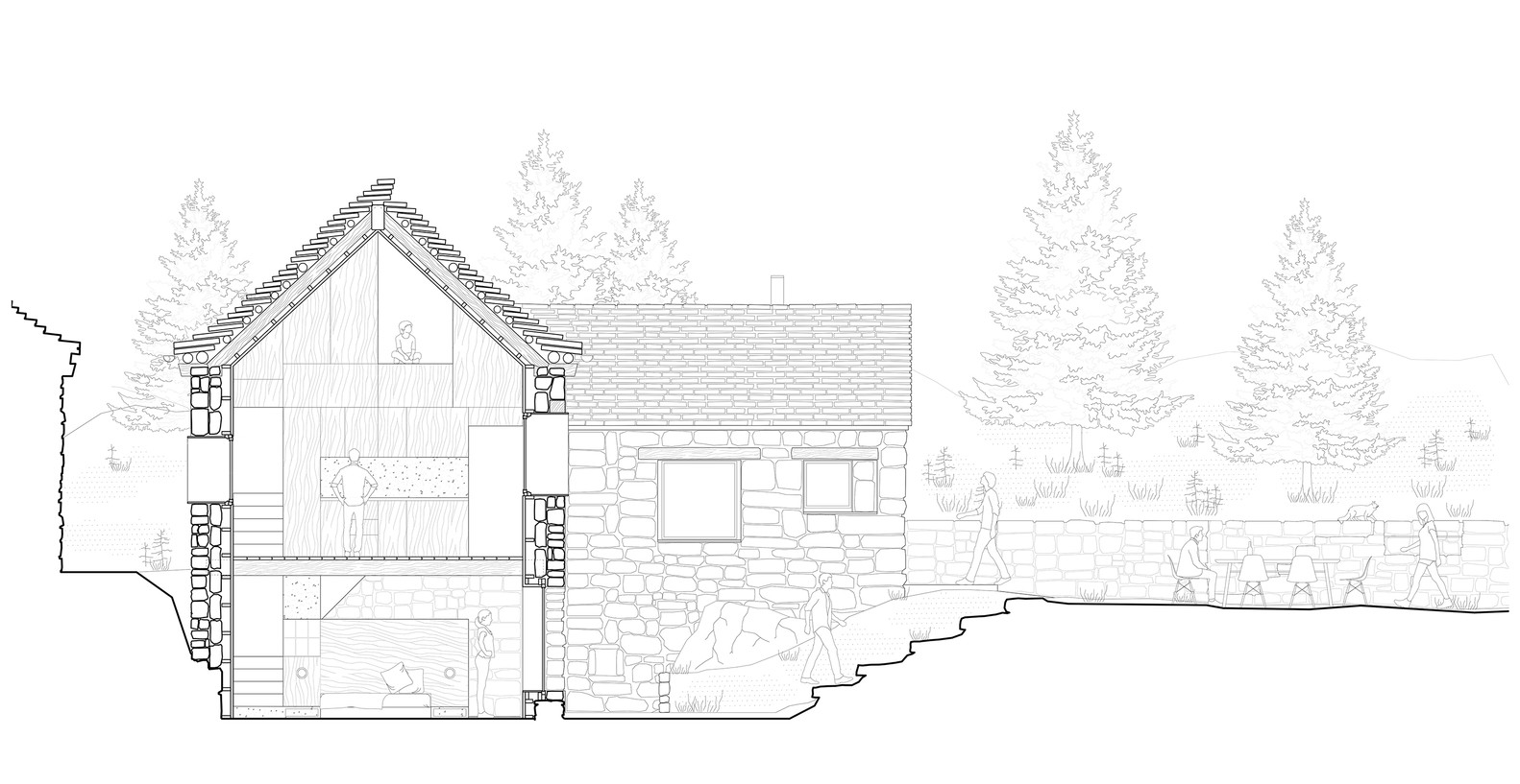 Objekt je společně s pár dalšími domky zasazen přímo do horského hřebene. Místní stavební tradice je s horskou krajinou velmi úzce svázána a dovednosti stavění tradičních kamenných domů si lokální řemeslníci předávají po staletí. Proto architekti na obnově domu spolupracovali také právě s místními řemeslníky, kteří opravovali staré zdi kámen po kameni.