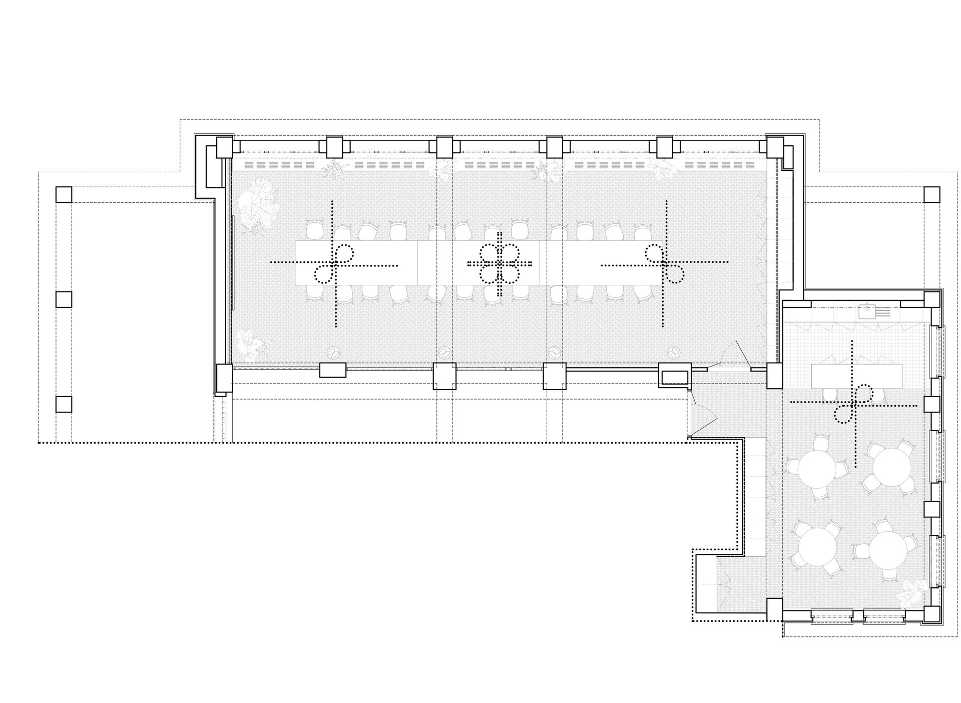 Rekonstrukce kanceláří zatím zasáhla jen část budovy. Šlo o první fázi postupné proměny devítipodlažního domu, ve kterém firma v Praze-Bubenči sídlí. „V úvodní etapě jsme se soustředili především na zázemí pro zaměstnance – prioritou byla moderní kuchyňka a kapacitní zasedací místnost,“ popisují architekti.