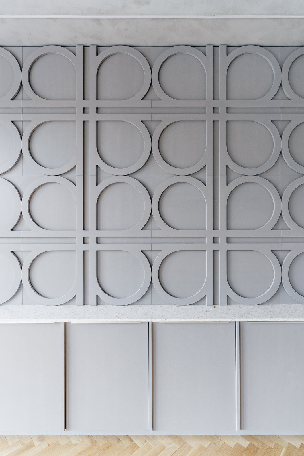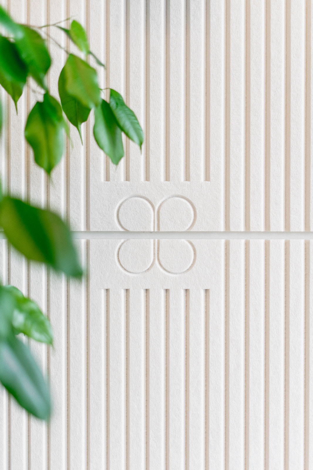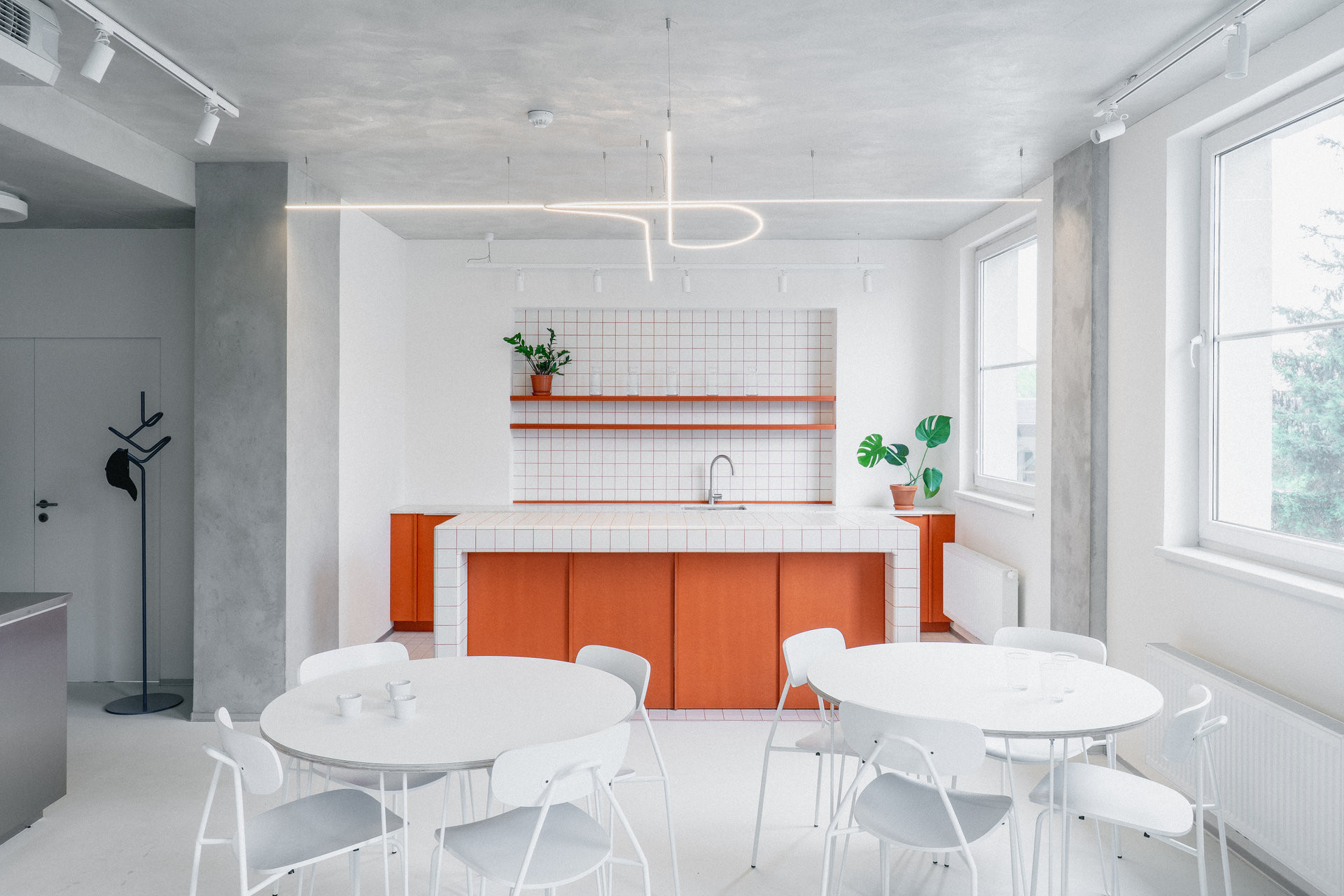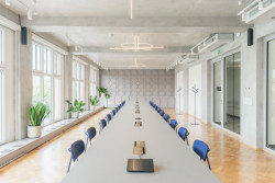 Zasedací místnost zase zalévá světlo z velkých oken. Oproti kuchyňce pracuje s tlumenější atmosférou. Dubové podlahy souzní z dobou vzniku stavby a propisuje se sem také její železobetonový skelet, který jí dává její podobu. I sem se otiskl motiv firemního loga, propsal se na atypický MDF obklad v čele místnosti.