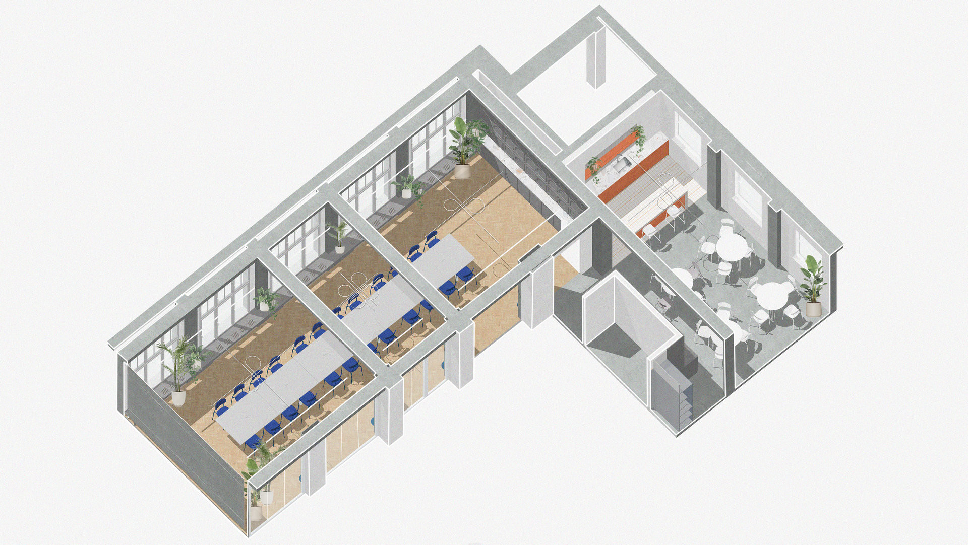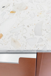 Nová kuchyňka splňuje to, co od ní firma a zaměstnanci potřebovali nejvíce – jelikož si do ní chodí nejčastěji na kávu, nechybí v ní kávovar, usazený na nový nerezový pult. Dále se zde dá ohřívat jídlo a postávat při tom u elegantního keramického ostrůvku. Kuchyňka je pro zaměstnance totiž taky místem pro neformální setkávání.