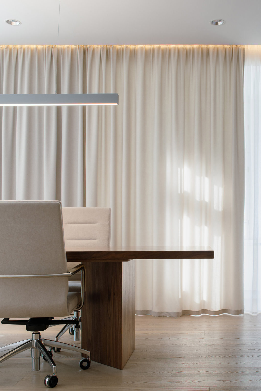 Keramiku vyvažuje přírodní dub – v podlahách, nábytku i okenních rámech. „Na míru vyrobené ořechové zasedací stoly dodávají sdíleným prostorám jemný hmatový kontrast a odrážejí důraz na trvanlivost a kvalitní řemeslné zpracování,“ dodávají k vybavení architekti.