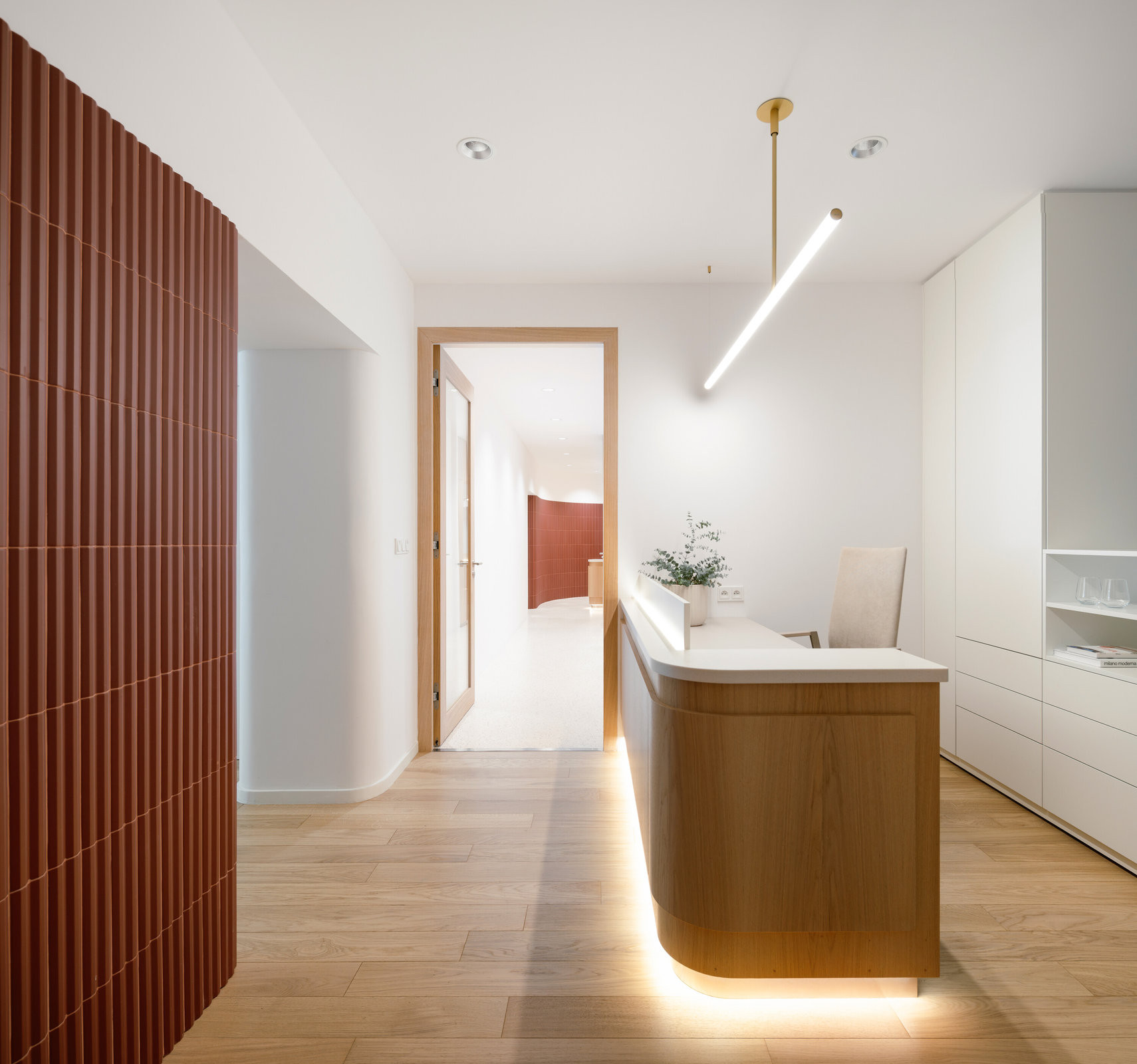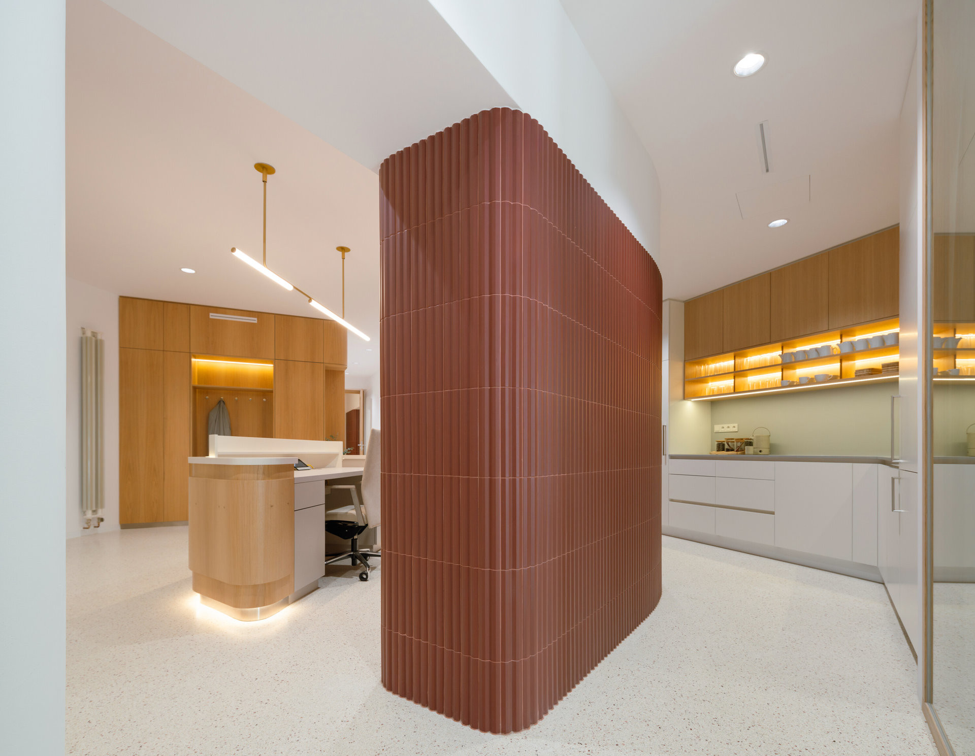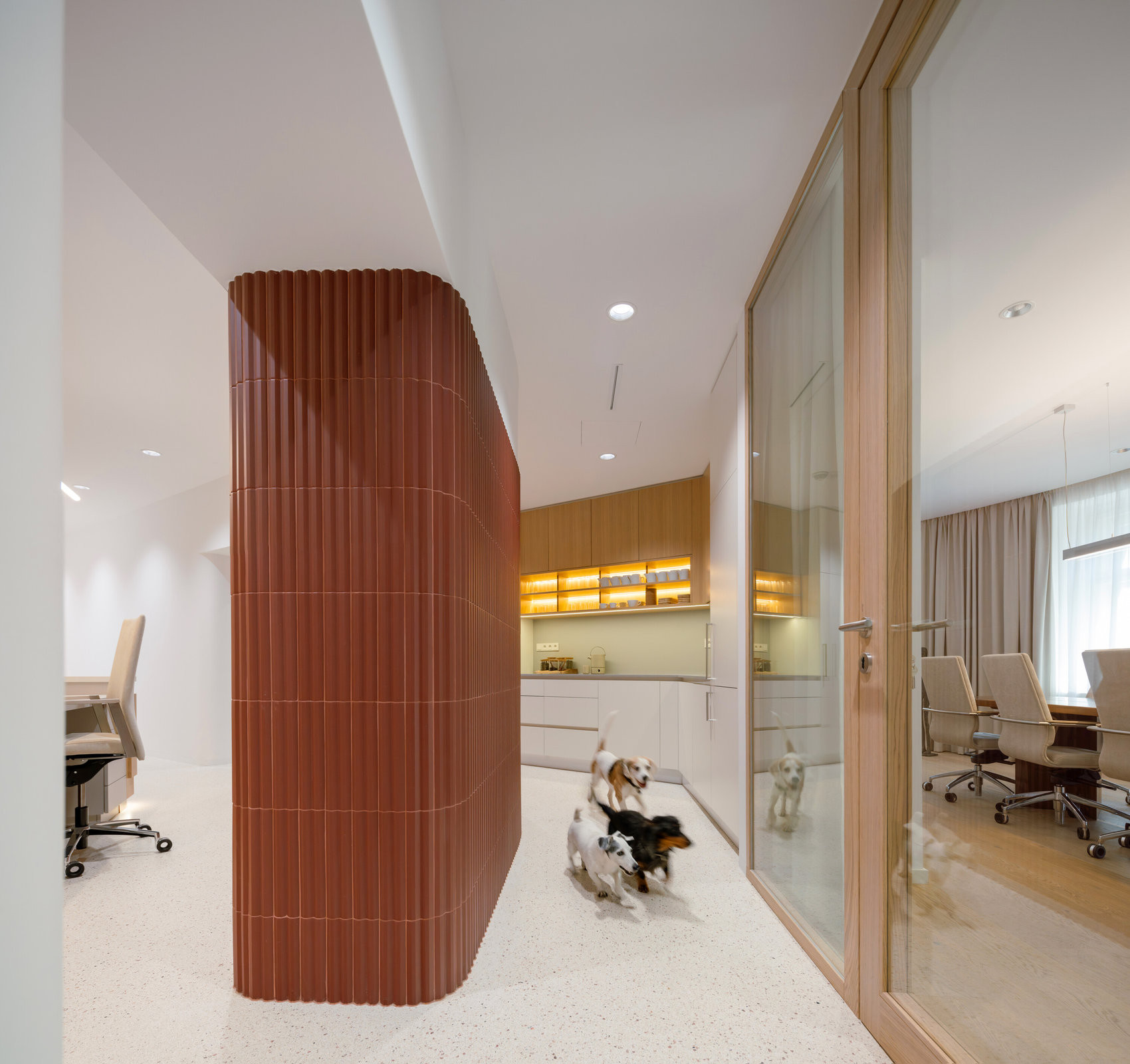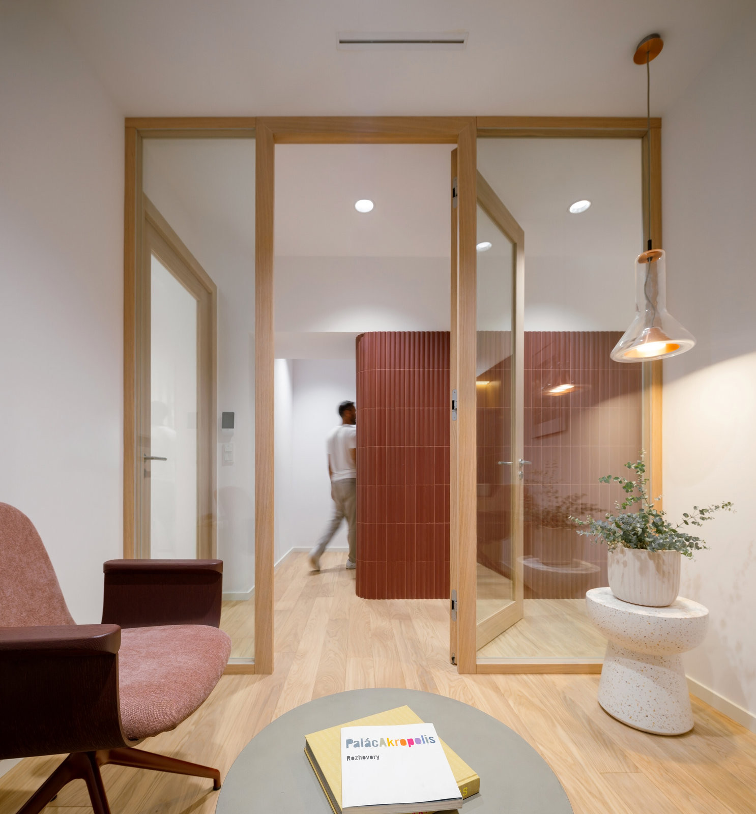 Výraznou proměnou prošly dříve tmavé chodby. Nově jsou pojaté jako jemně zakřivené průchody obložené červenými keramickými obklady. Stejný materiál se ve světlejších odstínech objevuje i v sociálních zařízeních a vytváří vizuální kontinuitu napříč celým podlažím.