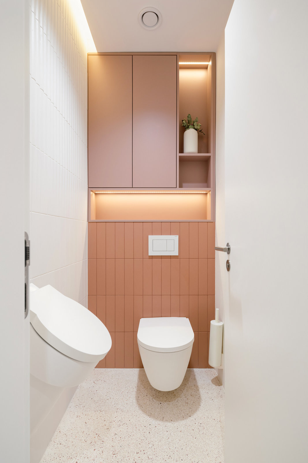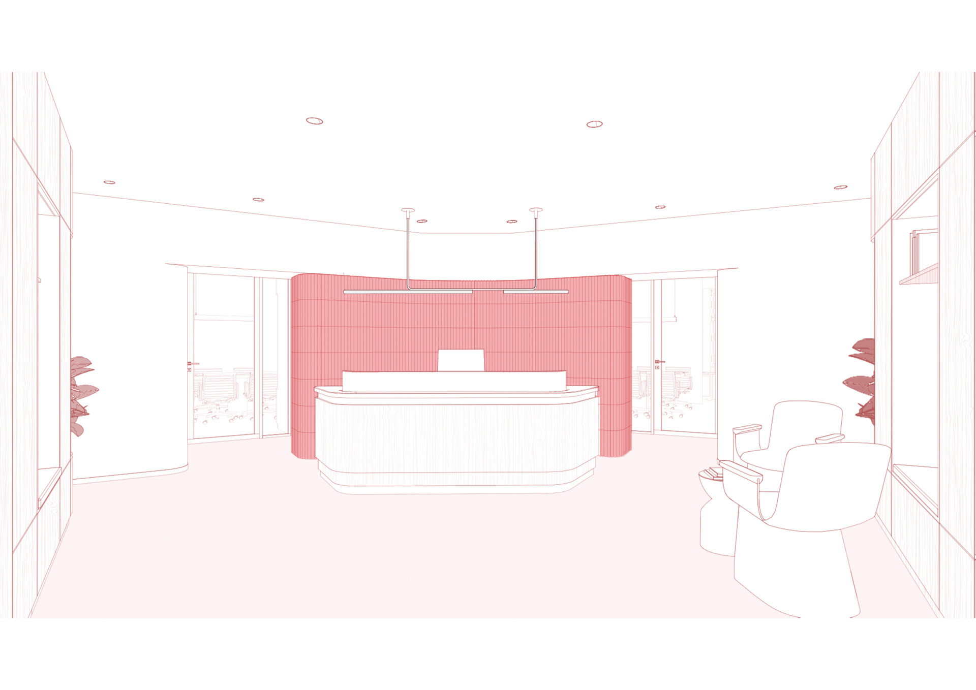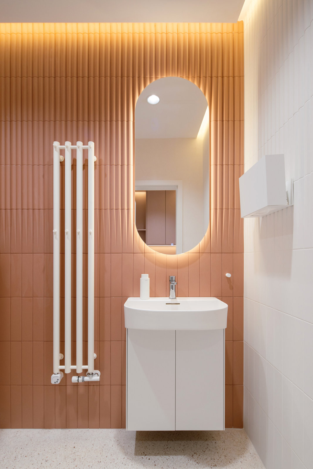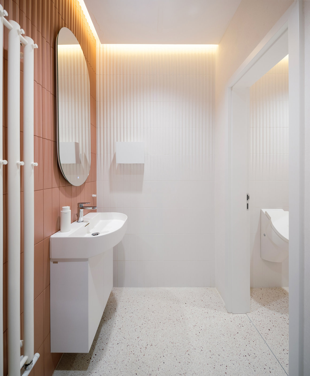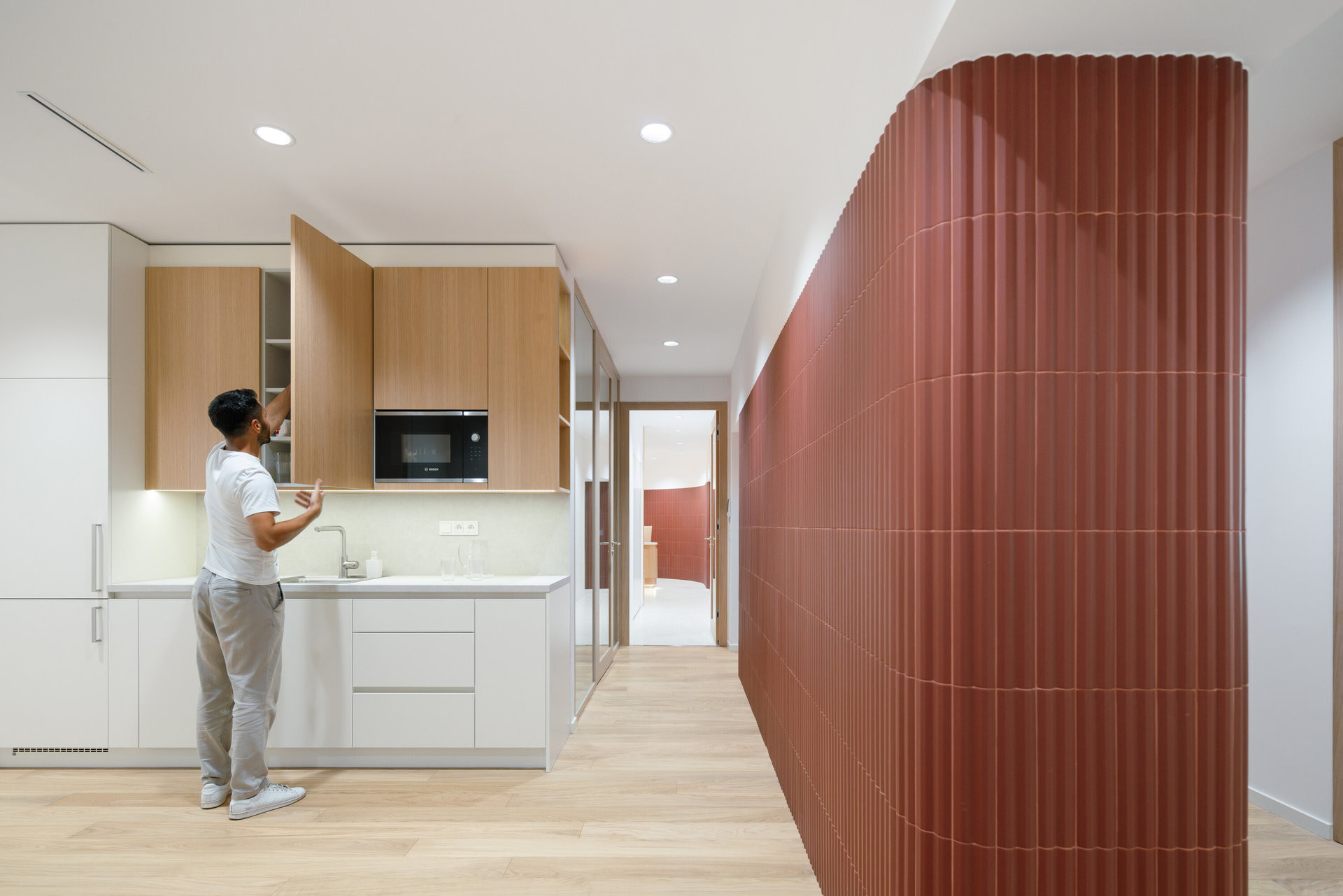 Výraznou proměnou prošly dříve tmavé chodby. Nově jsou pojaté jako jemně zakřivené průchody obložené červenými keramickými obklady. Stejný materiál se ve světlejších odstínech objevuje i v sociálních zařízeních a vytváří vizuální kontinuitu napříč celým podlažím.