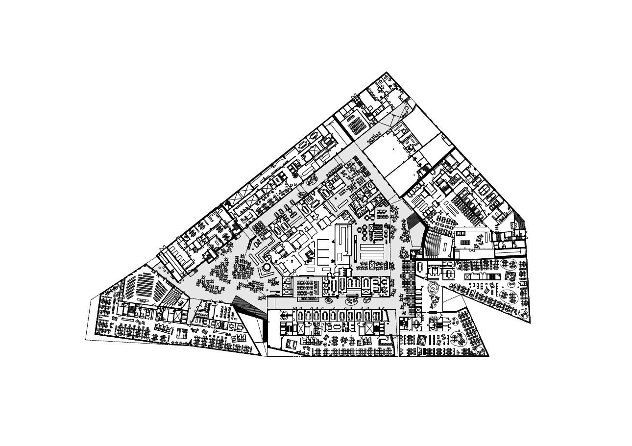 Jako jádro celého distriktu funguje tzv. galerie, okružní vnitřní cesta zastřešená skleněnou střechou. Ta spojuje různé funkční jednotky a poskytuje prostory k setkávání. Ve vertikální perspektivě lze rozlišovat celkem tři zóny: sklepy (s parkováním, strojovnami, sklady a rozvody), přízemí (kde jsou foyery, restaurace, konferenční místnosti a dokonce veřejně prospěšné služby) a vyšší patra (s kancelářemi).