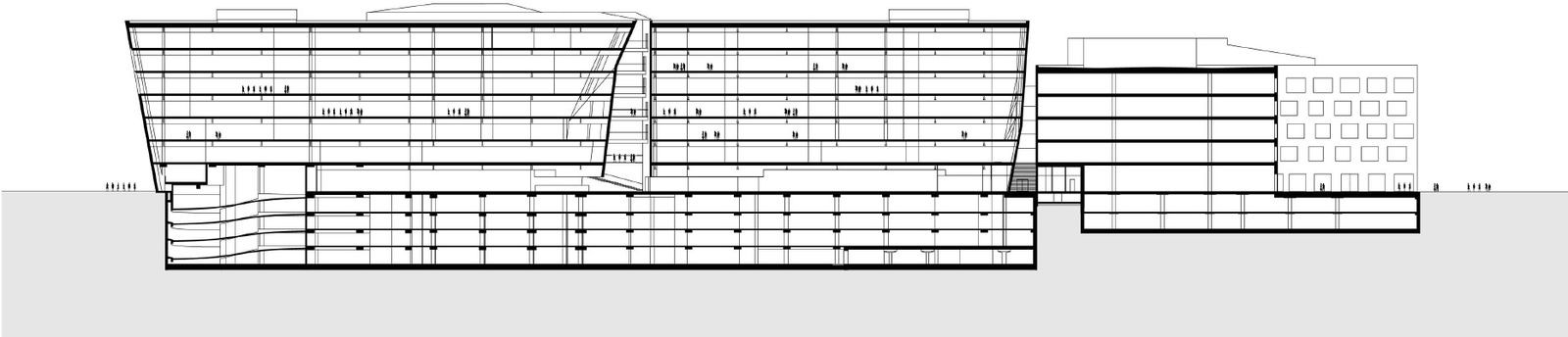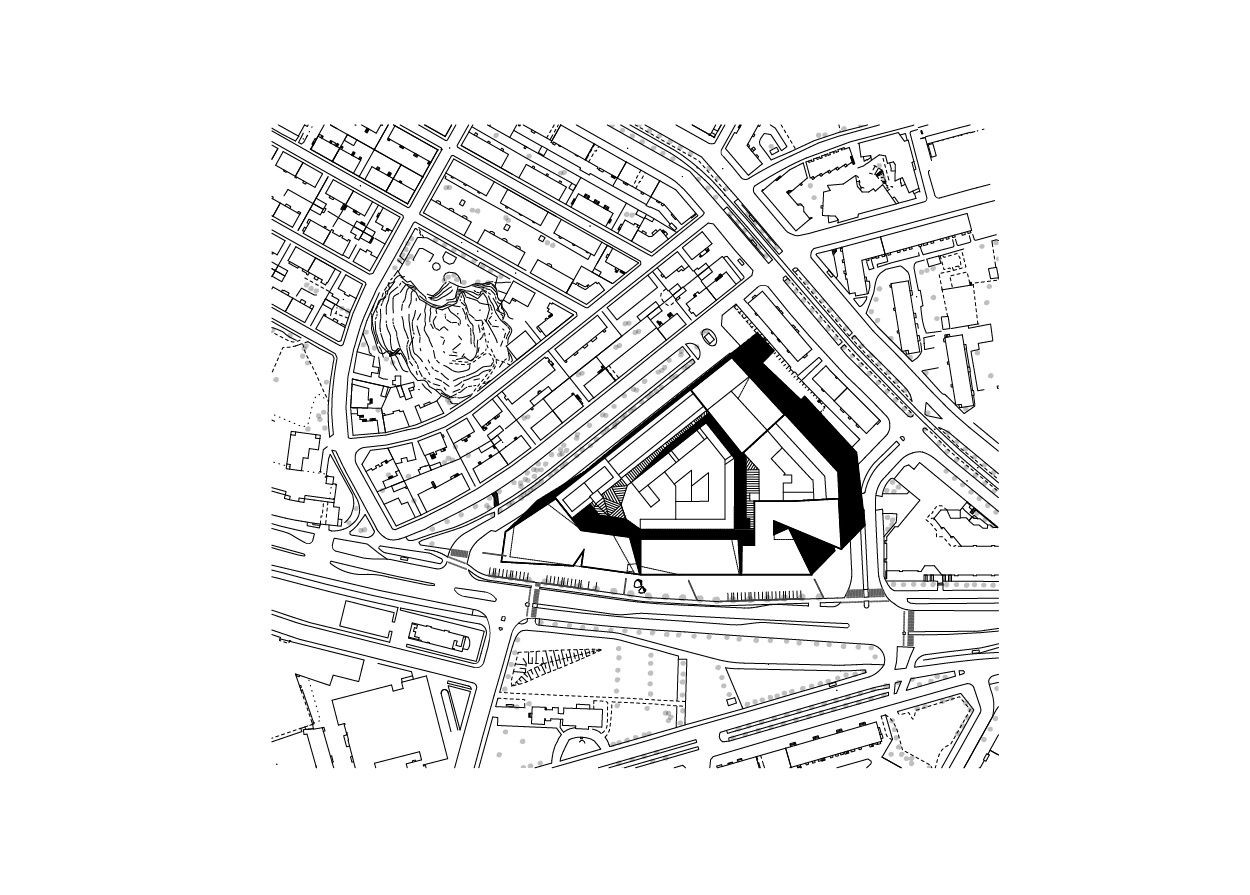 Jádrem architektonické úvahy byla interakce mezi vnějškem a vnitřkem rozlehlé čtvrti. Vnitřek je učiněn viditelný pro pozorovatele zvenku a vytváří tak otvřené a průhledné perspektivy. Naopak uživatelé vnitřků také potřebují navázat vizuální kontakt s okolním světem. Toho bylo dosaženo vysokými průzory mezi objemy budovy, které zároveň rytmizují dlouhé fasády.