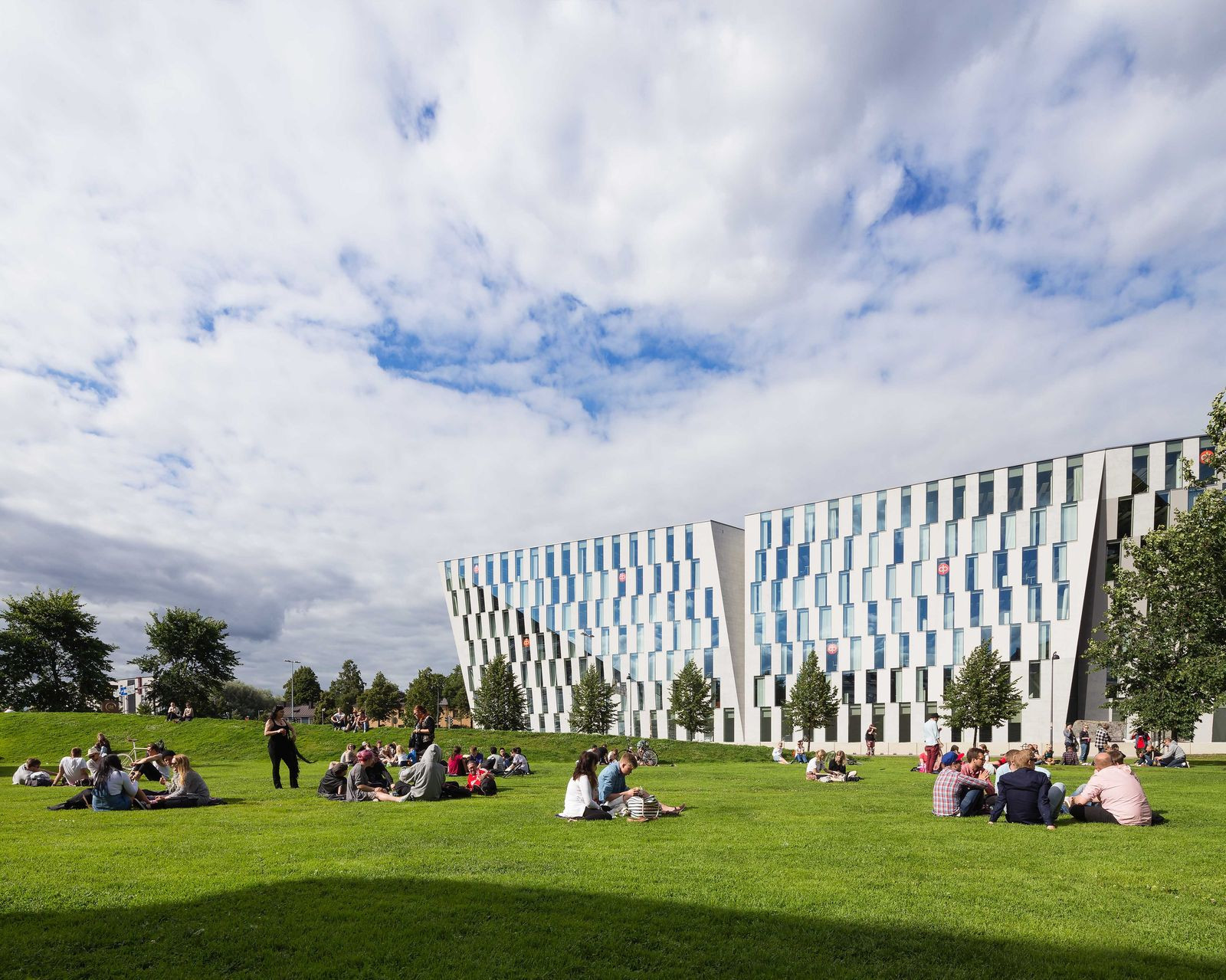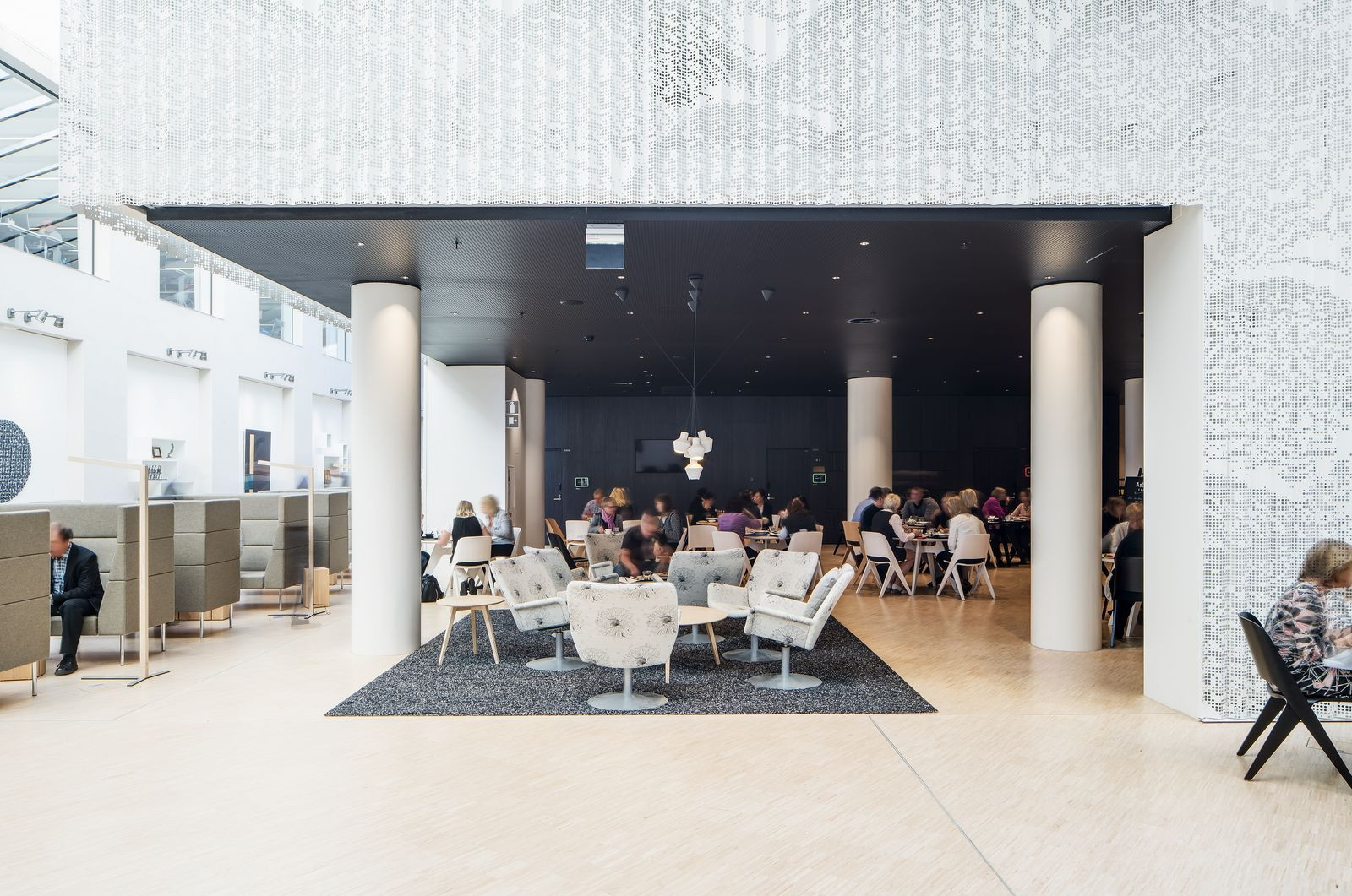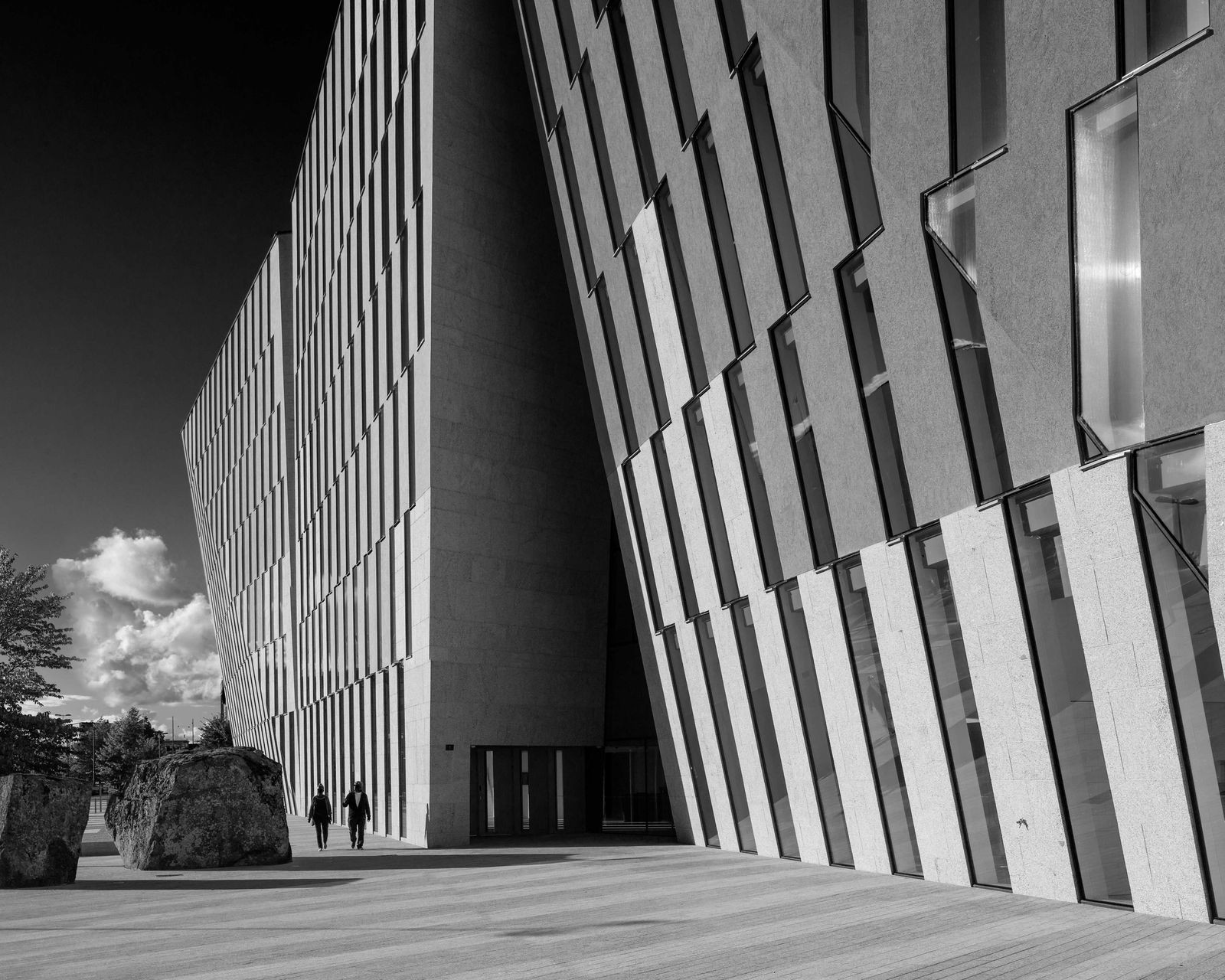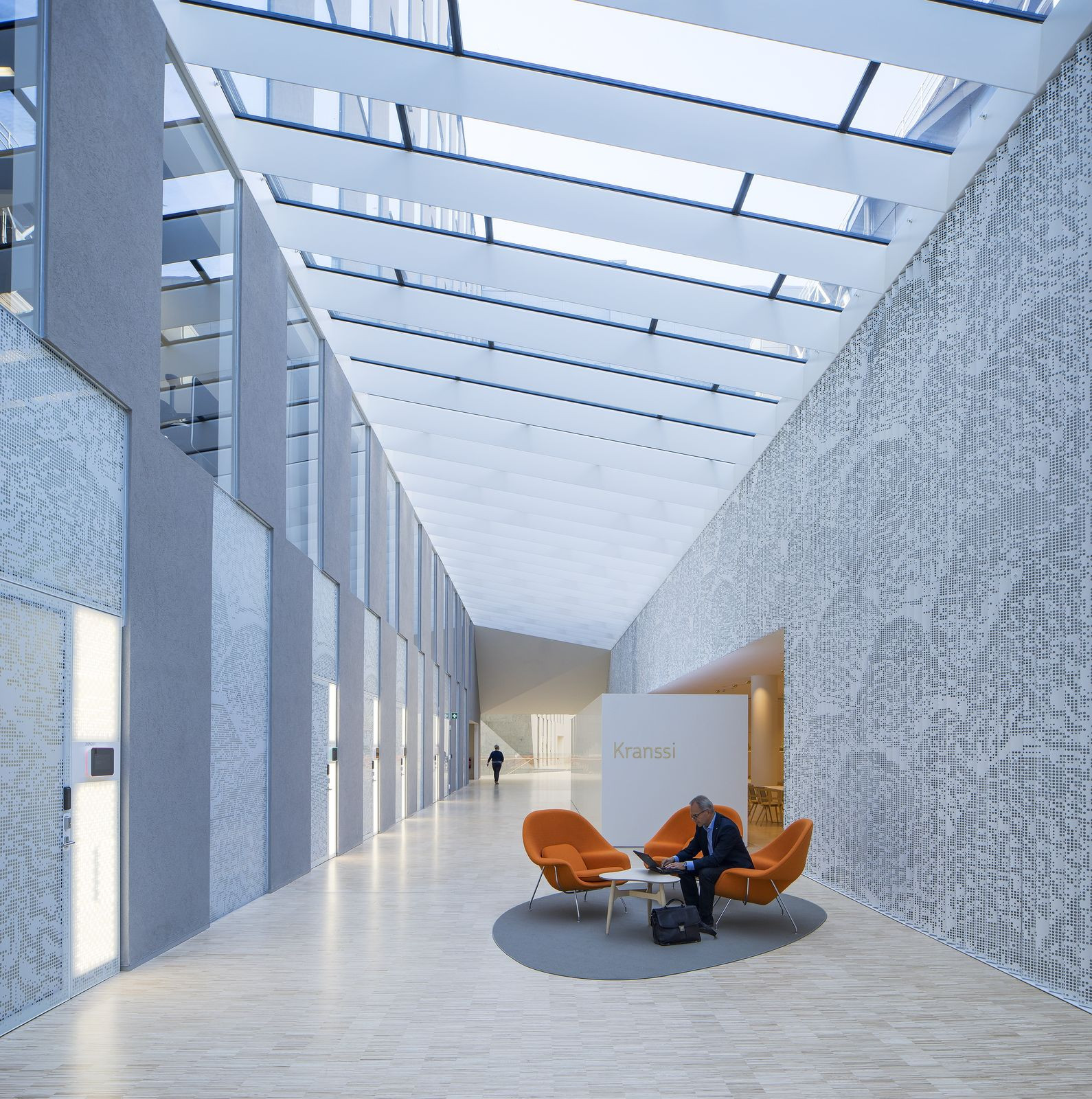 Po sto letech experimentování se ukazuje, že žádné pracovní prostředí není ideální – někomu vyhovuje samostatná kancelář, jinému open-space, někdo trpí v „kreativních prostorech“, jiný zase v prostorech kolektivních. Architekti z JKMM se proto rozhodli v novém kancelářském komplexu v Helsinkách nabídnut všechny typy kanceláří. A protože množstvím různých funkcí už taková kancelář připomíná menší město, přidali rovnou ulice a náměstí. A když už se přidávají ulice a náměstí… tak nemůže chybět ani historické centrum. Tedy alespoň v symbolické rovině – komplex firmy OP je z mnoha částí z kamene.