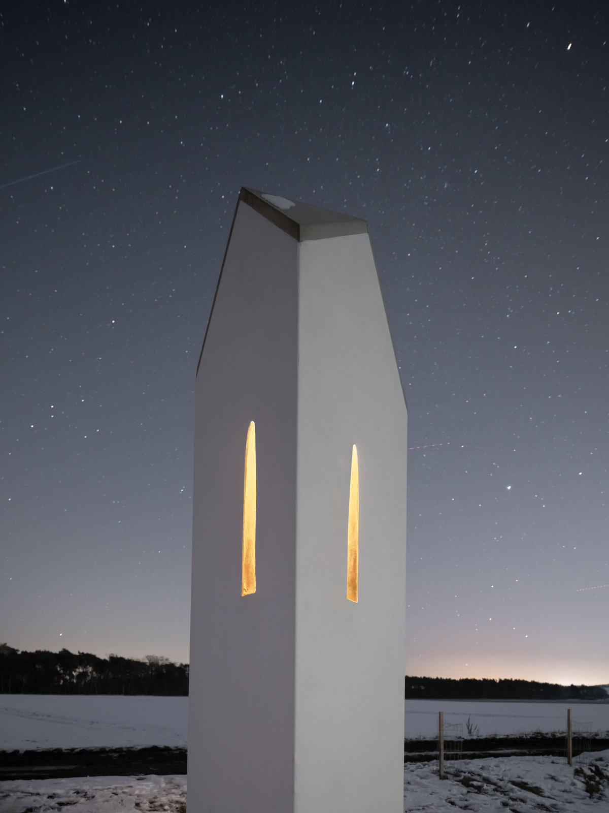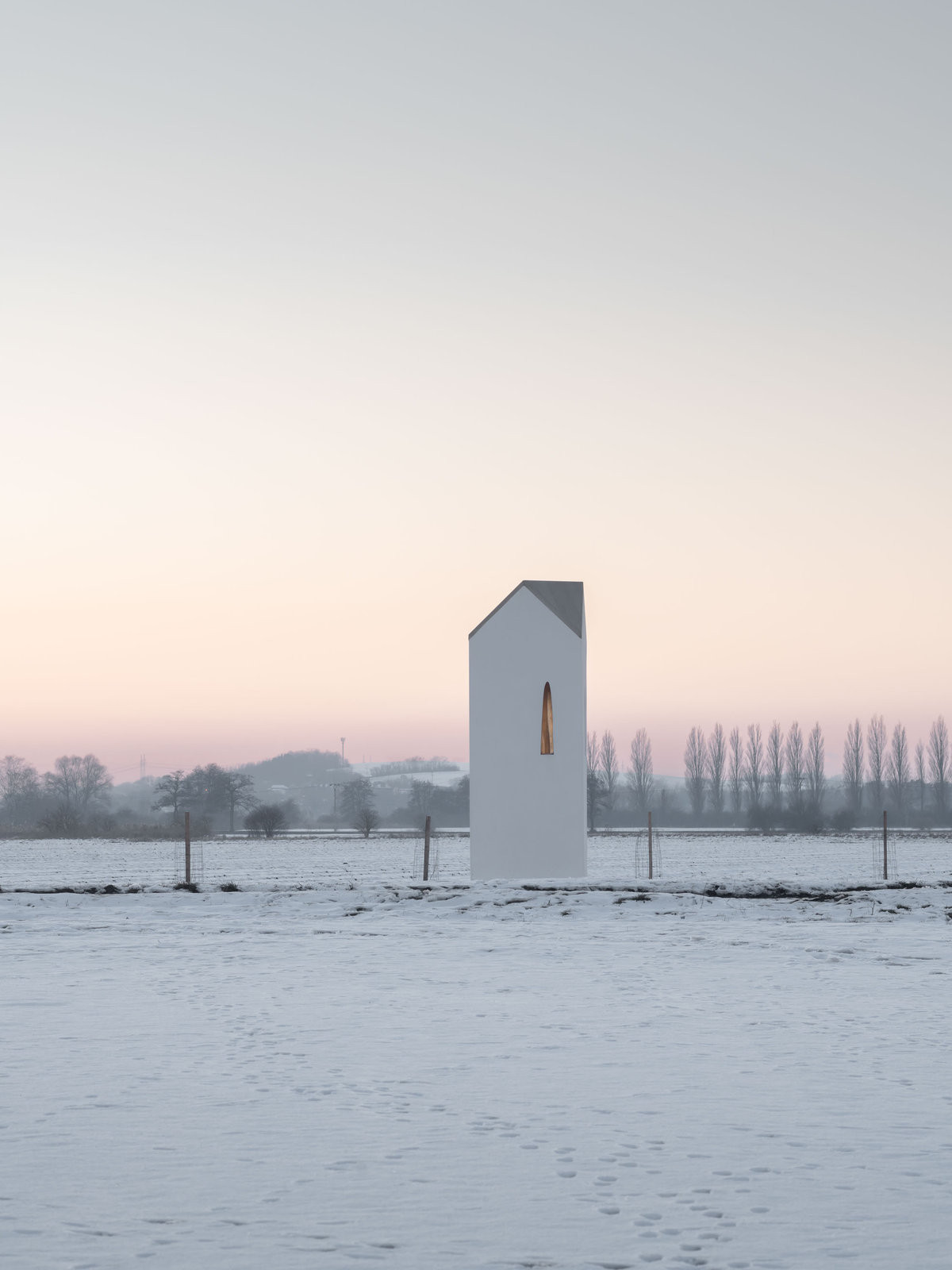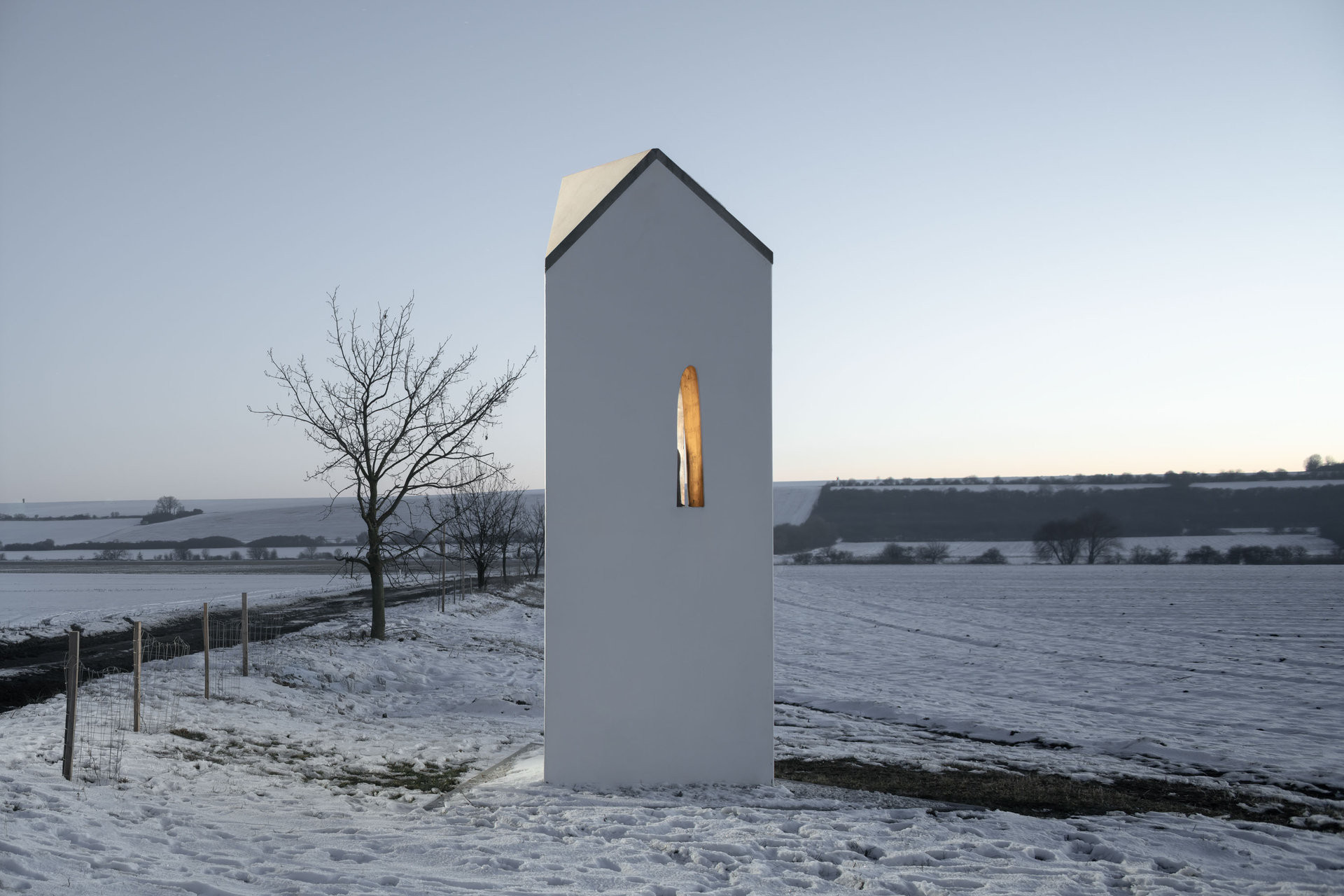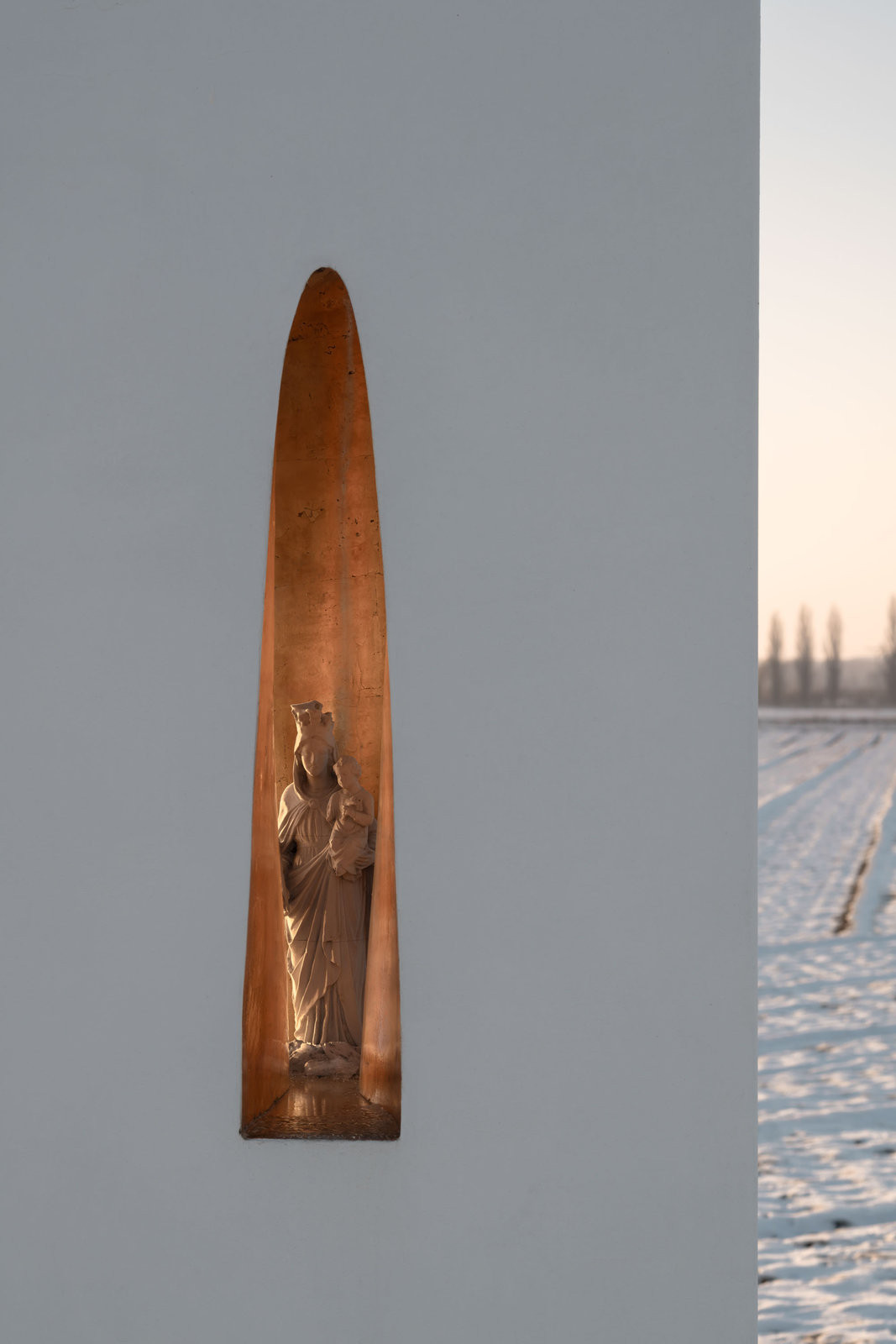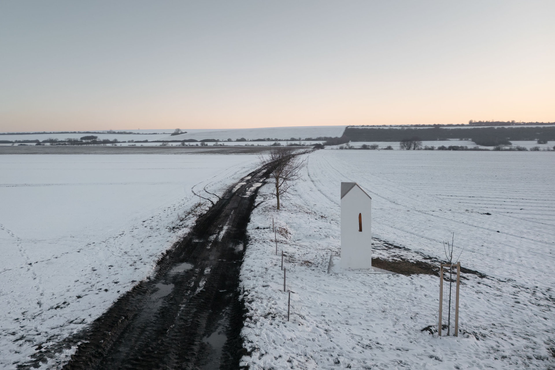 Díky bílé barvě září mezi poli. Z dálky vypadá jako rozcestník, sloupek nebo Boží muka. Ve skutečnosti jde o mariánskou kapli. Vstoupit se do ní ale nedá, takže spíše kapličku. Klasický výklenek, jaký u těchto staveb očekáváme, nahradila hluboká dutina. Uprostřed ní stojí socha Panny Marie, vytištěná na 3D tiskárně.