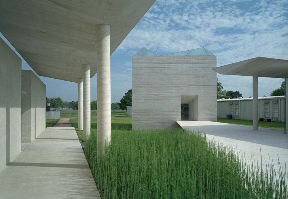 Obvodové budovy Budovy po obvodu nádvoří určují hranici mezi kampusem a okolním venkovským prostředím. Budovy s přilehlými chodníky zastíněnými stříškami jsou koncipovány jako rámec tvořený z vrstev povrchových konstrukcí (stěnami) a meziprostorem místností, který dává hloubku a váhu prožitku pohybu mezi vnitřním duchovním prostorem a světem vnějším. Strategie vrstvení je zřejmá z půdorysu i řezů budovami, kde jsou vidět rovnoběžné plochy betonových a skleněných stěn, zástěn a přístřešků oddělujících a uzavírajících prostory různého významu a náplně.