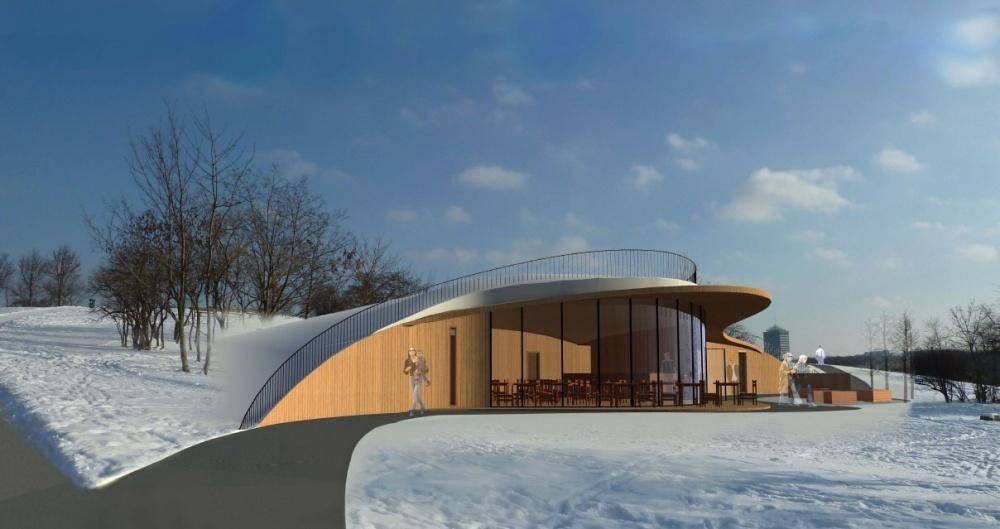 Cílem bylo vytvořit objekt pro příjemné posezení a občerstvení návštěvníků a zároveň splynutí objektu s prostředím parku. Tato myšlenka byla docílena zapuštěním kavárny do stoupajícího terénu ve střední části parku, kde se v blízkosti nalézá dětské hřiště. Na západní straně je objekt nápadný svou prosklenou fasádou, která umožňuje sledování přírody a sportovních aktivit v parku. Při pohledu z východní strany objekt není viditelný a splývá s terénem. Návštěvníky toto místo zaujme výhledem ze střešní části objektu na Prahu. Objekt je navržen jako kavárna s občerstvením pro 30-40 osob s vnitřním i venkovním posezením. Jeho součástí je i půjčovna sportovního vybavení, veřejné toalety a sklad na údržbu parku.