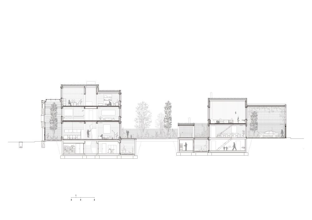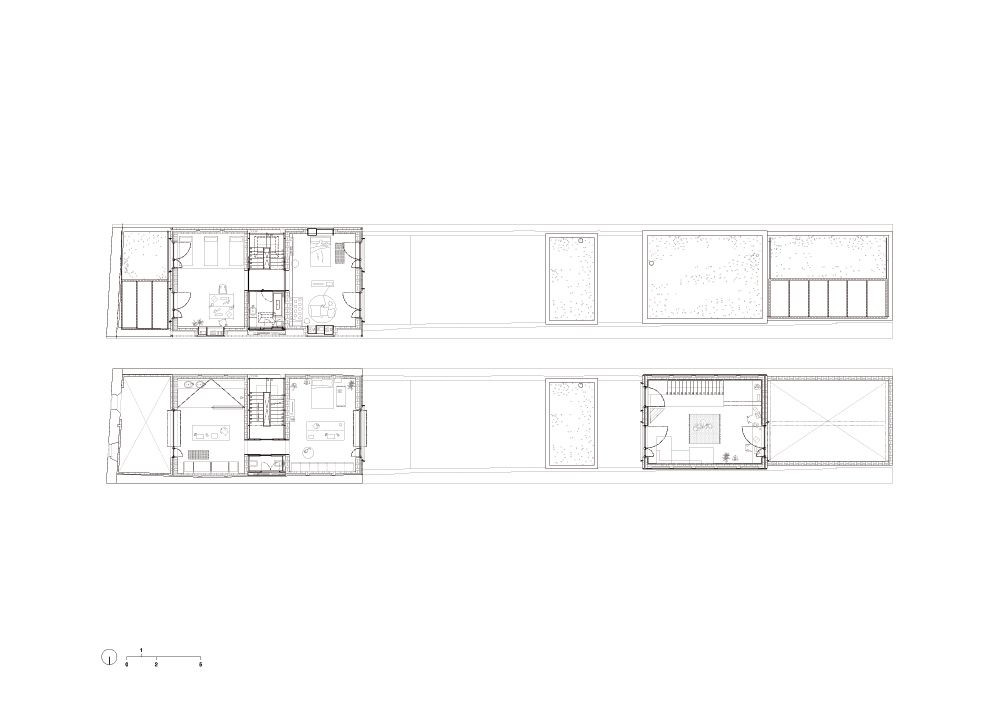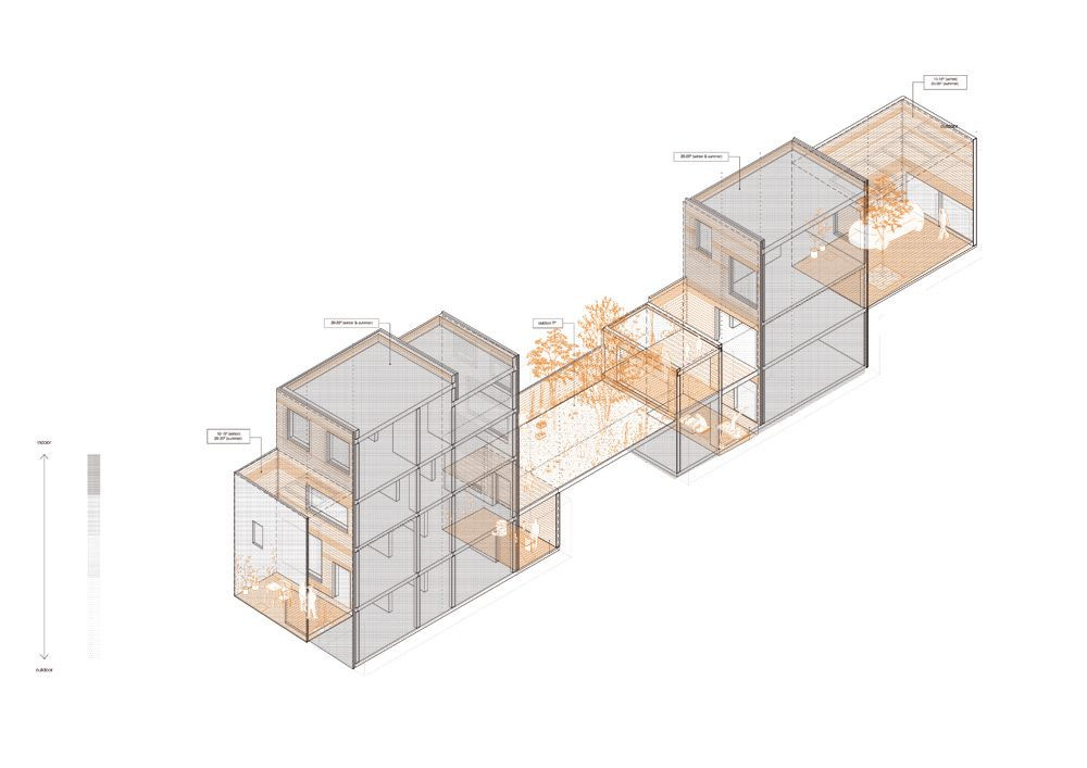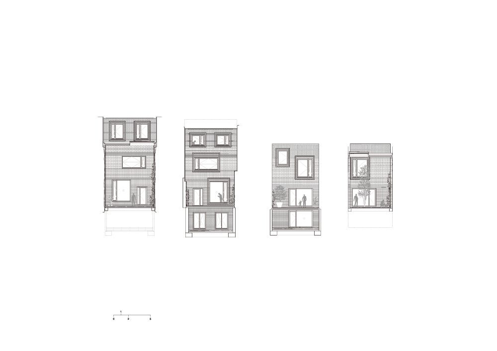Kvůli východo-západní orientaci domu a úzkosti parcely bylo obtížné přivést do nemovitosti dostatek světla. Vedle této nesnáze byl problém i zajistit dostatek soukromí v přízemí celého objektu. Obě nesnáze nás vedly k tomu, že jsme nechali budovu na obou svých koncích ustoupit od uliční čáry a dali zde vzniknout dvěma nádvořím, sloužícím jako předsíně. Dvorky umožňují přísun dostatku světla a zároveň představují místa přechodu. Domu zprostředkovávají soukromí, světlo a tepelný komfort. Ten se tak díky nim stává čitelný od jednoho konce k druhému.