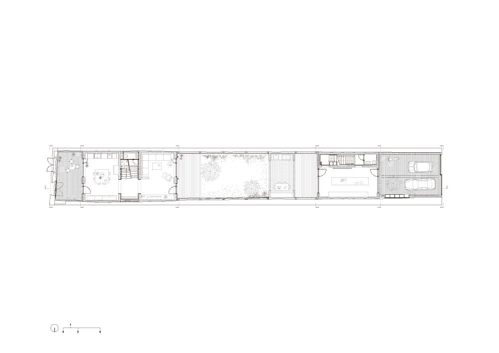Investoři toužili po odlišení dvou zón: jednak domácího prostoru pro každodenní rodinný život, jednak prostoru tichého, izolovaného, funkčně nezávislého, který může sloužit jako obývák a jídelna nebo jako společenský či uvítací prostor pro příležitostné hosty. Vzhledem k platné regulaci v ulici se rozdělení na dvě části samo nabízelo. Domácí zóna je orientována směrem k hlavní ulici, kdežto západní strana, izolovaná a oddělené zahradou ve středu, představuje samostatný prostor. Tudy mají také přístup auta.