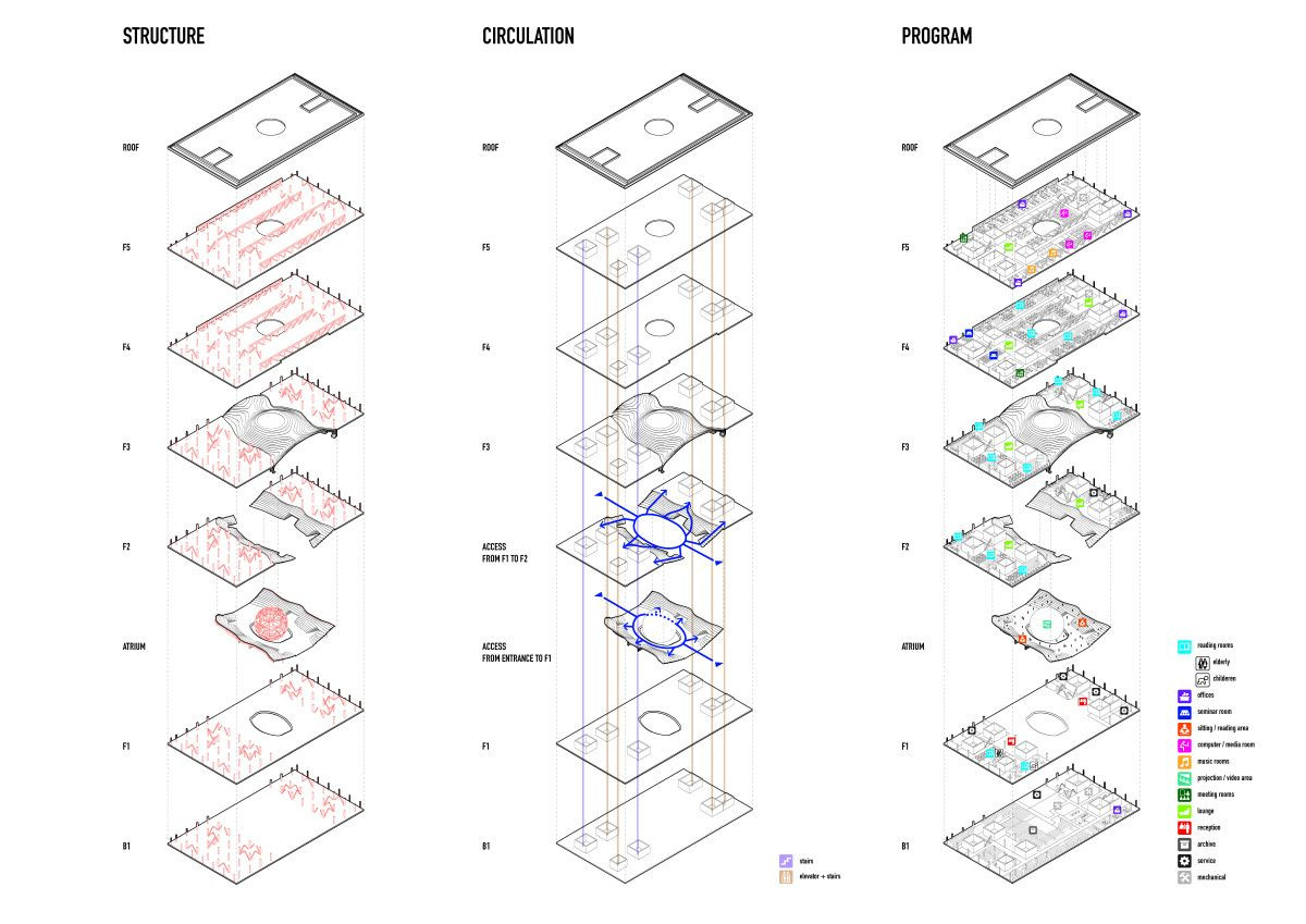 Tyto kaskádovité stupně zároveň plní několik funkcí. Primárně slouží jako knižní police, přímo ale vybízí k procházení nebo posezení s vybranou knihou. Atrium představuje hlavní společenský prostor pětipatrové knihovny, která celkově pojme 1,2 milionu knih. Hlavní archiv se nachází v podzemí, po obvodu budovy pak najdeme různé edukační místnosti, čítárny, kanceláře. Z posledních pater pak vede přístup na dvě střešní terasy.