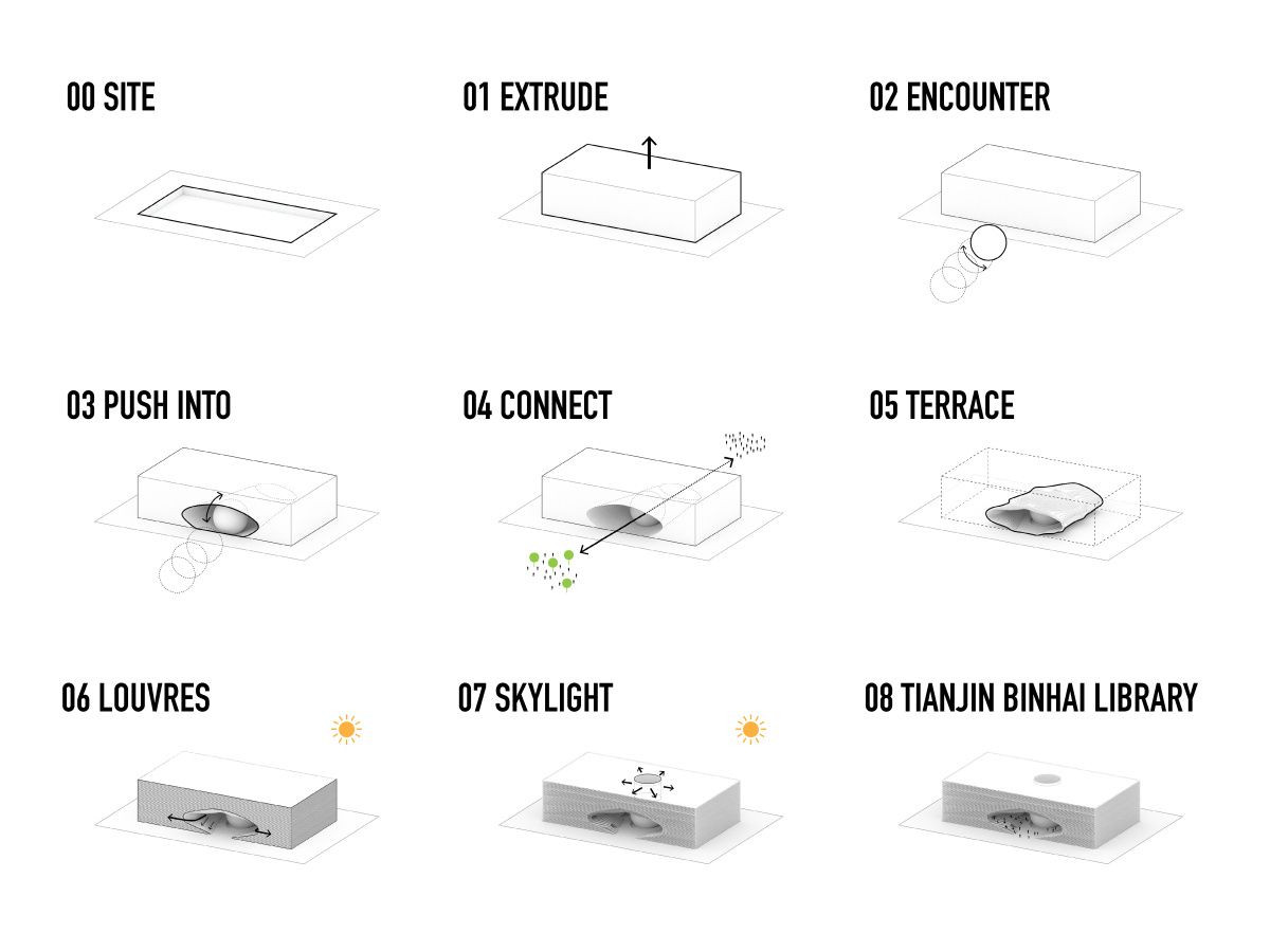 Knihovna vznikla jako součást kulturního komplexu, na kterém (jak už to u podobných čínských projektů bývá) participovala celá plejáda hvězdných architektů. Masterplan zpracovávala velká německá kancelář gmp, další budovy navrhli francouzští architekti Bernard Tschumi Architects, kanadští Bing Thom Architects a studio HH design z USA. MVRDV se přitom chlubí, že se jedná o jejich nejrychleji zpracovaný projekt v historii – od prvních skic až po realizaci totiž uběhly pouhé tři roky, což je u úkolu podobného měřítka opravdu obdivuhodné. Rychlost celé akce byla totiž v zájmu samosprávy čínského města Tianjin nedaleko Pekingu, která si celý komplex objednala.