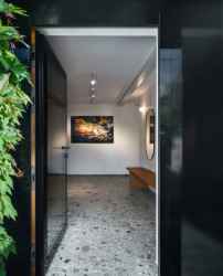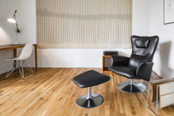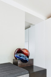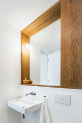 Dům dostal také novou fasádu s tlumenější barevností. A stejná zdrženlivost pokračuje i v interiéru – převládá bílá a šedá výmalba, místy doplněná překližkou, nové vybavení je z masivu. Z původního se zachovaly třeba parkety, schodišťové zábradlí či dveře s nadsvětlíky – úplně všechno tedy pryč nešlo.