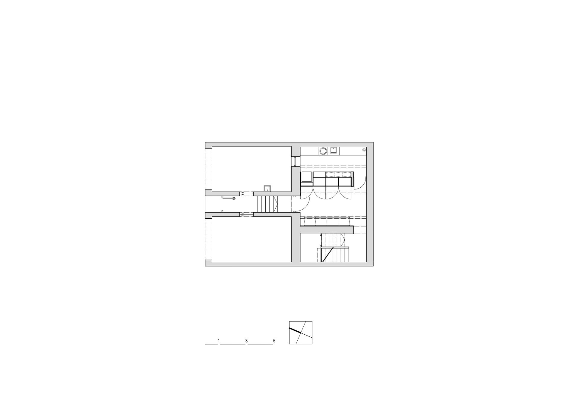 V přízemí se dnes soustředí kuchyně s jídelnou, obývací pokoj a nově také ložnice s koupelnou. Právě ty v původní dispozici chyběly. „Podařilo se vyšetřit místo zmenšením průchodu na zahradu a drobnými souvisejícími změnami“ popisují architekti. Každodenní život se tak odehrává na jedné úrovni, bez nutnosti běhat po schodech a pocitu, že je tady pro dva prostě příliš mnoho prostoru.