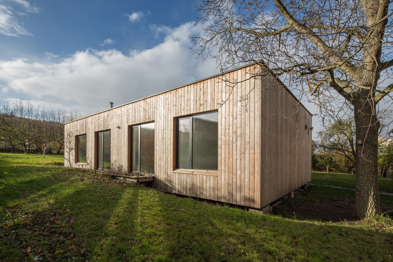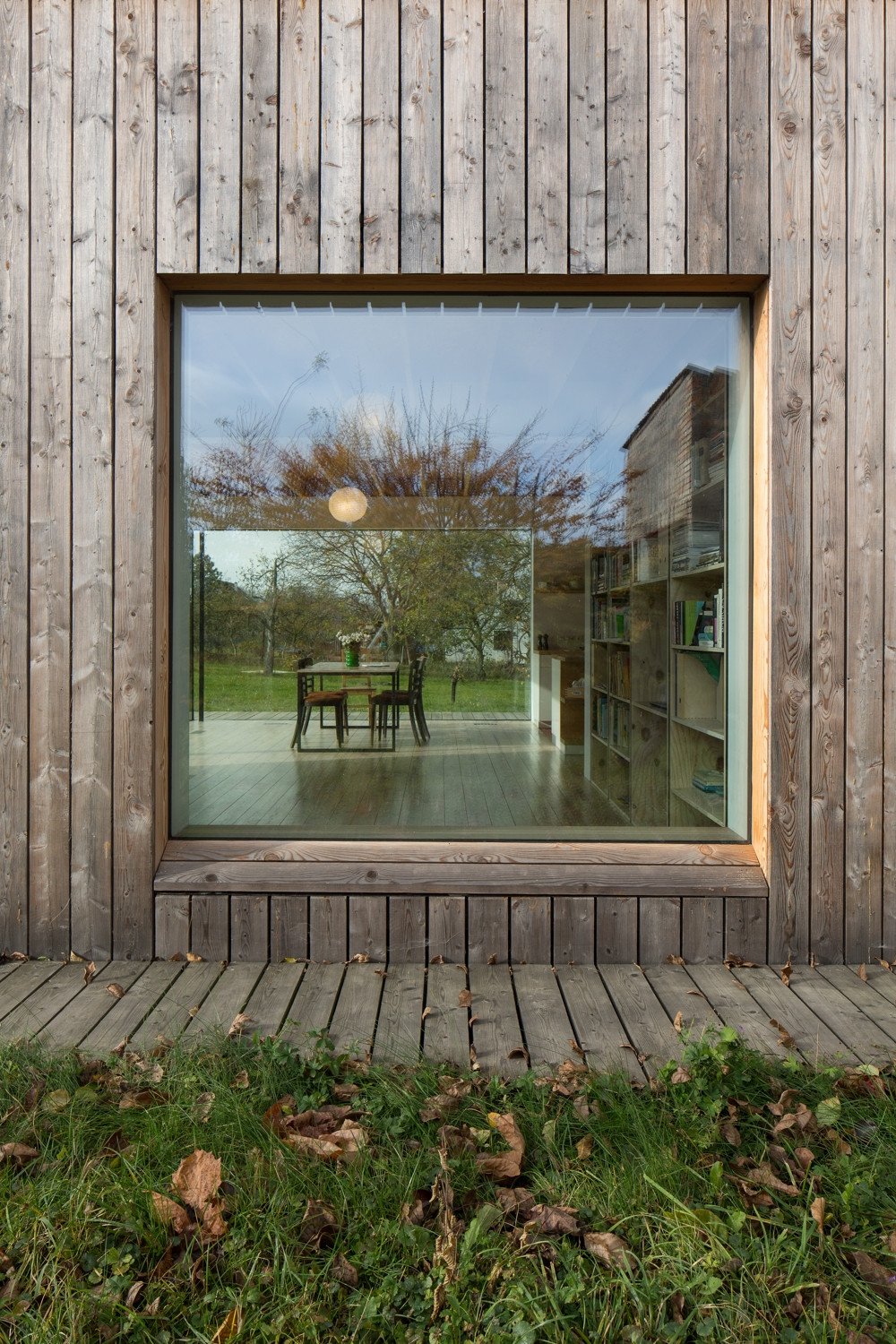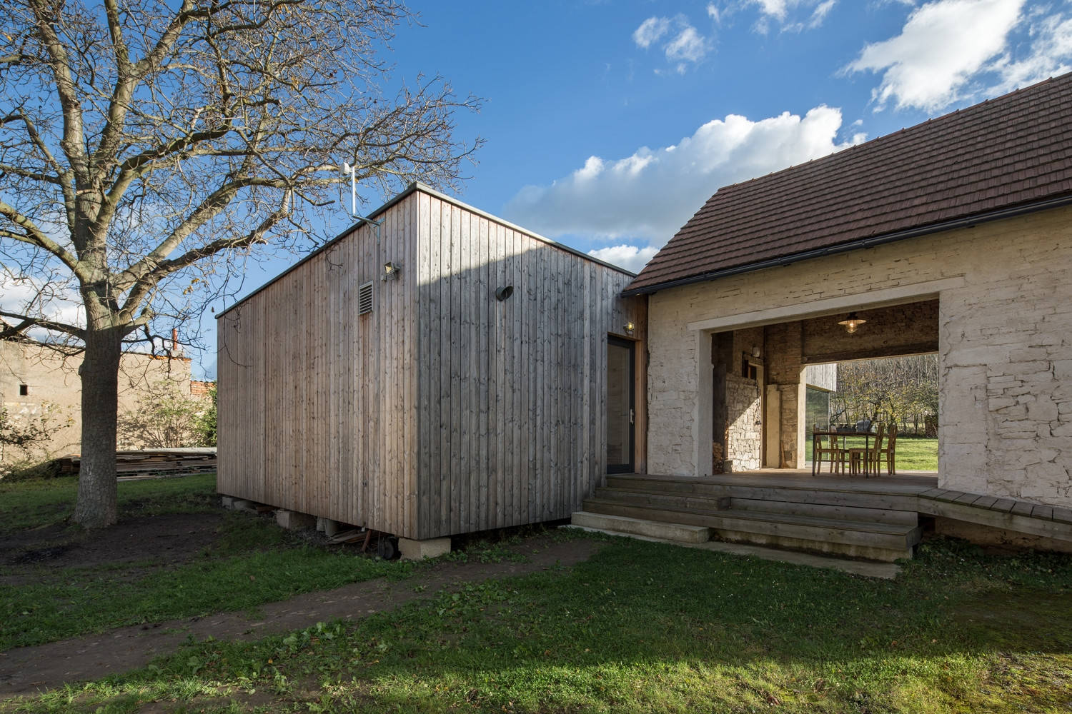 Starý a nový: tradiční venkovskou stodolu se sedlovou střechou doplnil jednoduchý moderní kvádr s velkoryse prosklenými stěnami. Studio Molo architekti tak propojením obou objektů vytvořilo v Českém středohoří rodinný dům, který svým majitelům poskytuje jak nezaměnitelnou atmosféru venkova, tak i současný komfort bydlení. Obě části se také otevírají do přilehlého ovocného sadu, čímž dochází k vizuálnímu propojení interiéru se zahradou.