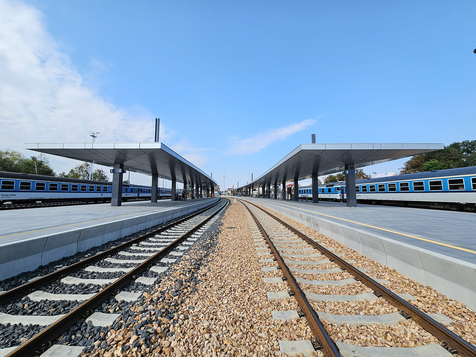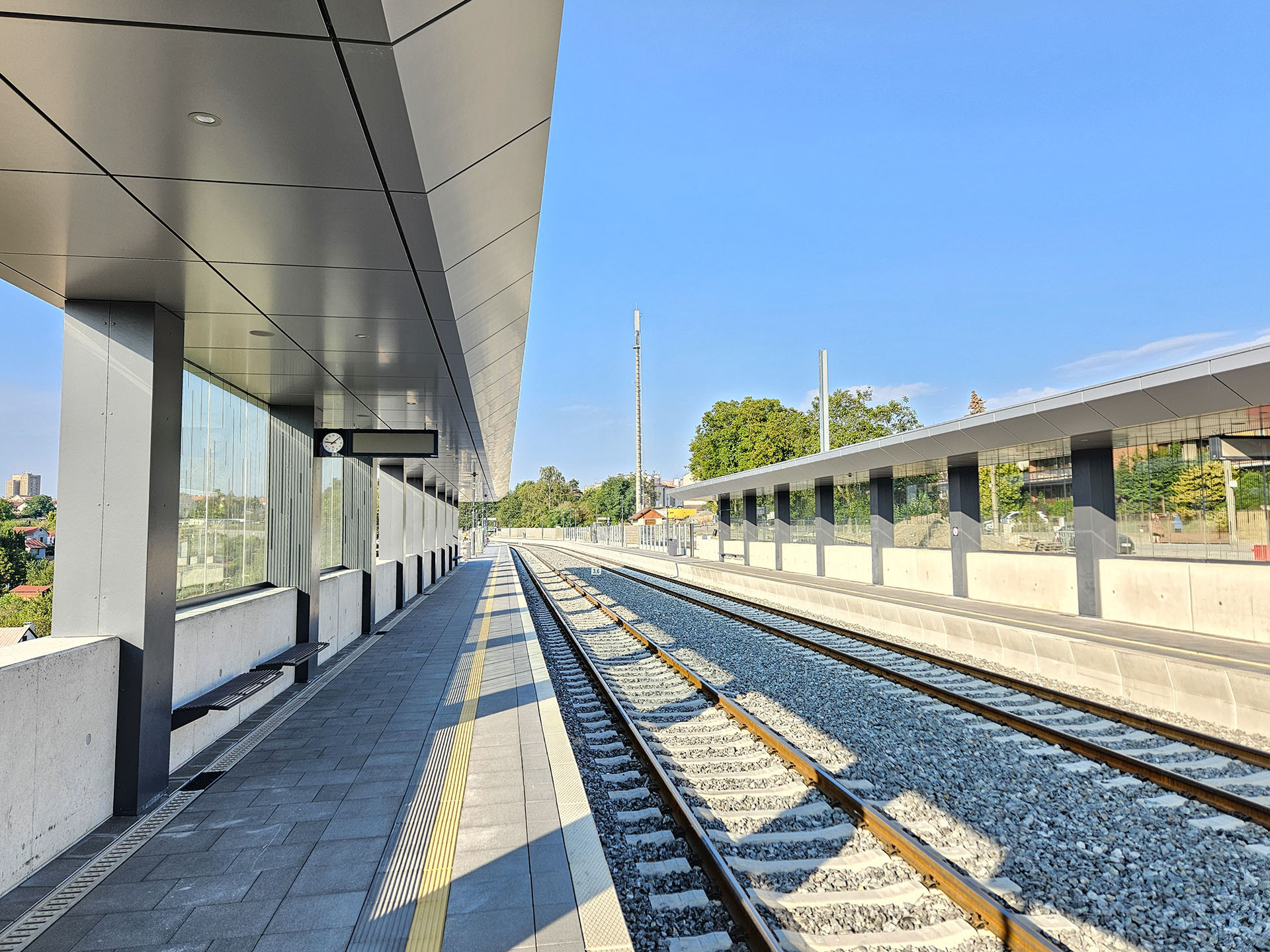 Dvě ostrovní nástupiště o délce 141 metrů ovšem už teď slouží cestujícím. Chrání je přístřešky se střešní krytinou z trapézového plechu s aluzinkovou povrchovou úpravou a kazetovým podhledem. Nad ním jsou vedeny kabelové žlaby a technologie pro integrované reproduktory, světla a kamery. Nosné sloupy jsou opláštěny kryty z ohýbaného plechu.