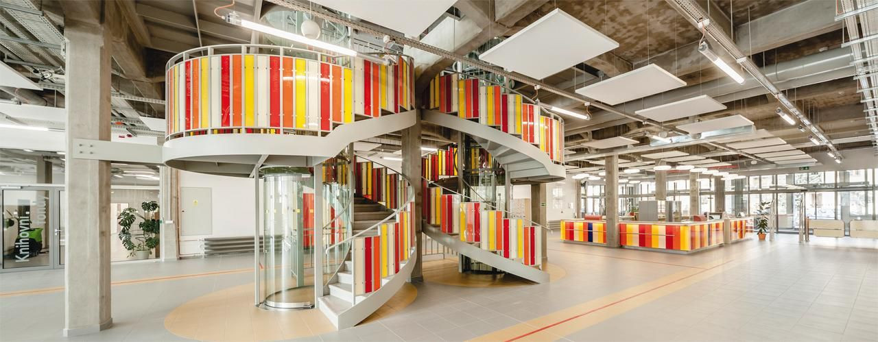 Ak sa rozhodnete pokračovať ďalej do knižnice, ocitnete sa v priestornej hale, ktorá plní hneď niekoľko funkcii. Priamo za vstupom je umiestnené kontaktné miesto, kde máte možnosť vrátiť knihy. Vľavo objavíte audioknižnicu pre nevidomých. Obsahuje zvukové knihy, náučné i beletriu, pre deti i dospelých. Funguje predovšetkým zásielkovo. Umožňuje objednať si knihu z tepla známych prostredí. Vpravo od vstupu sa nachádza galéria. Za prvou kontaktnou líniou sú po oboch stranách umiestnené šatne. Jedna klasická, divadelná, s pani šatniarkou a ostatnými náležitosťami. Druhá, dá sa povedať, individuálna. Obsahuje skrinky niekoľkých veľkostí s možnosťou uzamknutia. V centre haly vás upútajú dve schodiská. Ich zábradlie tvoria pomyselné chrbty kníh s menami desiatok slávnych autorov ako Kafka, Remarque, Hrabal, Lustig alebo Hemingway. Obe schodiská sa vinú okolo kruhových zdvižných plošín v presklených valcoch. Priestor končí preskleným zadným únikovým schodiskom s výťahmi.