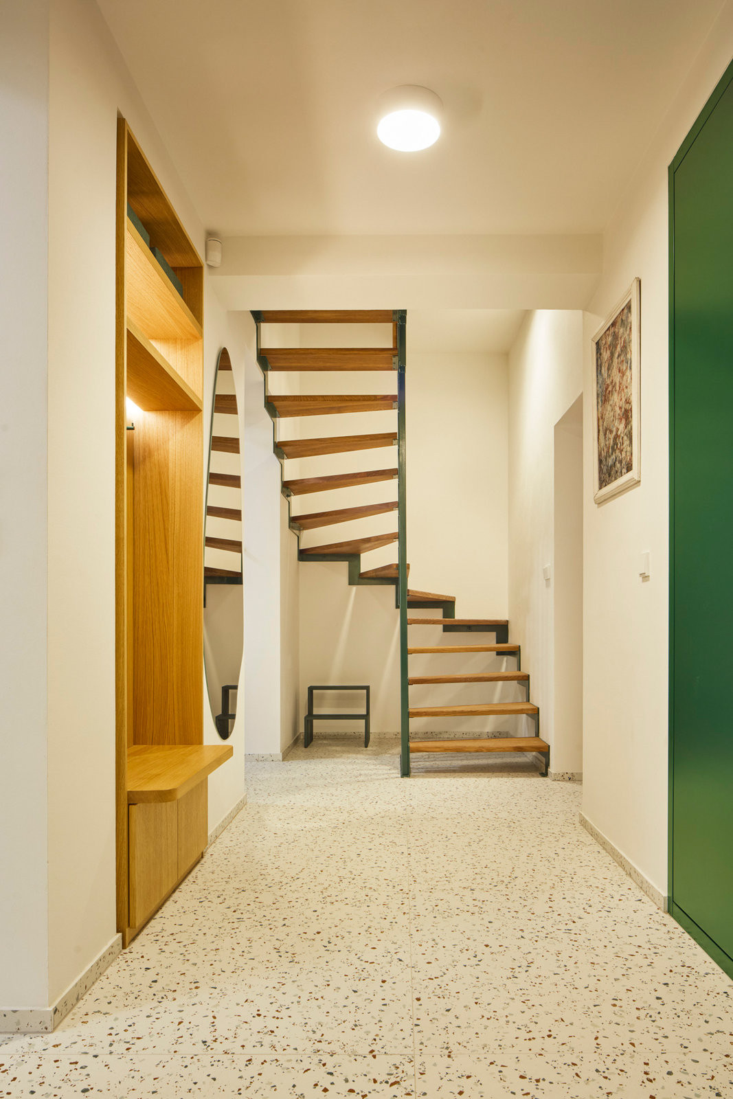 Hlavním komunikačním uzlem bytu je vstupní chodba s podlahou z trvanlivého teraca. Dostává se z ní také do patra bytu. A to po schodišti se sytě zeleným zábradlím a dřevěnými nášlapy.