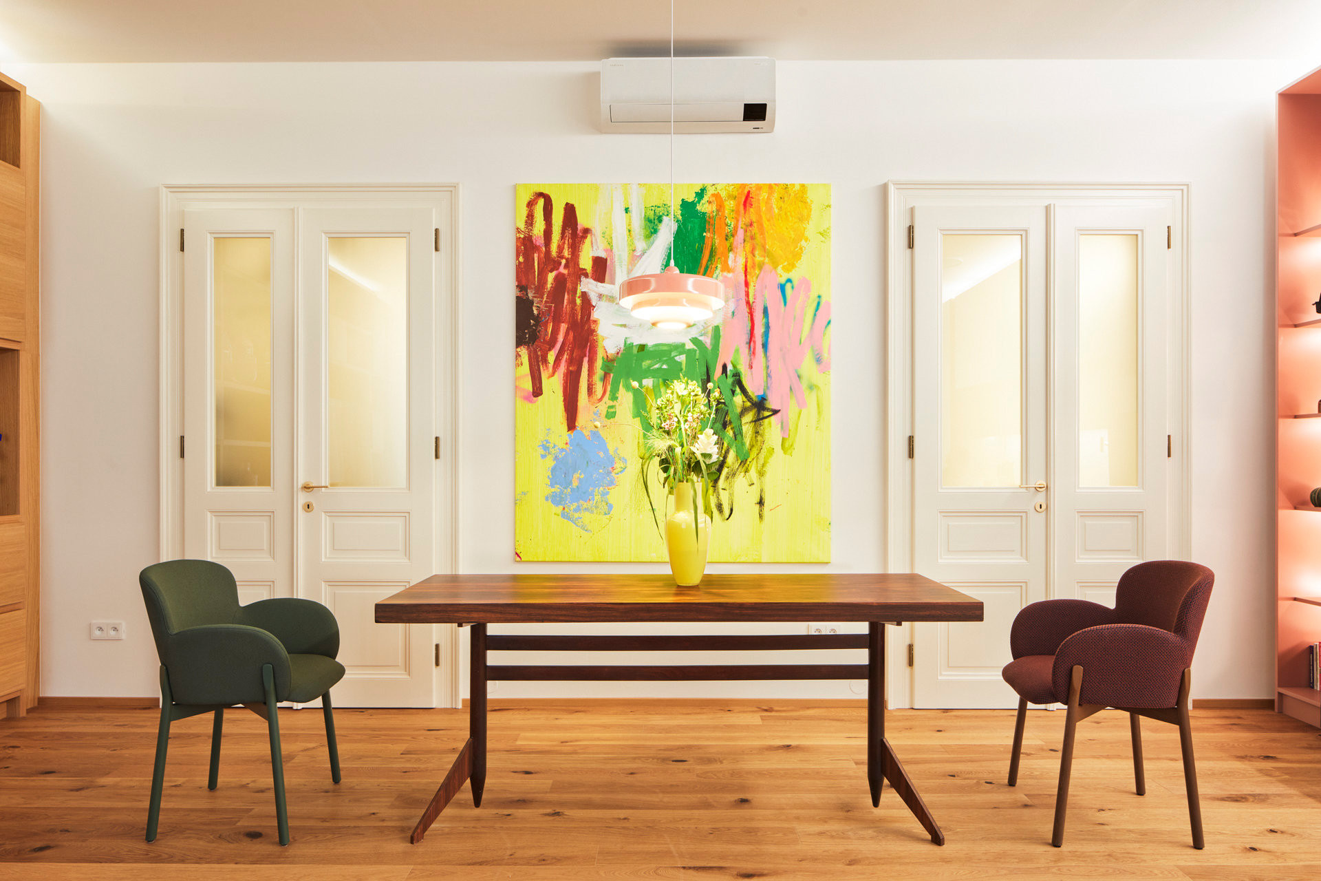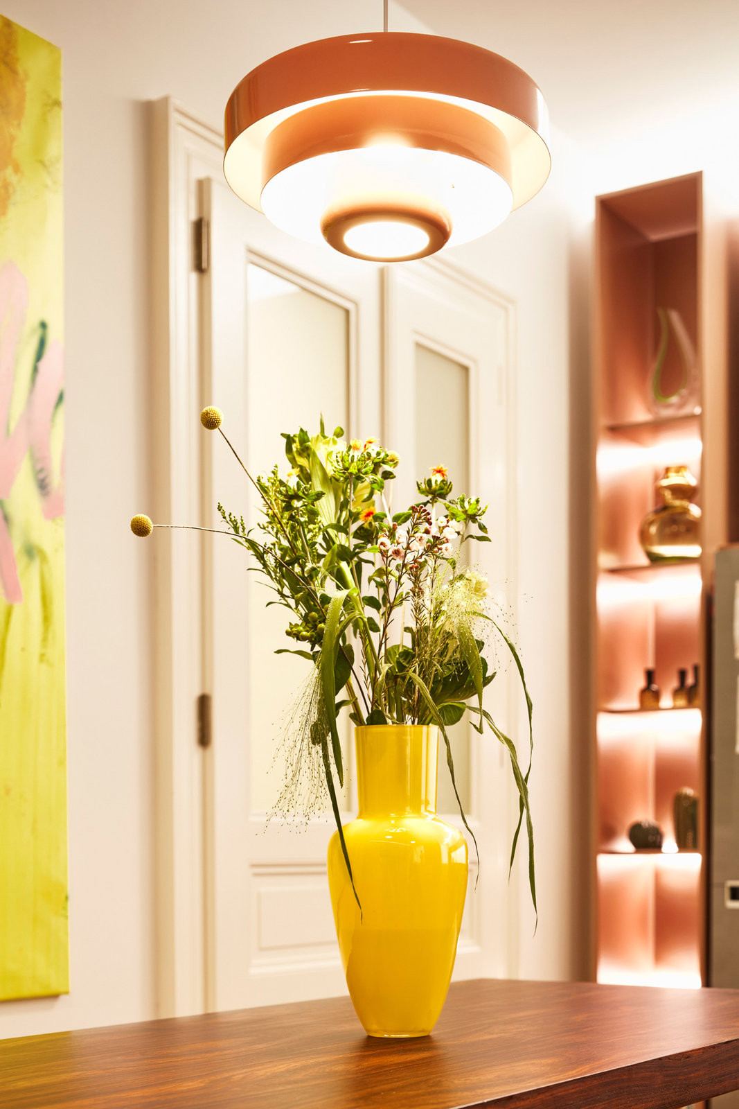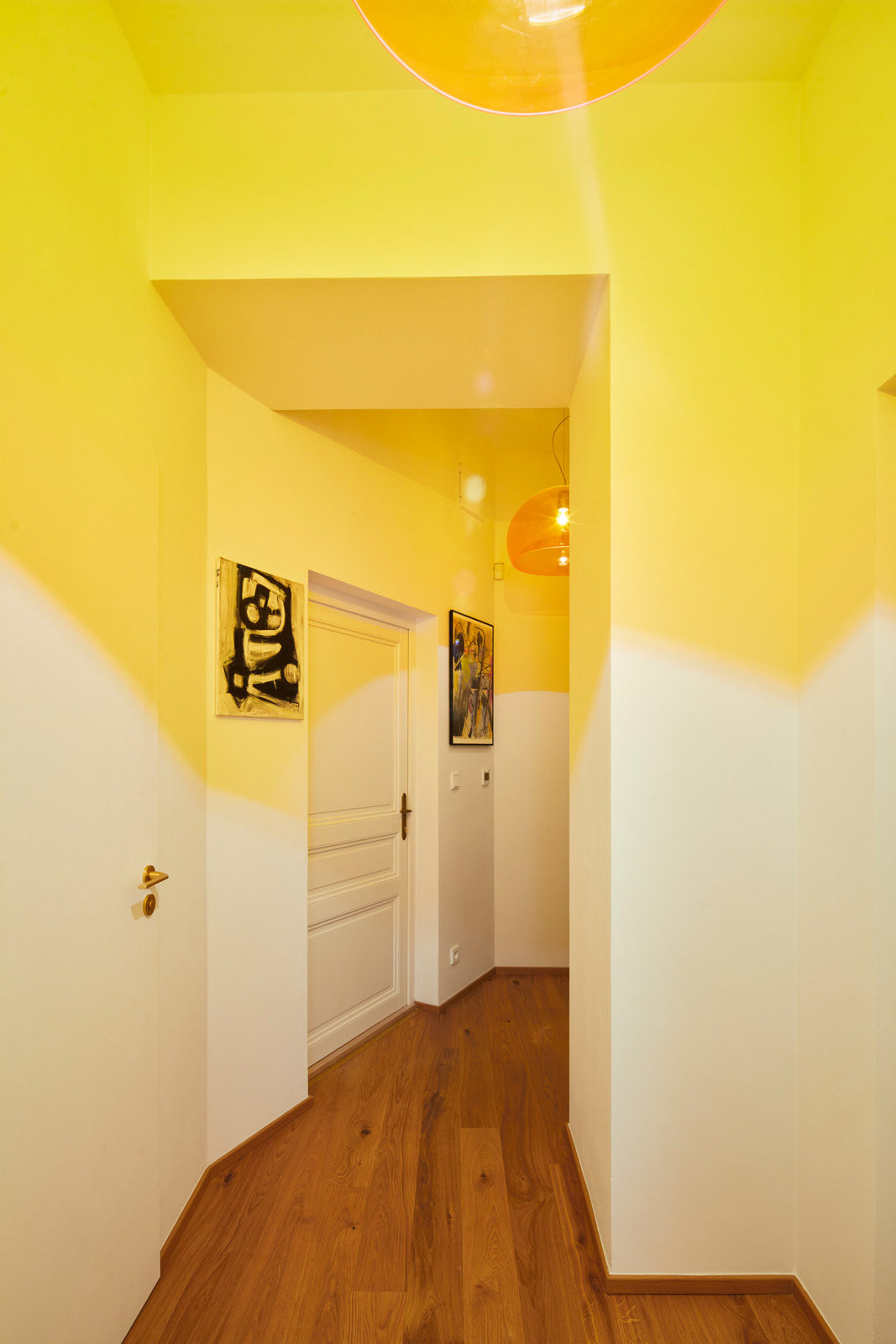 „Přáli jsme si vytvořit prostor, který bude vizuálně působivý a zároveň přirozený pro každodenní život,“ tak rodina popsala architektce své představy o novém bydlení. Součástí zadání bylo i zakomponování jejich sbírky umění a designu. Obrazy současných autorů, skleněné vázy i vintage nábytek ze 40.–50. let se dnes objevují napříč bytem – velká plátna visí nad jídelním stolem i v ložnici, menší formáty doplňují žluto-oranžovou chodbu. Sbírka se stala odrazovým můstkem pro barevnost celého interiéru.