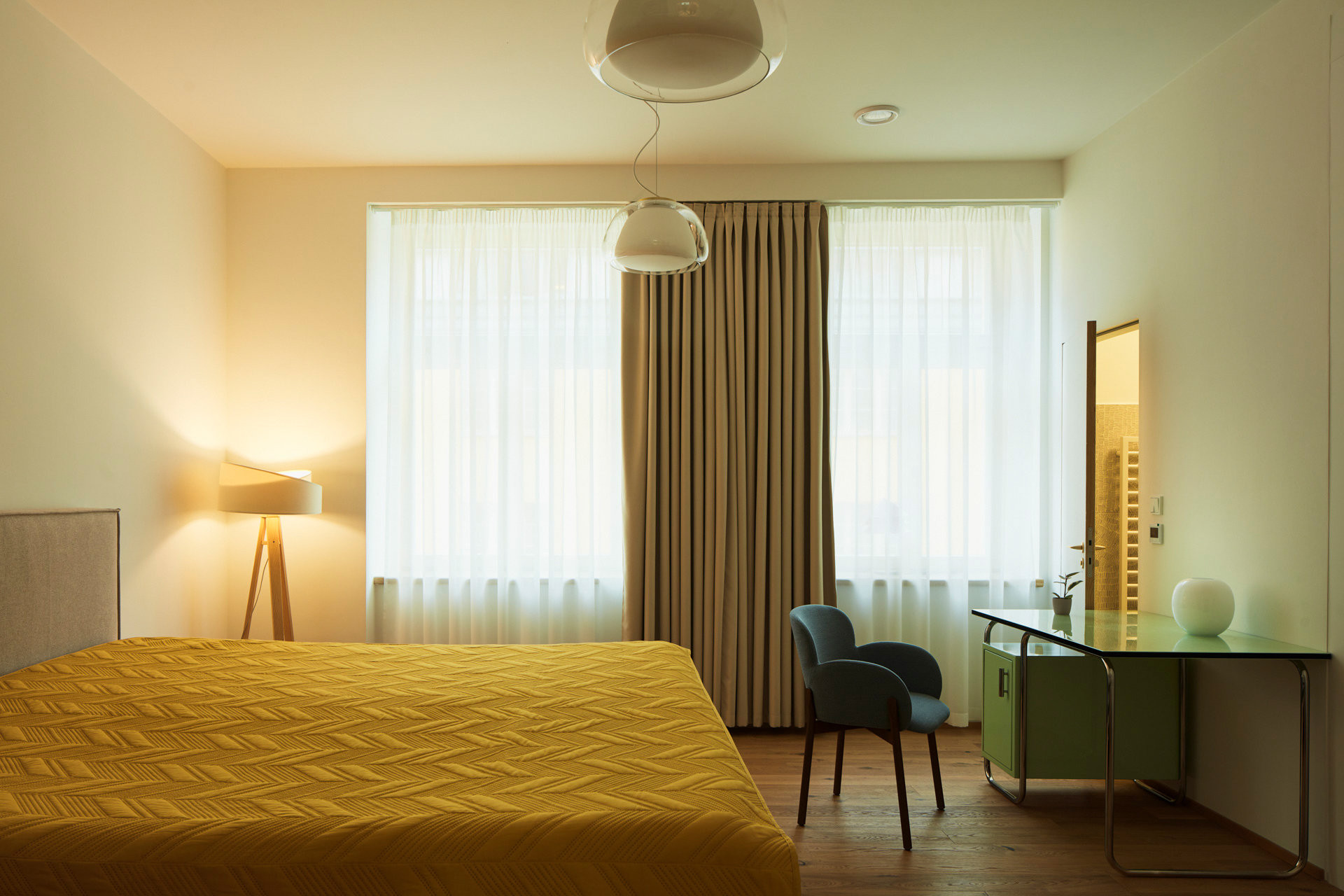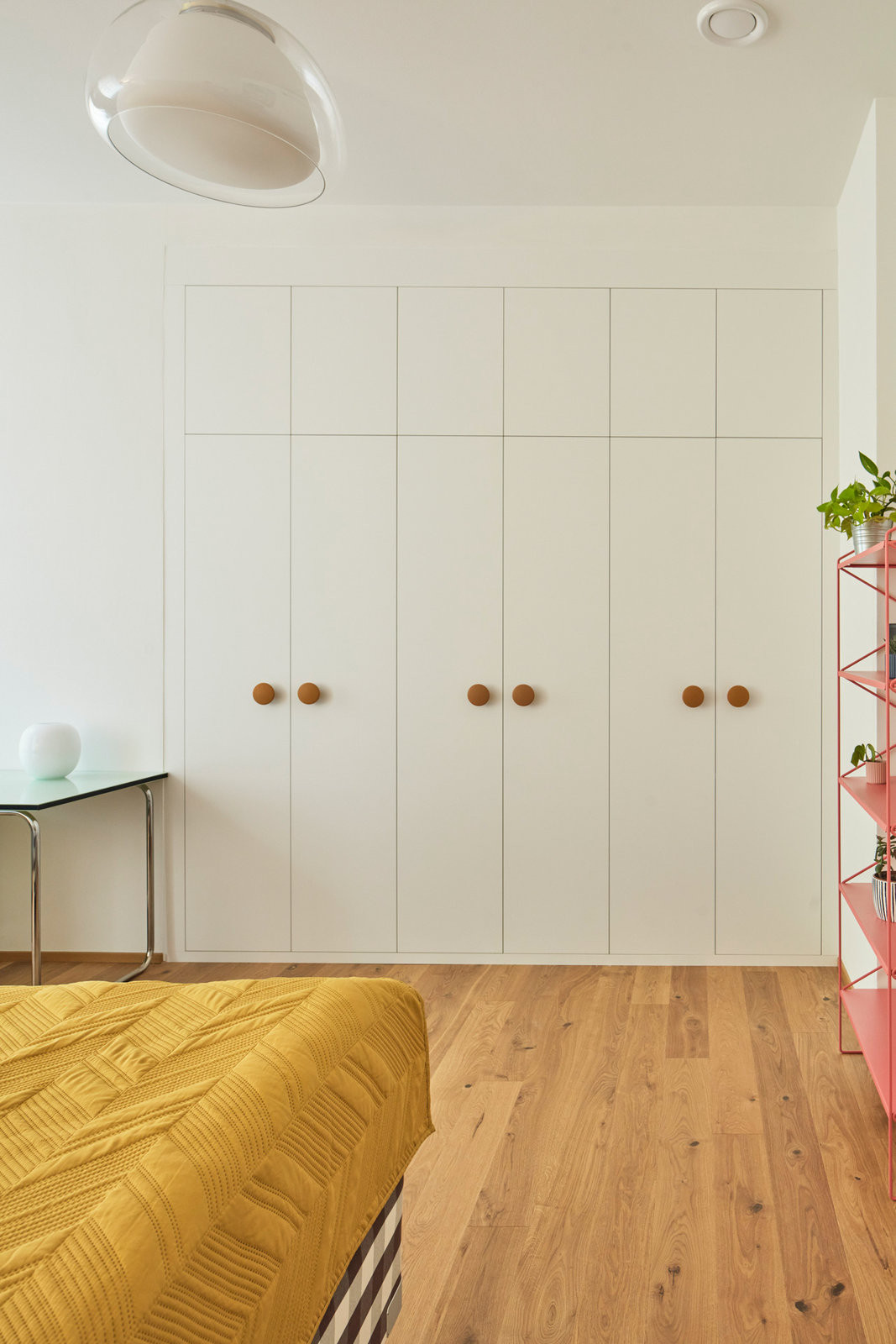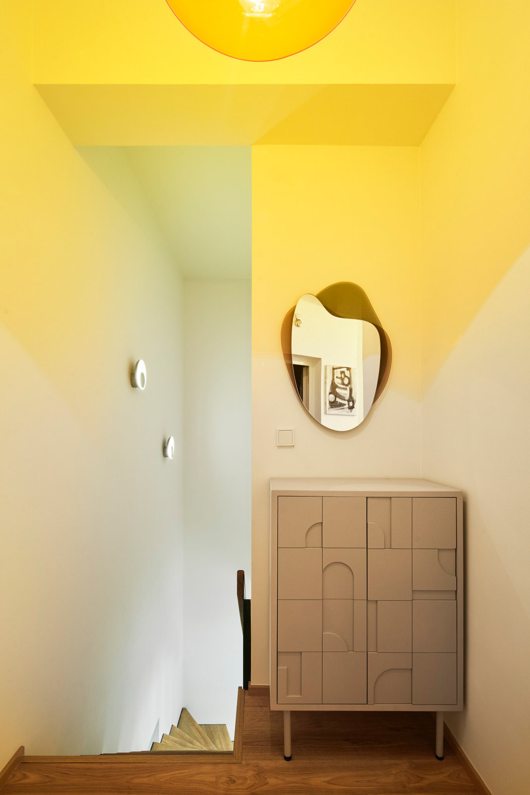„Přáli jsme si vytvořit prostor, který bude vizuálně působivý a zároveň přirozený pro každodenní život,“ tak rodina popsala architektce své představy o novém bydlení. Součástí zadání bylo i zakomponování jejich sbírky umění a designu. Obrazy současných autorů, skleněné vázy i vintage nábytek ze 40.–50. let se dnes objevují napříč bytem – velká plátna visí nad jídelním stolem i v ložnici, menší formáty doplňují žluto-oranžovou chodbu. Sbírka se stala odrazovým můstkem pro barevnost celého interiéru.