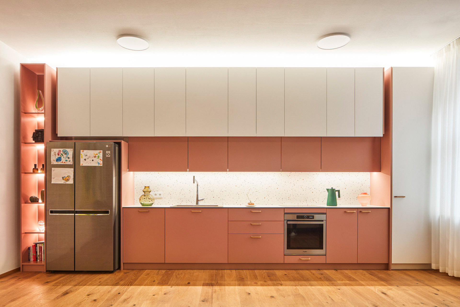 V prvním podlaží se nachází hlavní obytný prostor s jídelnou a kuchyní. Bílo-růžová linka navazuje na růžové závěsy a barevné akcenty v solitérním nábytku, vestavby mají převážně neutrální odstíny a dekor dřeva. Ložnice na stejném patře zůstala z celého bytu nejméně barevná – převládá v ní bílá a barvy vnáší několik kusů nábytku. Růžová z kuchyně se tu opakuje na knihovně.