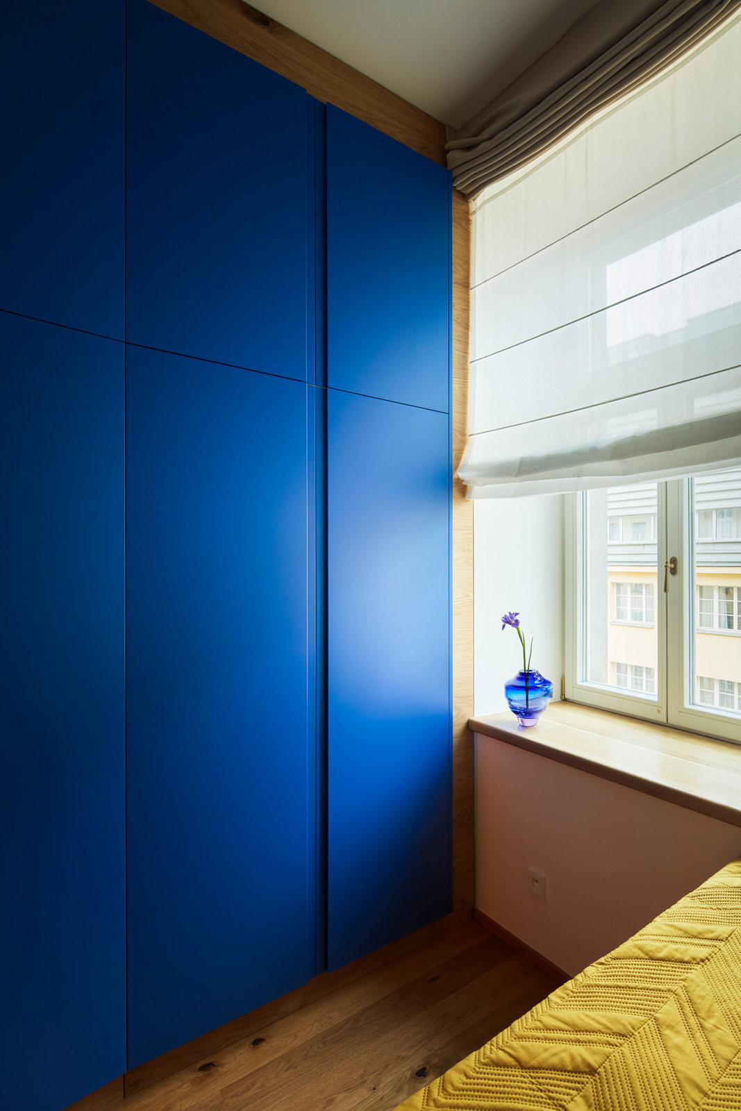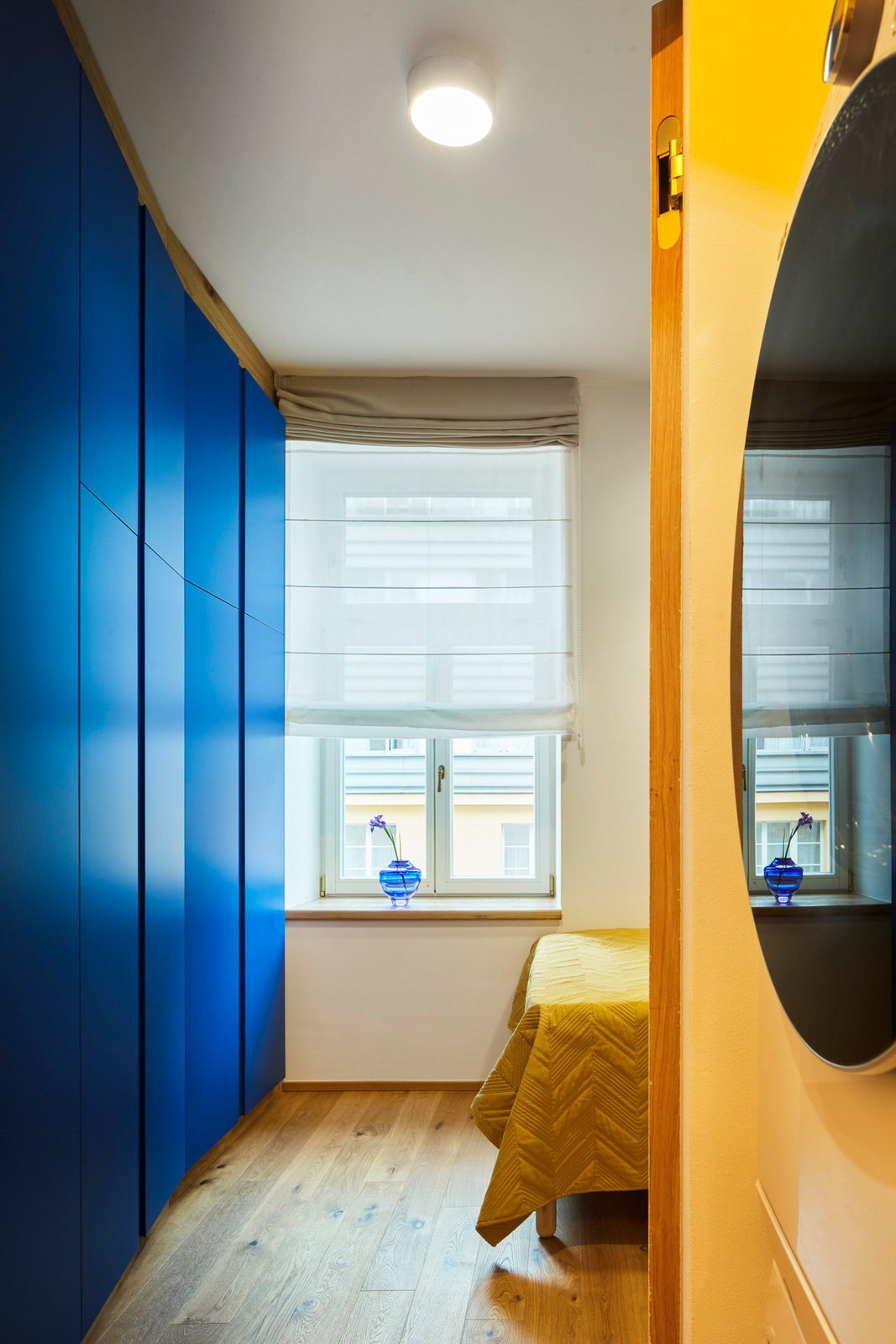 V patře se pak nachází koupelna a dva soukromé pokoje. Ozvláštnění do obou z nich vnáší sytě modrá vestavná skříň. Barevná paleta – tvořená zelenou, růžovou, modrou a oranžovou – se v novoměstském bytě volně přelévá z místnosti do místnosti. Interiér je tak dost živý, ale přitom sjednocený, nepůsobí roztříštěně.