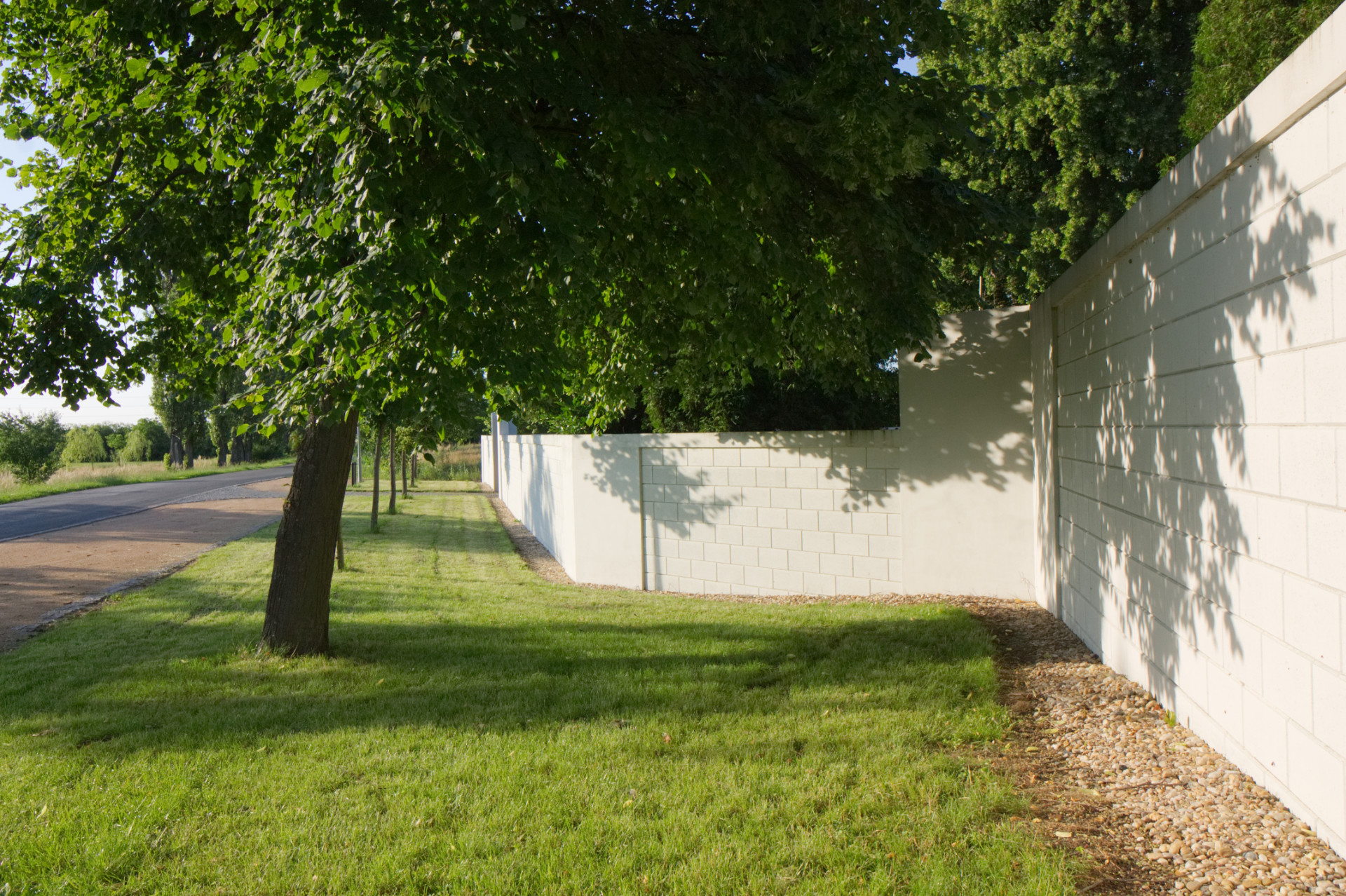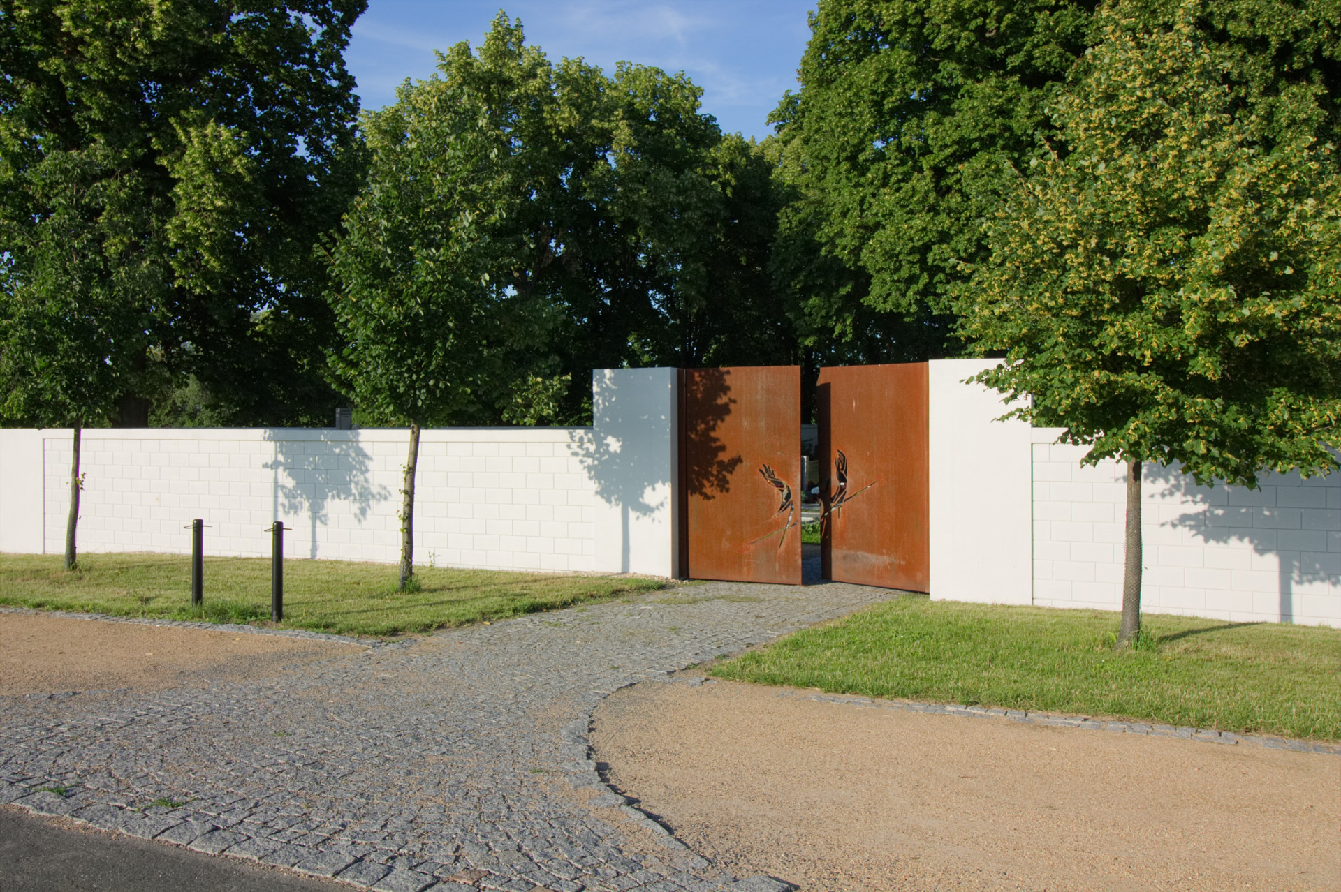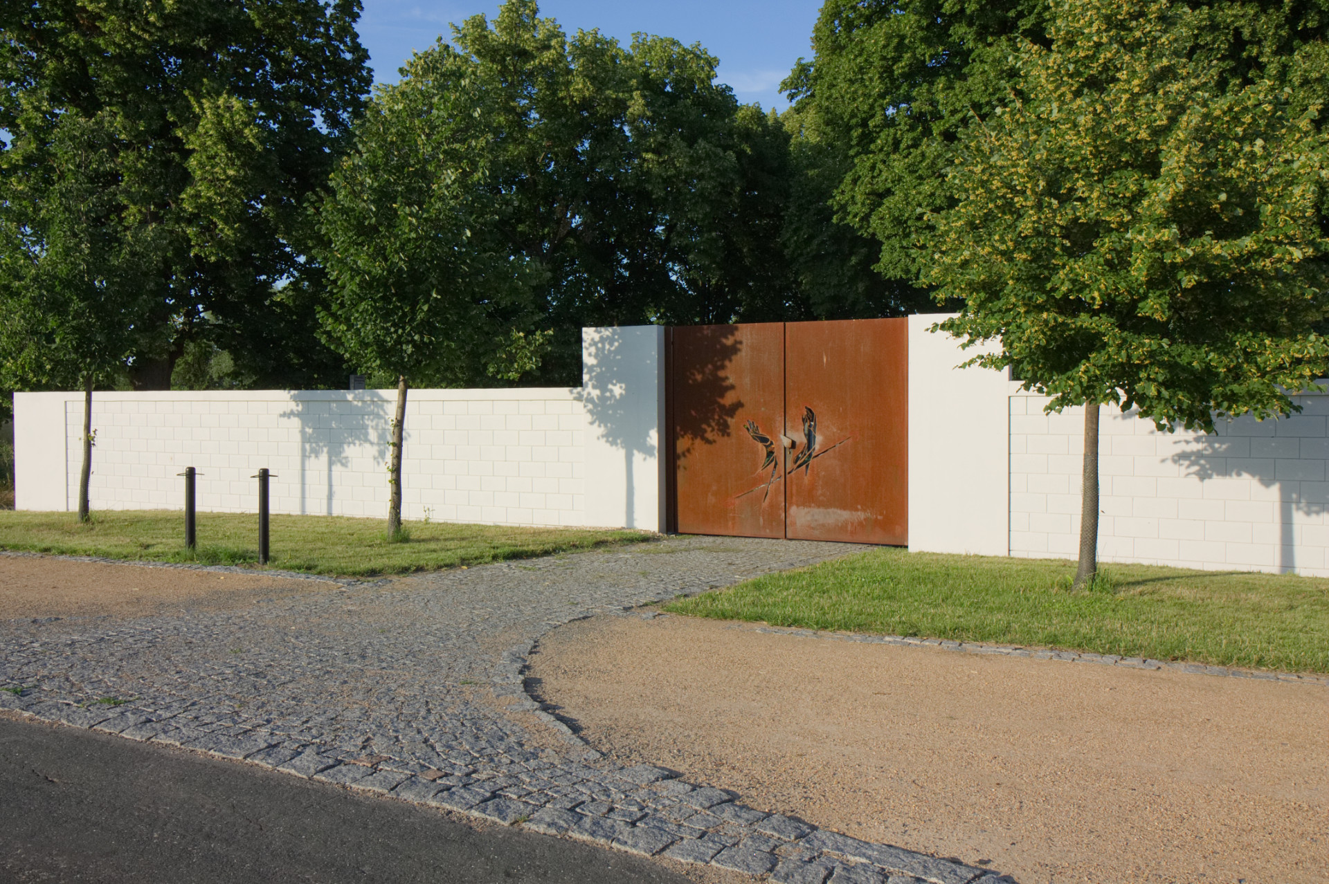 Nová hřbitovní zeď je bílá, provedená z betonových kvádrů. „Působí z části tradičně díky přiznaným betonovým tvarovkám kladeným na vazbu, naznačeným římsám a obligátnímu, byť nenápadnému zvýraznění nárožních pilířů,“ píše architekt v autorské zprávě. S bílou zdí kontrastuje brána z korodované oceli kortenu od výtvarníka Jana Dostála; známý je zejména díky plastice pro EXPO 2021 v Dubaji. Je v ní prořezaný motiv dlaní. „Natažené ruce ostatních nás provázejí od dětství až do smrti, zdála se nám to vhodná symbolika,“ říká starosta Bulušek.