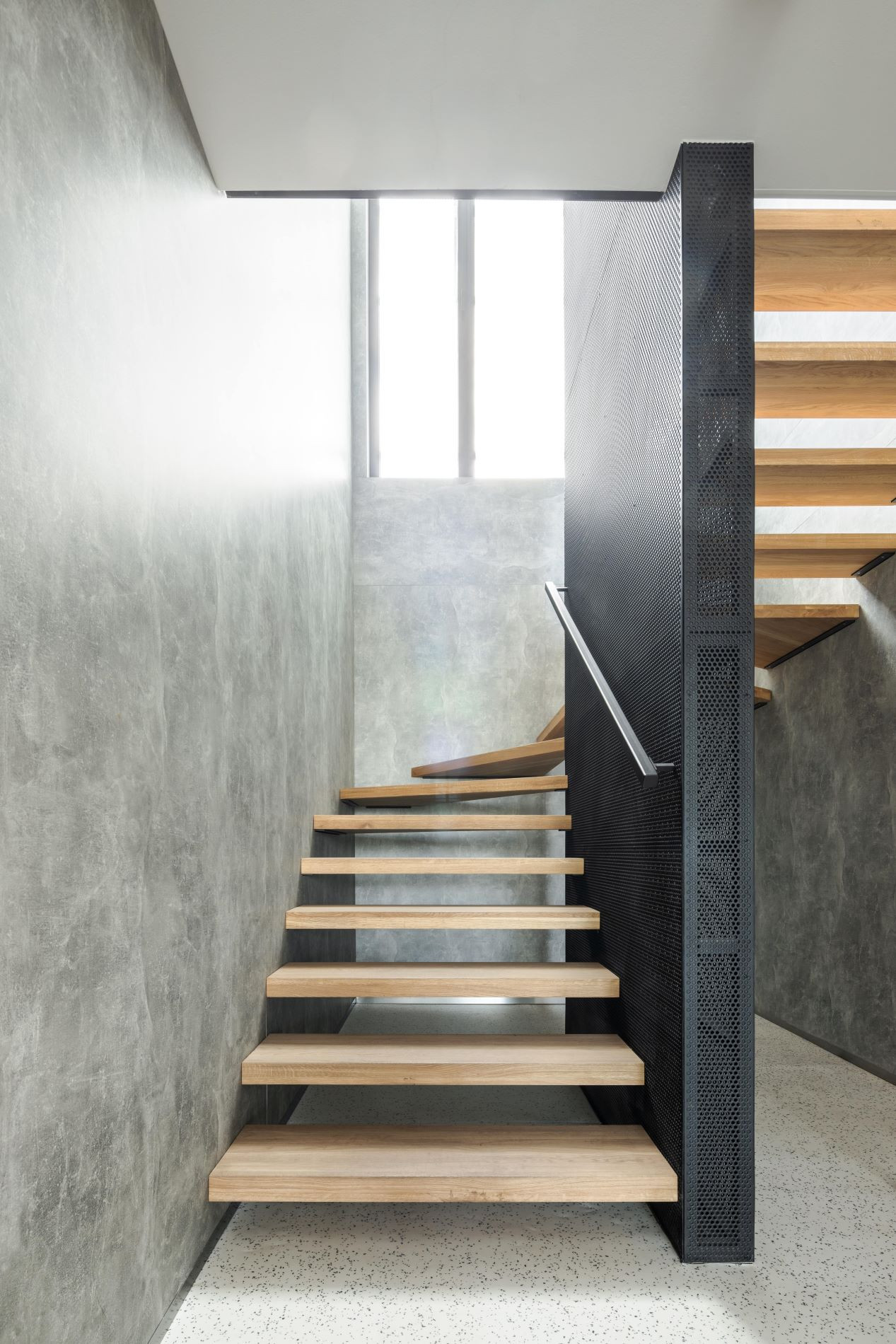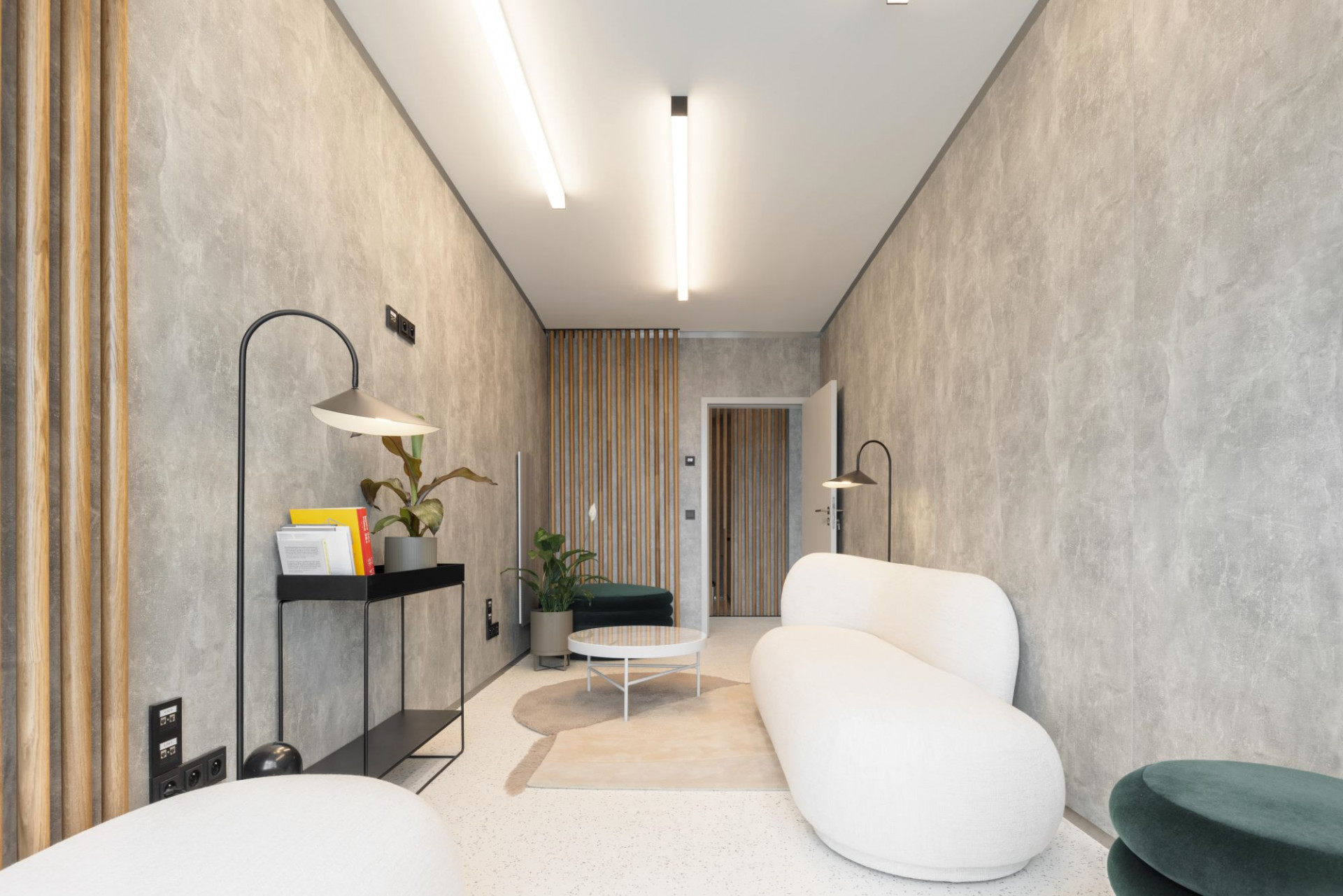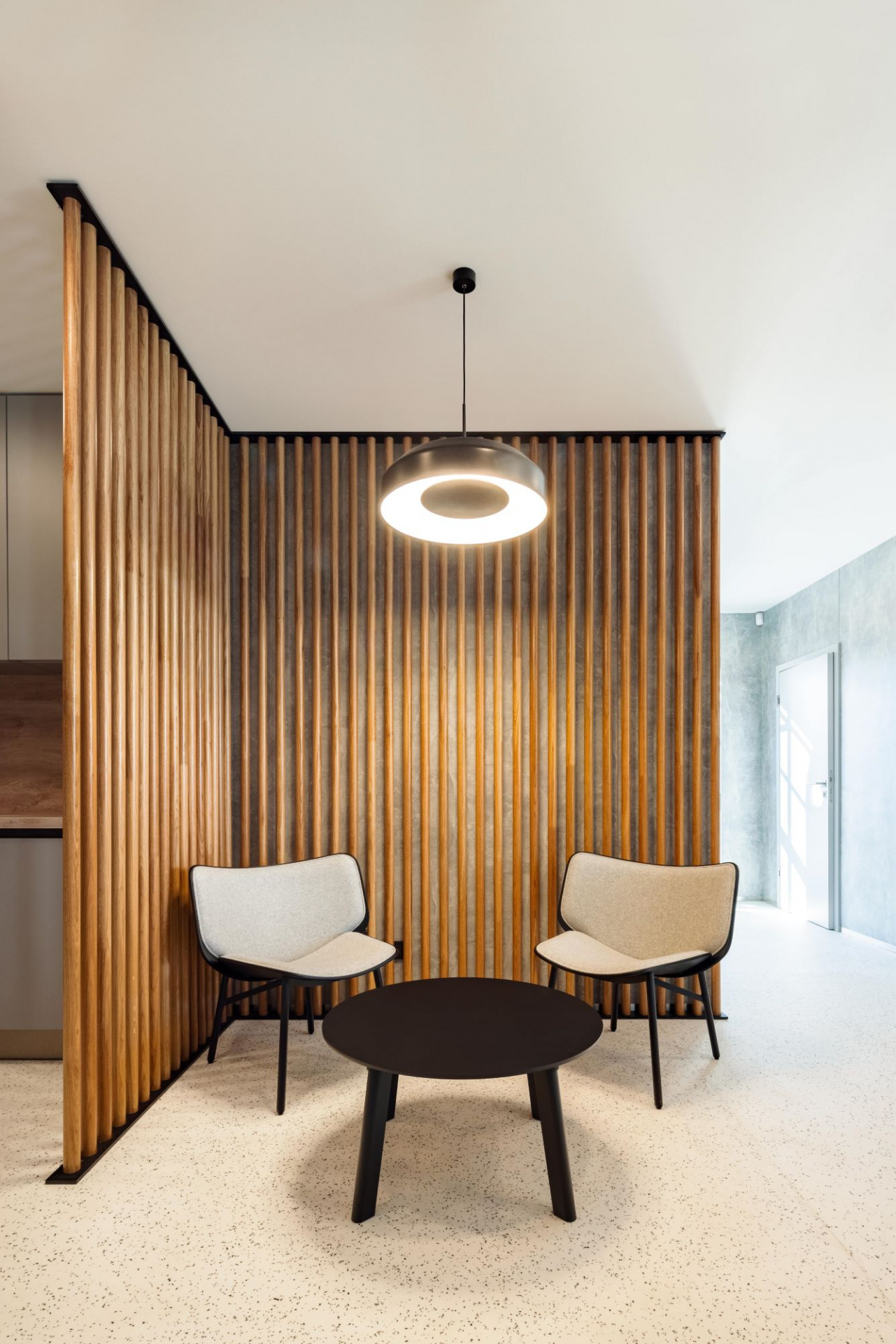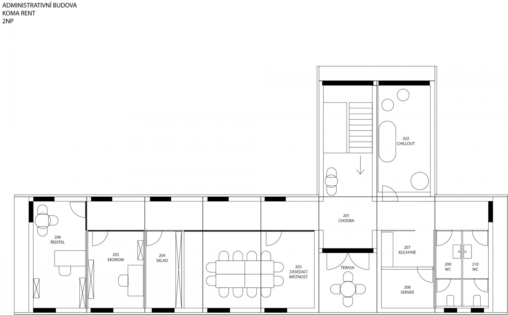Ve dvou podlažích budovy s bezbariérovým přístupem najdeme kanceláře včetně konferenční a zasedací místnosti a navíc i chill-out prostor pro odpočinek. K relaxaci slouží i menší terasa umístěná v horním patře, kam se dostaneme po vnitřním schodišti o šířce jednoho modulu.